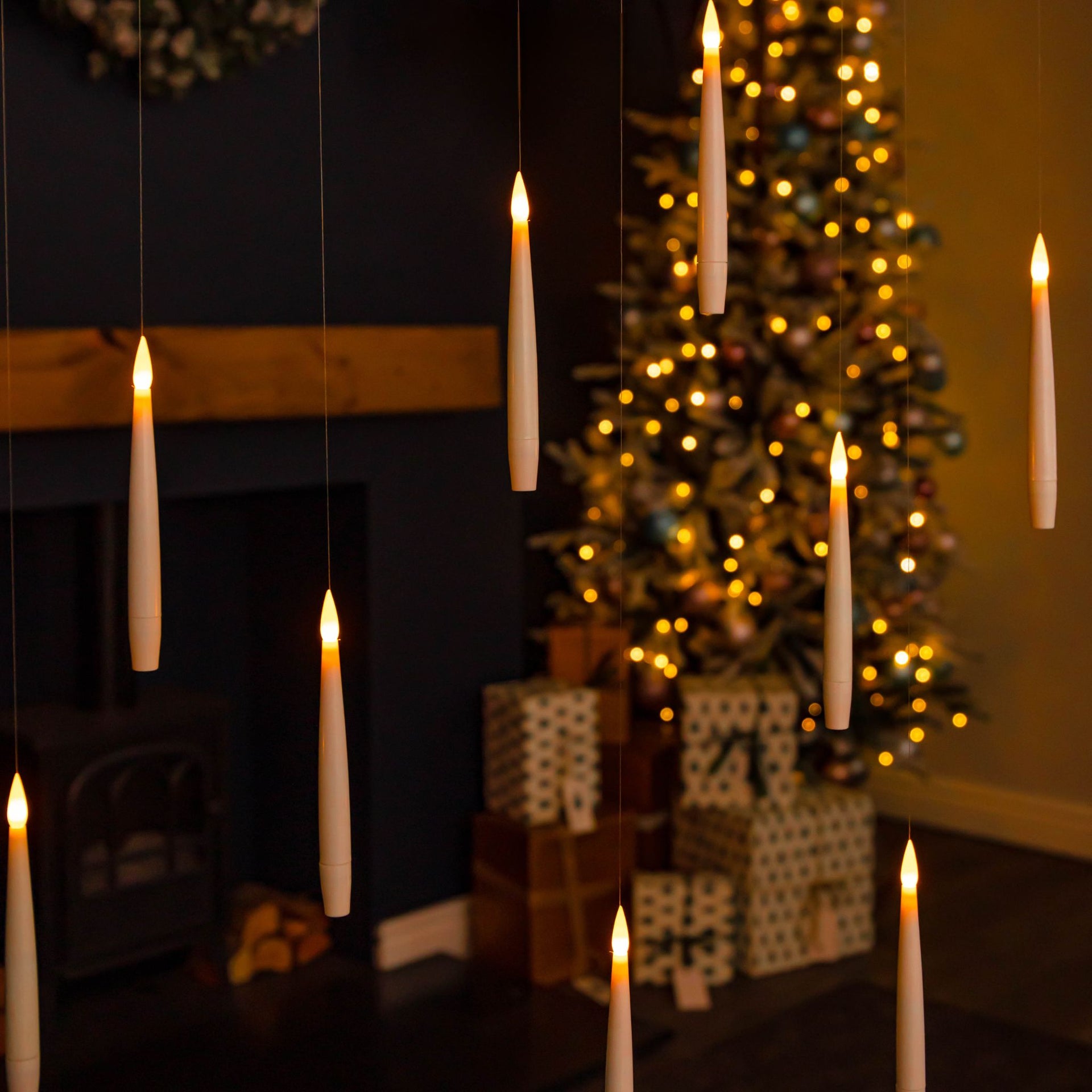 Illuminate your indoor space with this set of 10 White floating battery operated candles. Perfect for use indoors at Christmas, weddings and other events to create a safe, ambient glow. Each candle has a clear, discreet 1m string so these can be hung to give the illusion the candles are floating. Made from plastic, these candles are tapered with a length of 15cm inclusive of a 2.5cm plastic imitation flame which contains 1 warm white LED light with a 1cm base diameter. With a remote control to switch between static, flickering and ON/OFF there isn't any unsightly switches on any of the candles. Each candles requires 1 x AAA battery for the decoration to illuminate. Product Dimensions Length: 15cm Base Diameter: 1cm Remote Control included with a CR2025 battery.