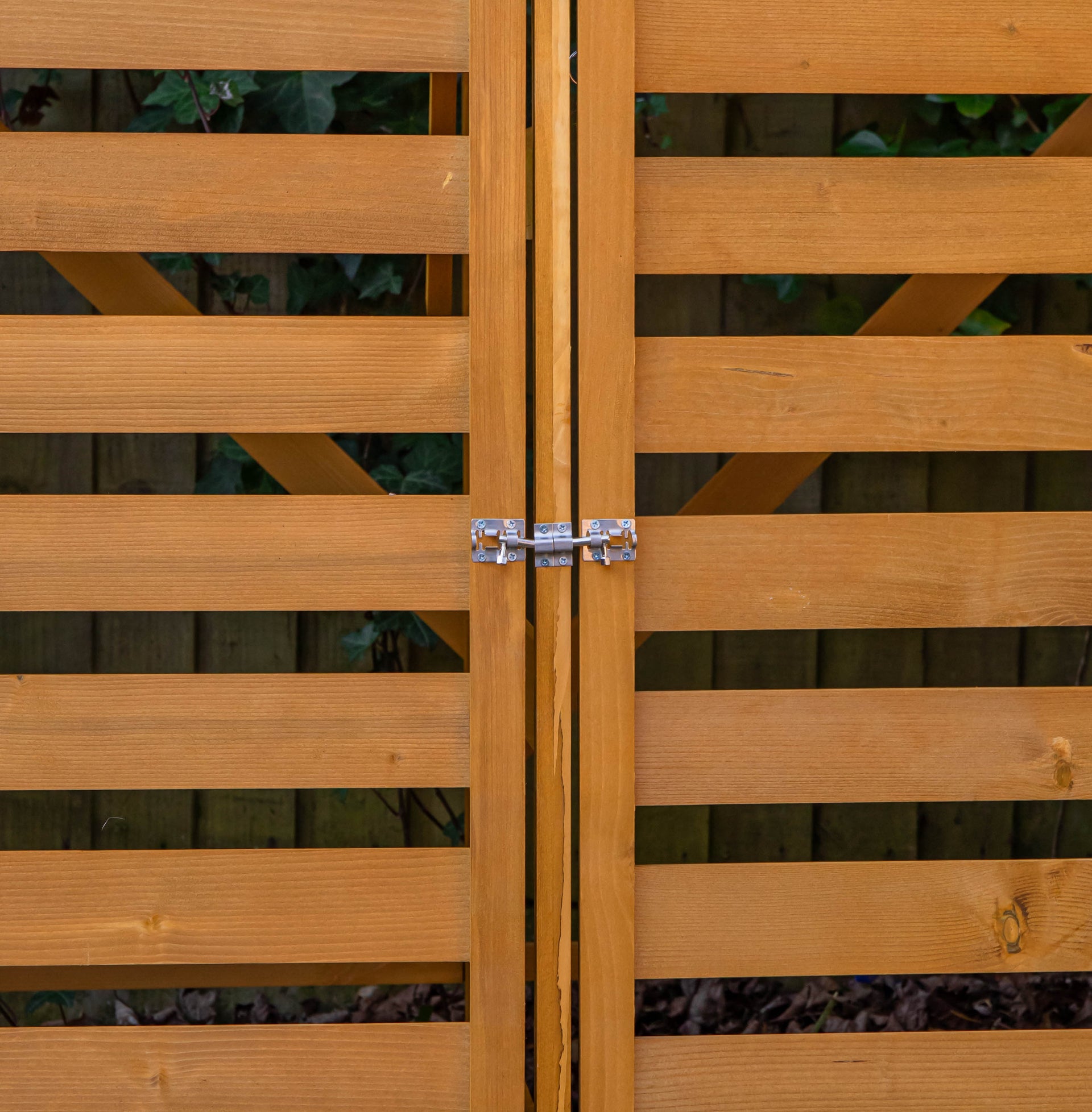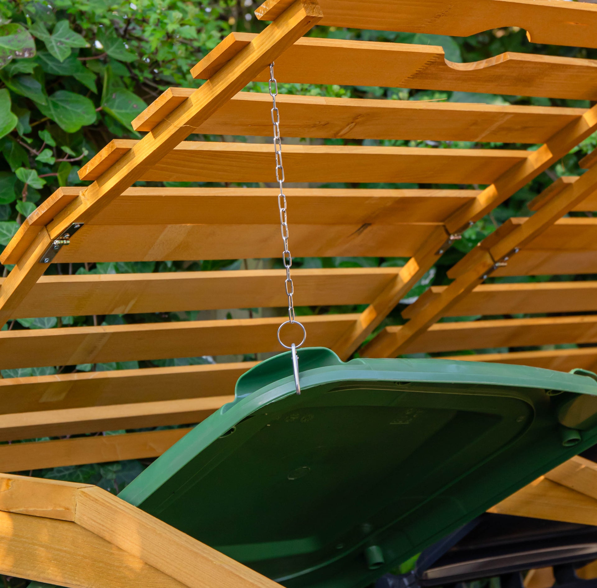 Featuring practical top hinged lids and side hinged front doors for easy access. Each top hinged lid includes a securing chain that can be attached to the bin lid allowing the lid off the bin to open when you lift the storage lid. The chain is attached by threading it through the handle of the bin lid and then attaching it to the store lid and can be easily removed when it's bin day.