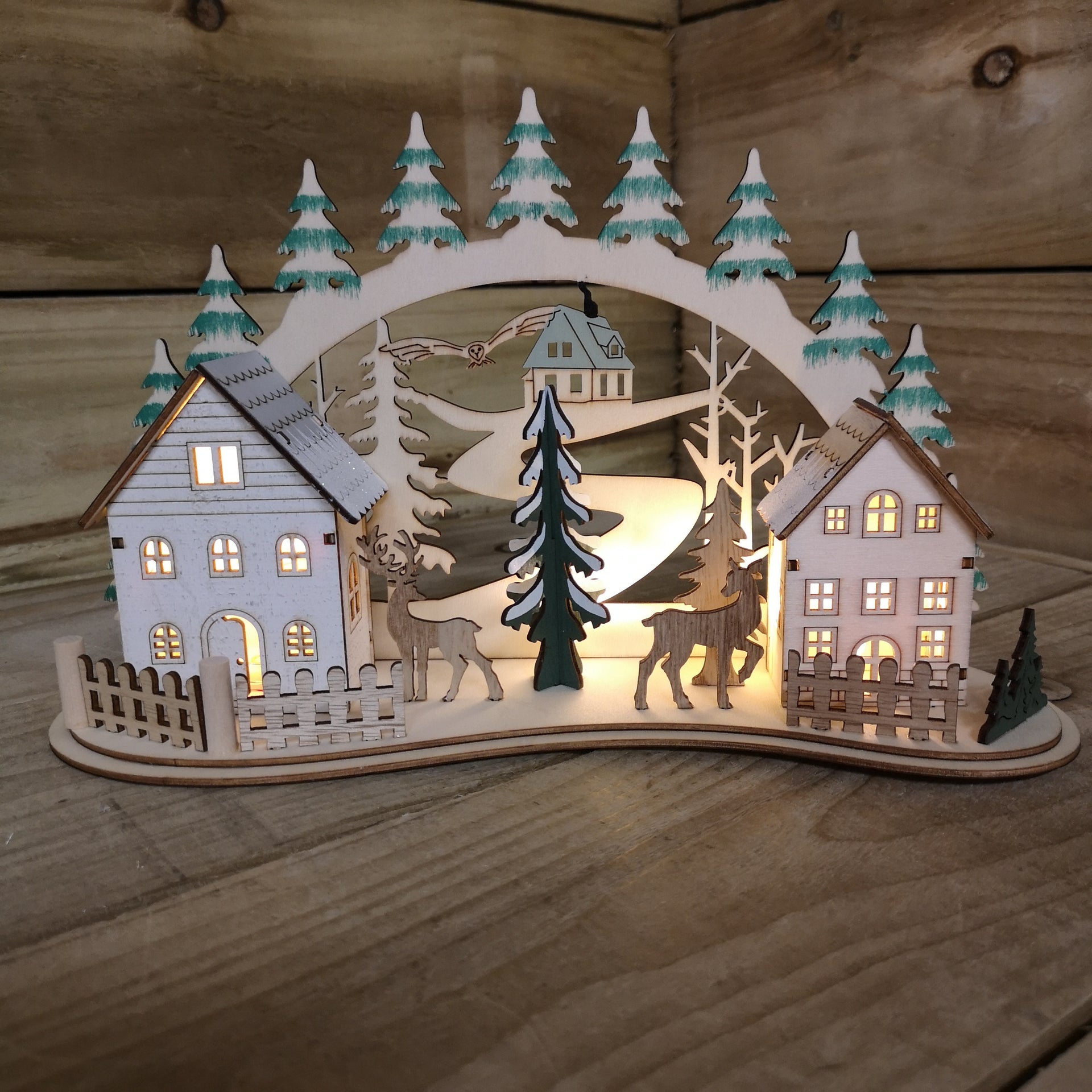 - A stunning display of a winter village with houses, trees and two Reindeers