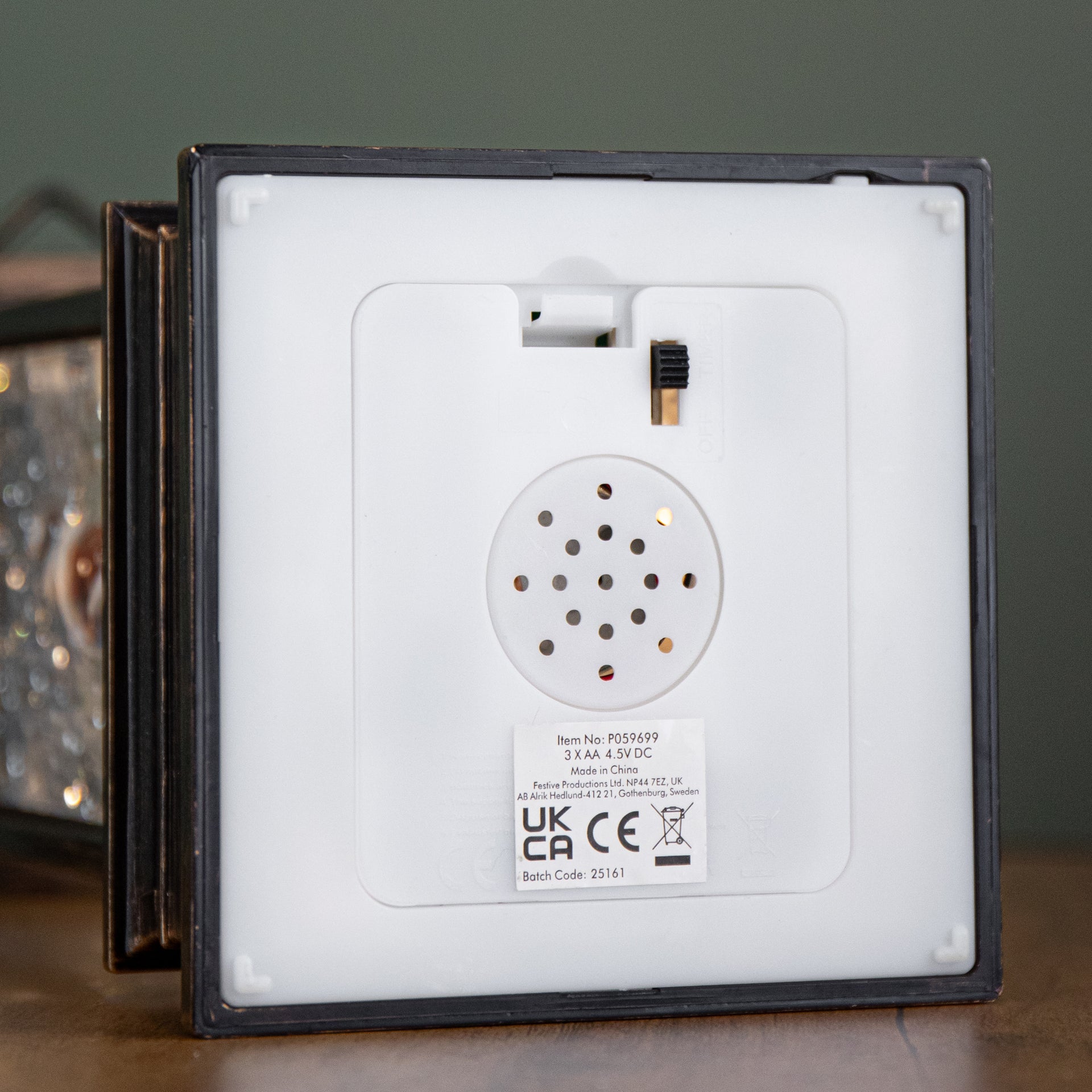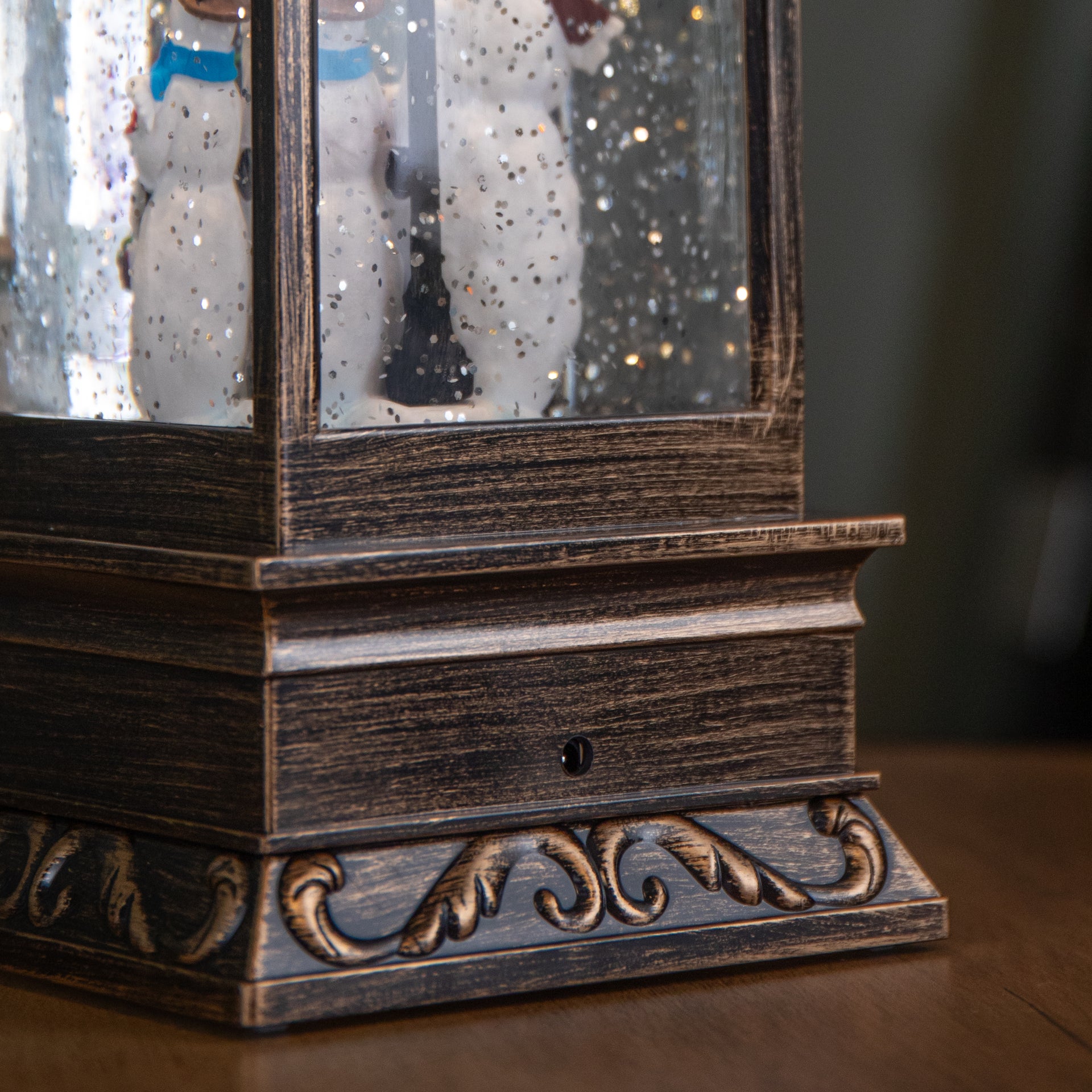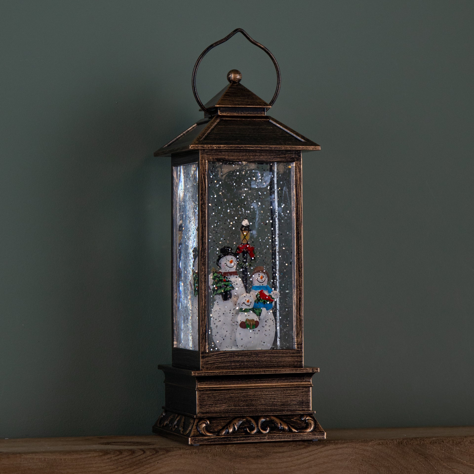 In the style of a bronze effect lantern, featuring a delightful Snowman scene inside, the water spinner is Illuminated by a warm white LED that softly glows highlighting the joyful snowmen and creating a cosy, festive ambience. The integrated water spinner mechanism keeps the glitter in motion, ensuring constant sparkle without the need for shaking. Powered by 3 x AA batteries (not included), it offers fuss free placement anywhere in your home. The black on/off switch, discreetly located on the underside, allows for easy operation while maintaining the decorations classic appearance. For added convenience, it features a built in 6 hour on / 18 hour off timer, allowing the decoration to automatically light up at the same time each day without manual switching.
