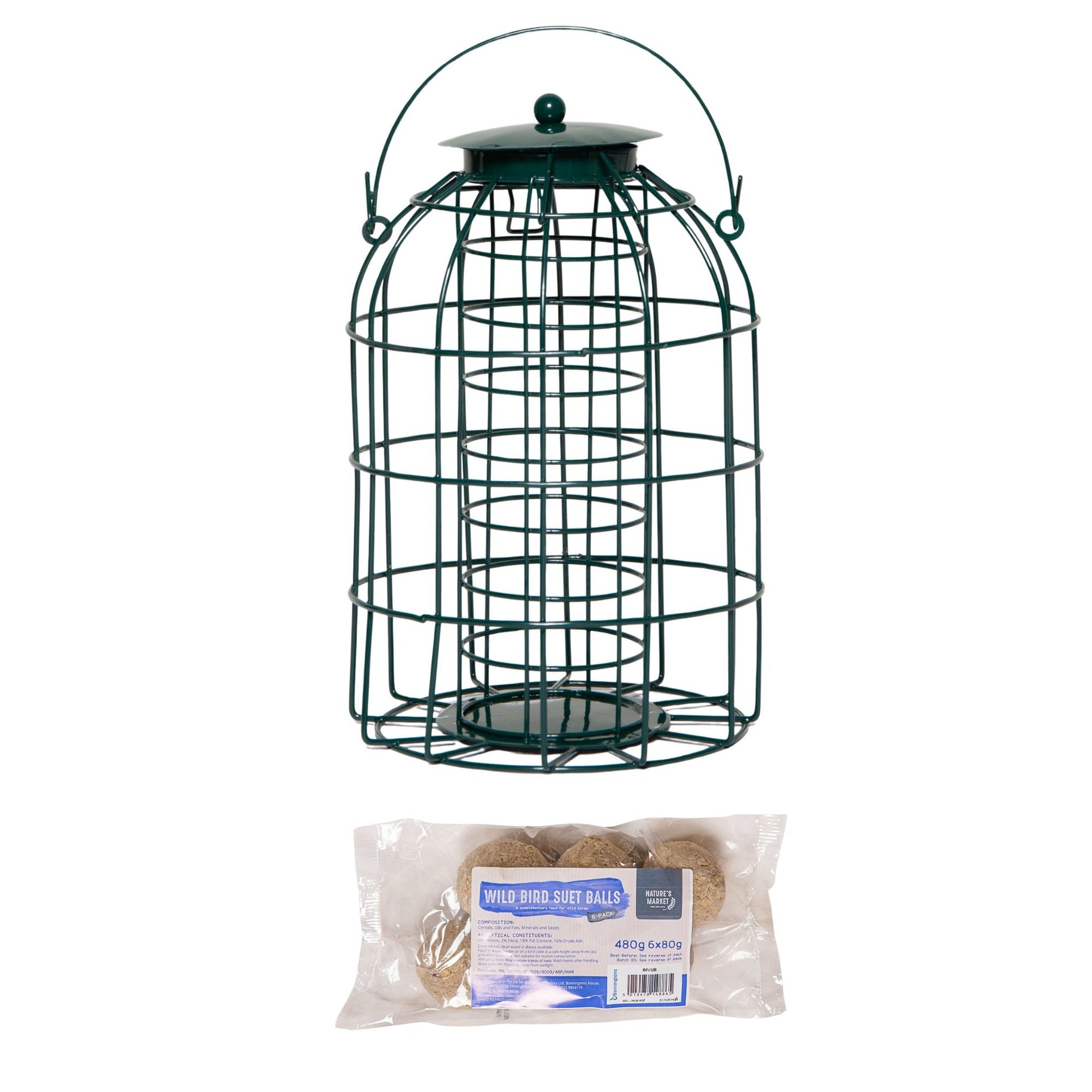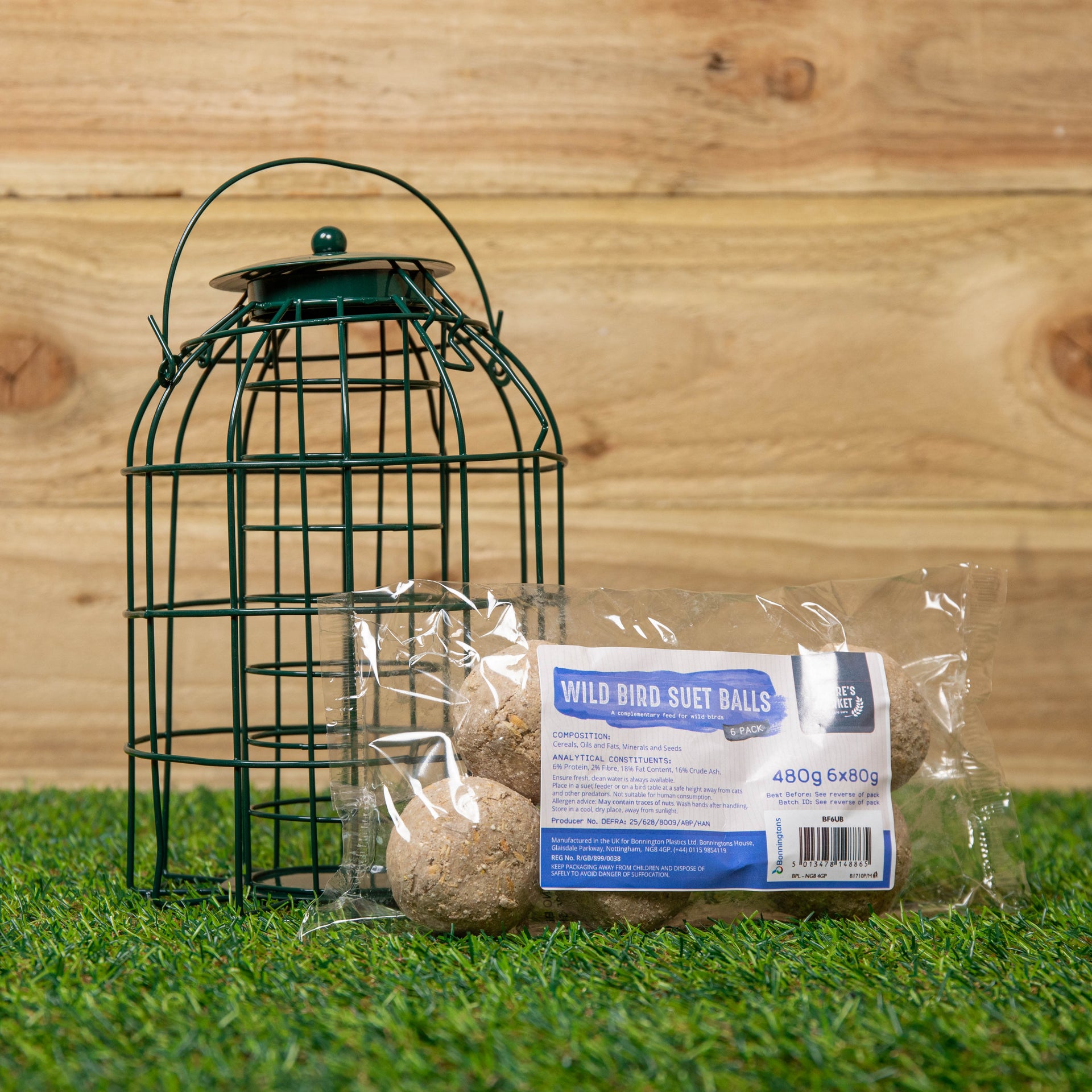 Create a tranquil paradise and attract a variety of wild birds into your garden this year with this fat ball feeder cage and a pack of suet fat balls. Birds spend most of their day foraging for food to meet their needs and their nestling needs. Bird feeders are an easy food source giving them a stable source of nutrition. Having a reliable source of food and a safe place to eat is especially important at times of the year when food is harder to come by when competition is high. This bird feeder is perfect for holding suet fat balls, kitchen leftovers and even fruits. Made with a powder coated metal mesh construction with a guard to deter squirrels and to allow the birds safely and happily feed.