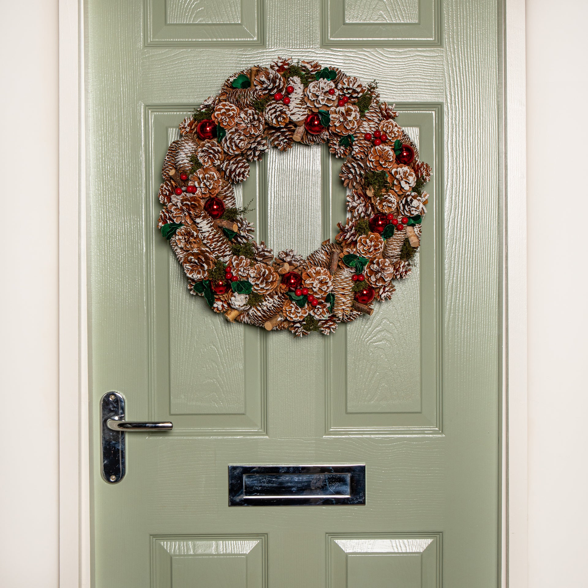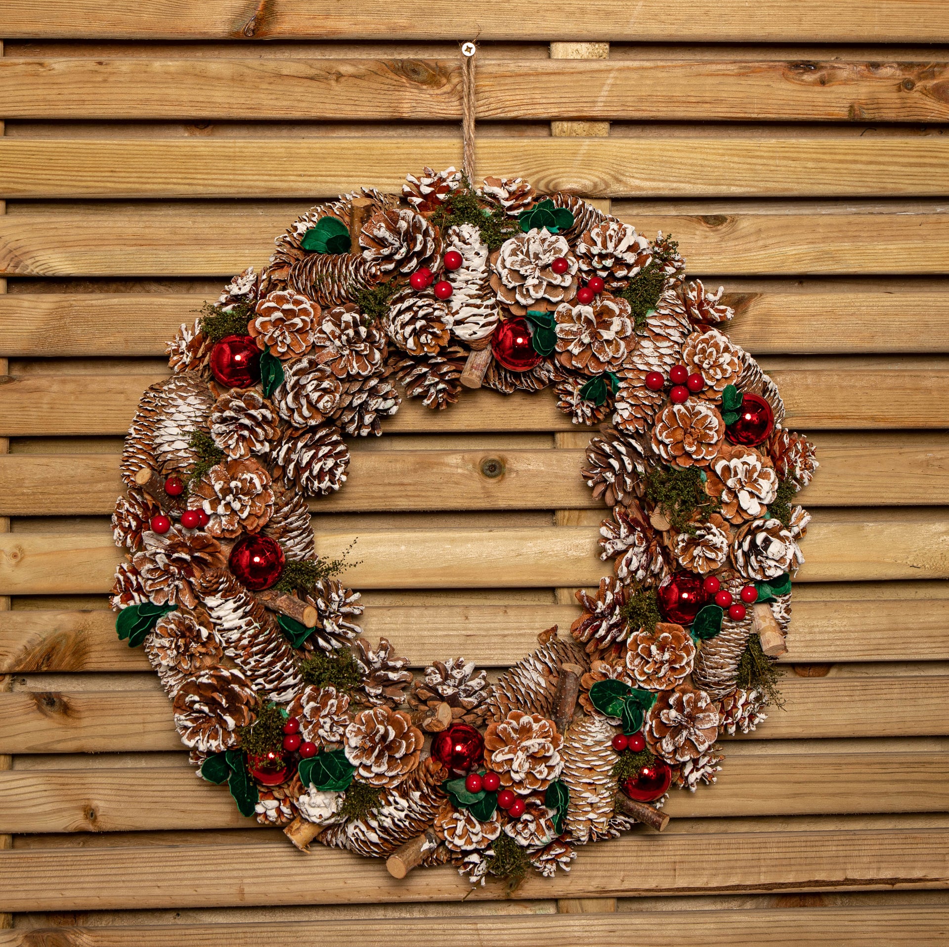50cm Hanging Christmas YuleFest Wreath with Red Baubles & Snow Tipped Pine Cones