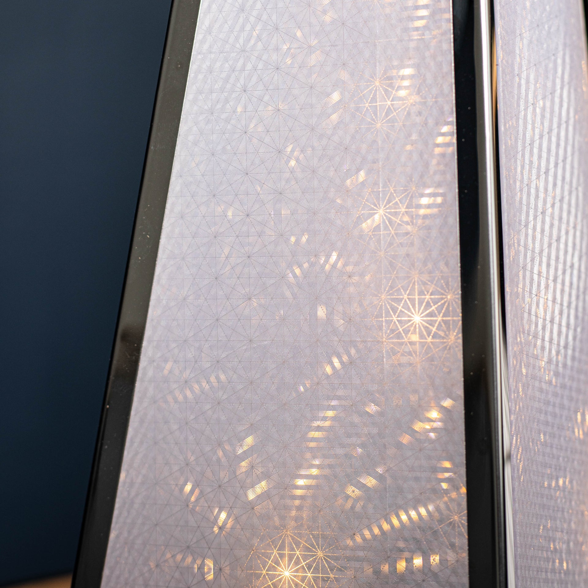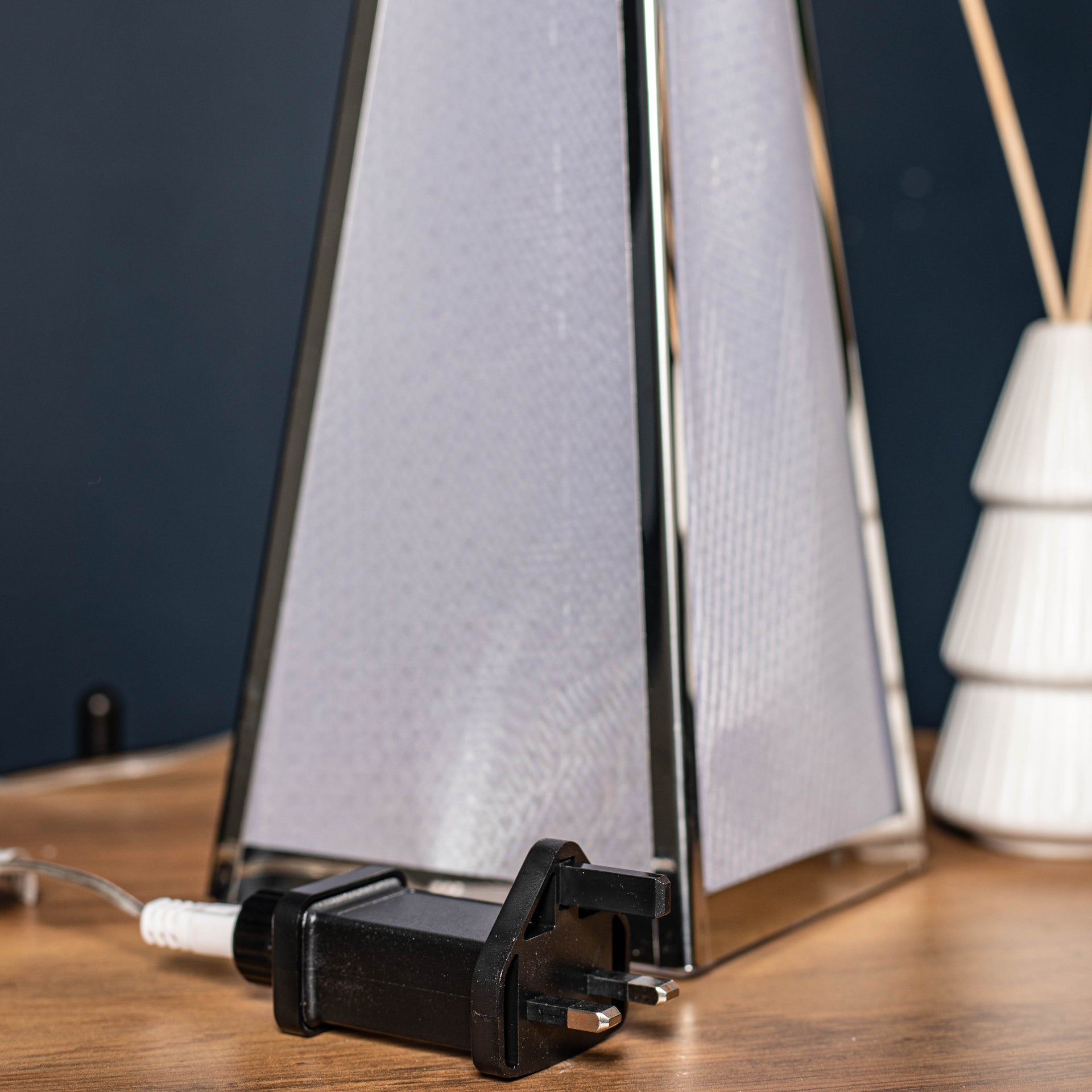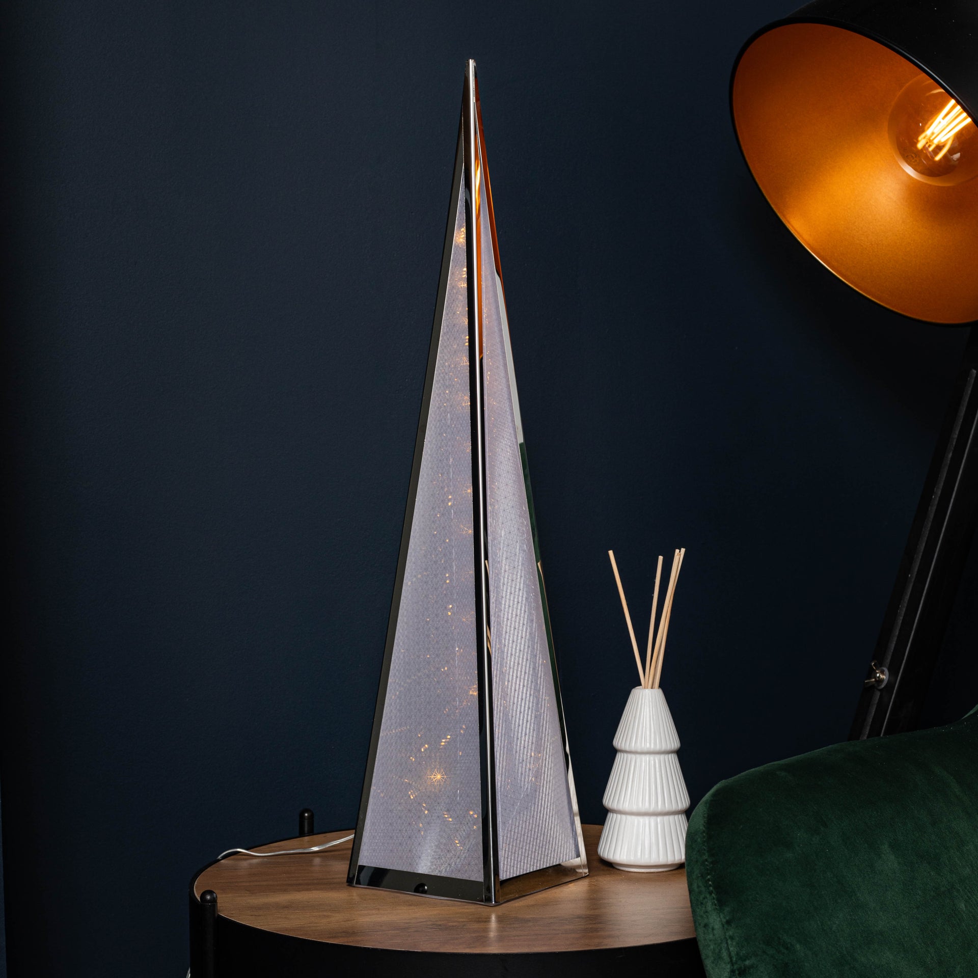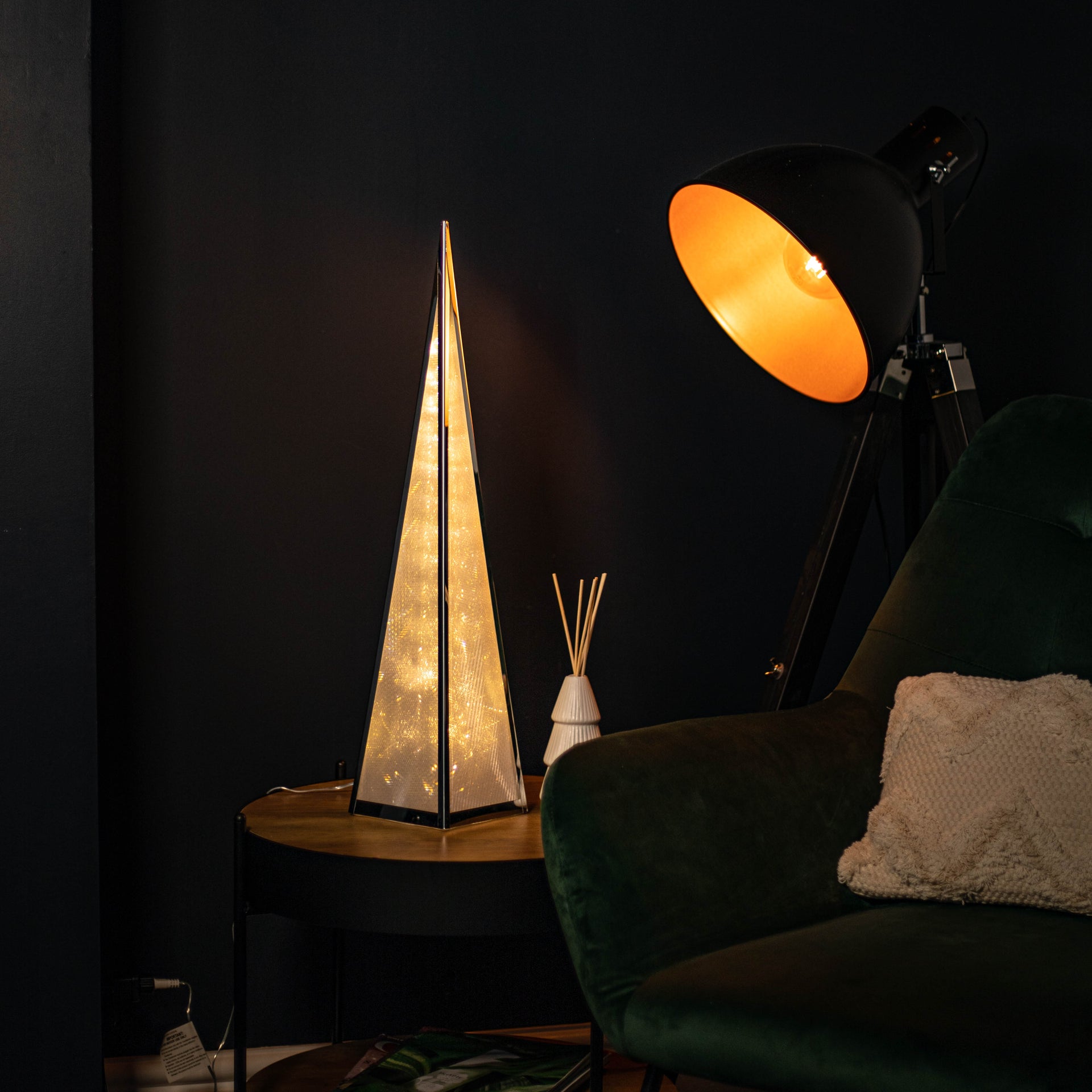 Illuminate your home this Christmas with this mesmerising holographic pyramid. Featuring a silver polished metal frame with foil panel windows with LEDs, this decorations brings stunning projections of snowflake style patterns with warm white LEDs adding that magical feeling Christmas to your home. Featuring 16 warm white LEDs, this pyramid decoration is ideal to be placed on most flat surfaces whether you place it on the fireplace, on a table top or to create a dazzling window display this decoration is sure to capture attention. The pyramid stands tall at 60cm with a sturdy wide base and is mains operated with a generous 5 meter clear cable from product to plug. Suitable for indoor use only. Product Dimensions Height: 60cm and 13cm Wide (at the base).