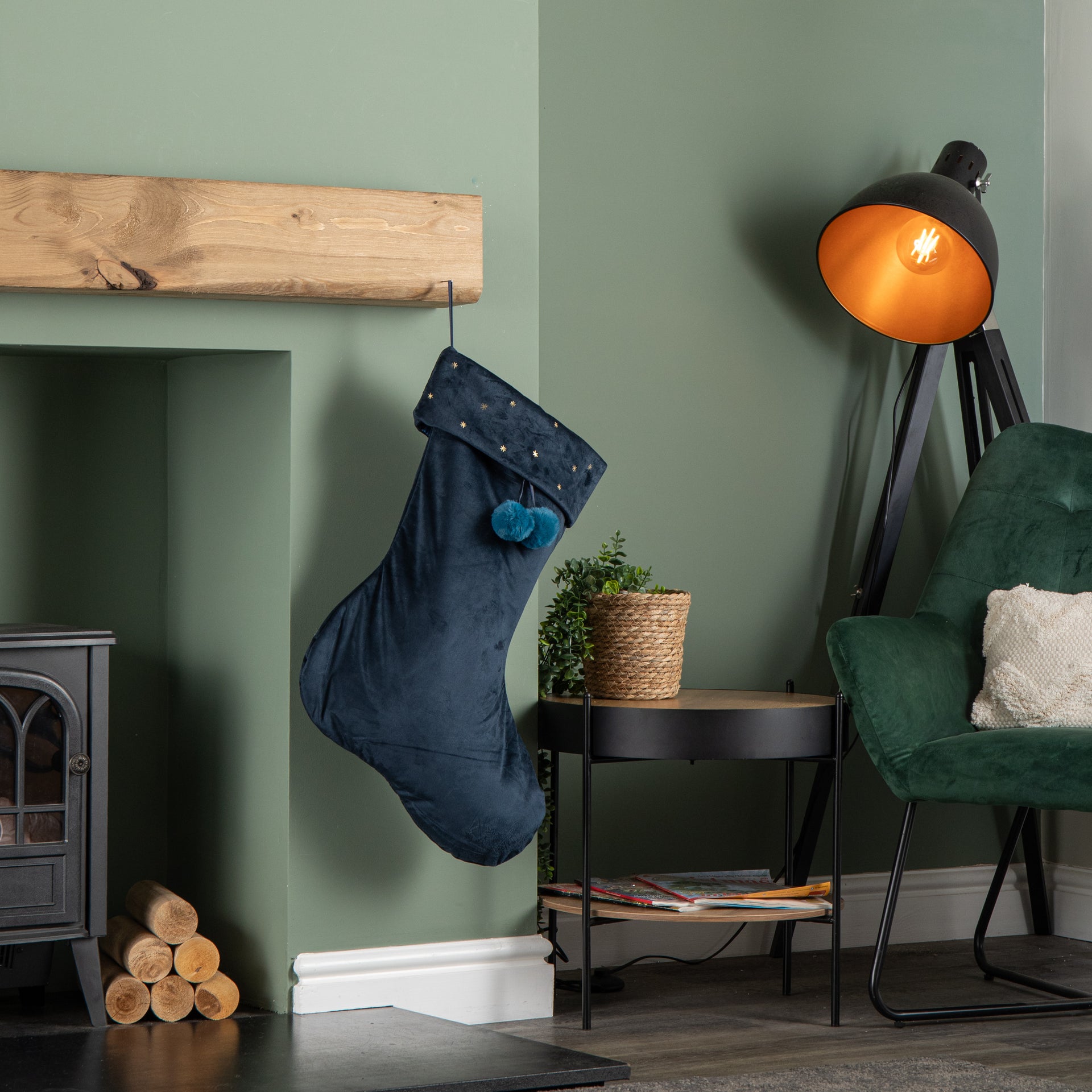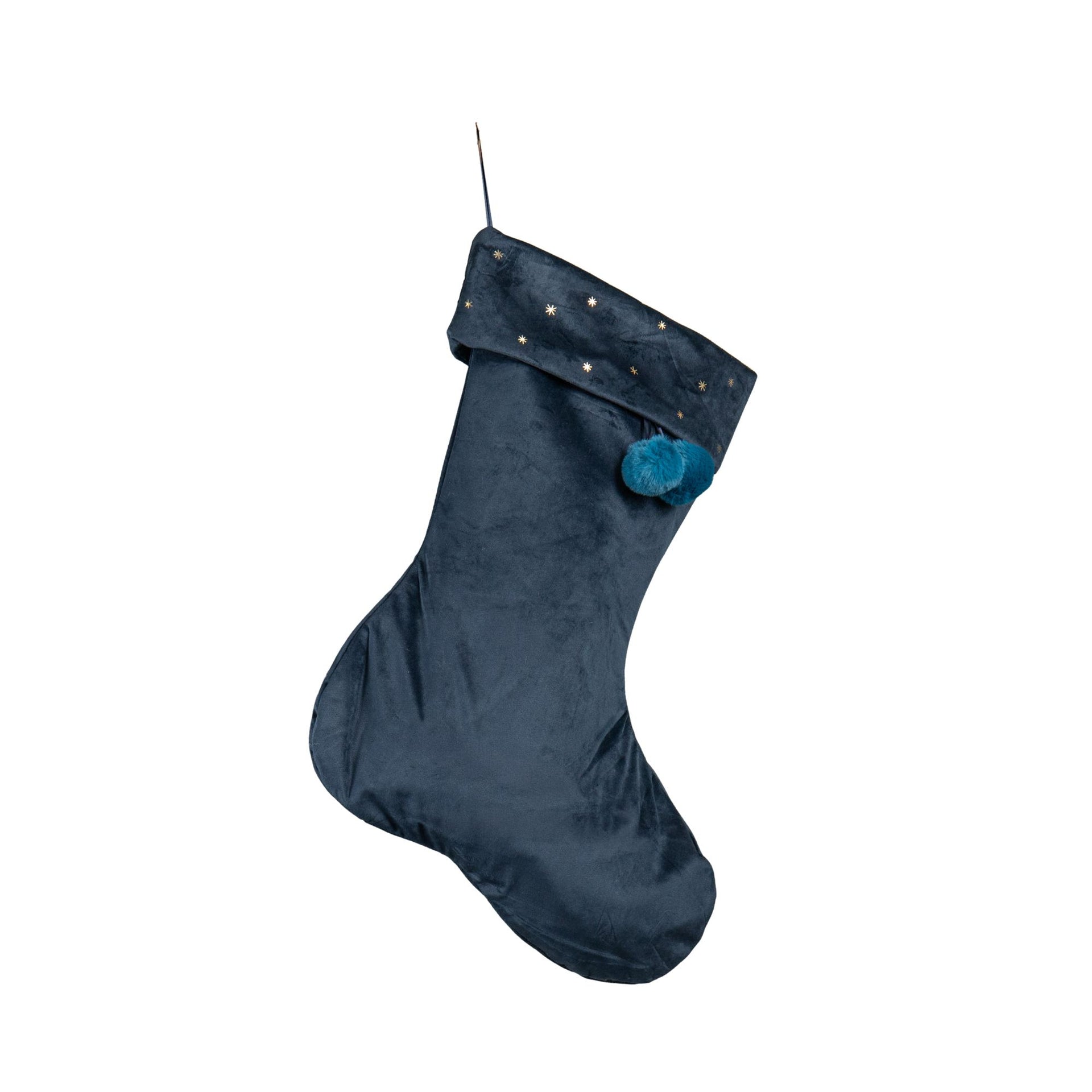 70cm Hanging Dark Blue Velour Star Print Christmas Stocking with Pom Poms