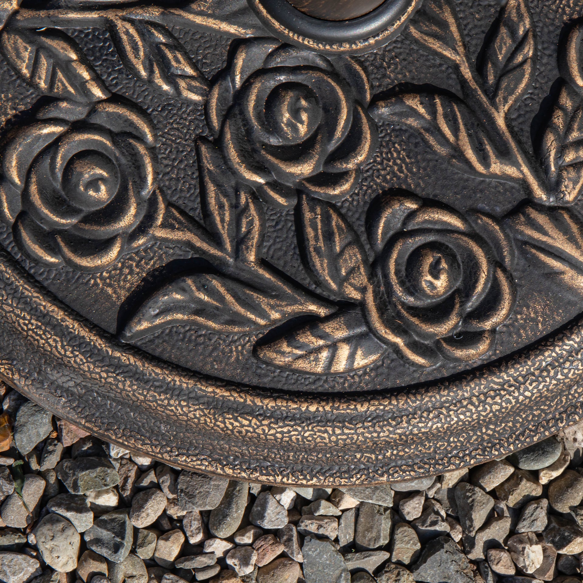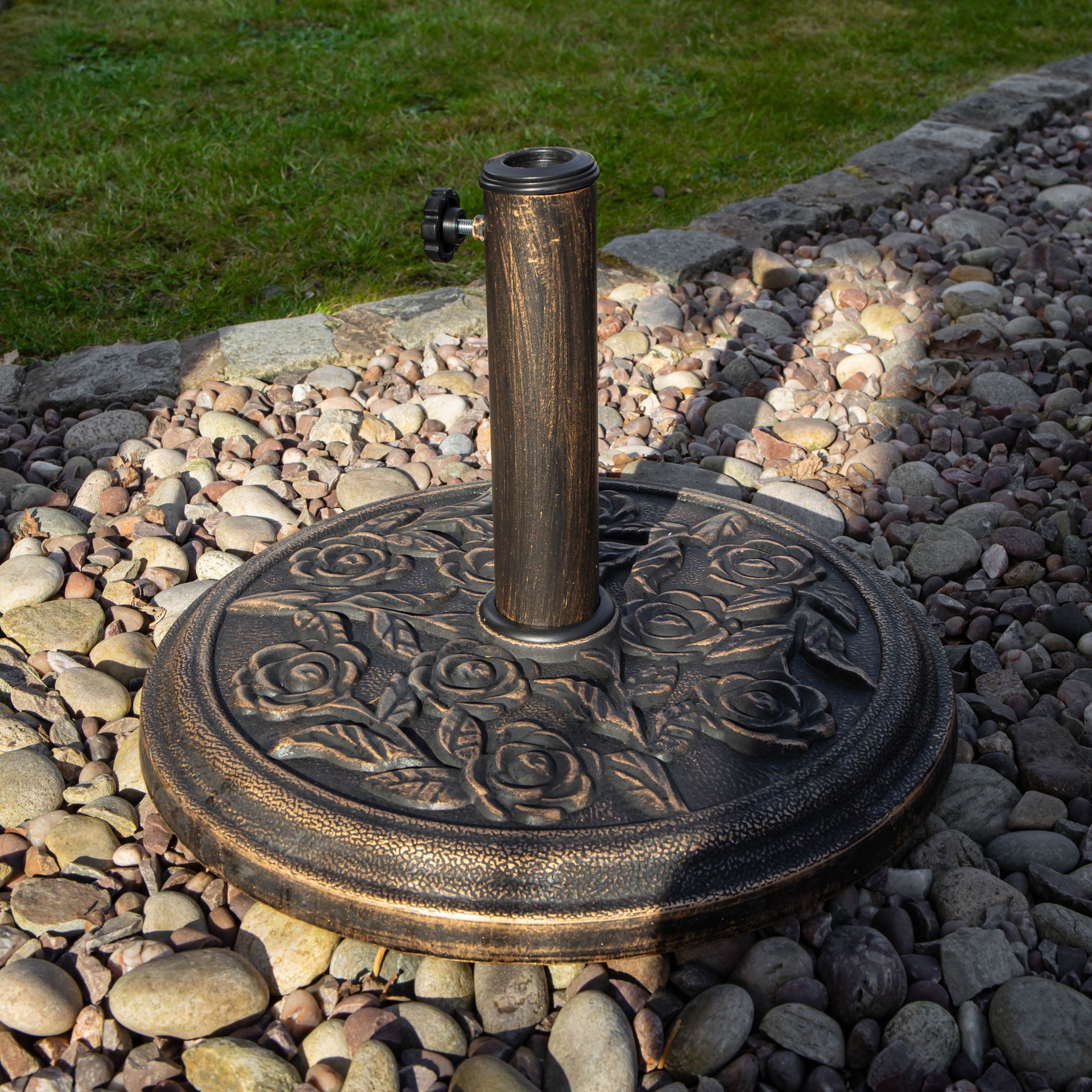 Made with strong resin materials, the base is crafted to hold your parasol firmly in place, this 9kg base provides excellent support in light to moderate breezes, helping to prevent tipping and wobbling during everyday use. With a timeless floral rose design and a cast iron effect, the base adds a touch of vintage elegance to your outdoor space. Perfect for any garden furniture, the base creates an eye-catching addition to any outdoor space, garden or patio.