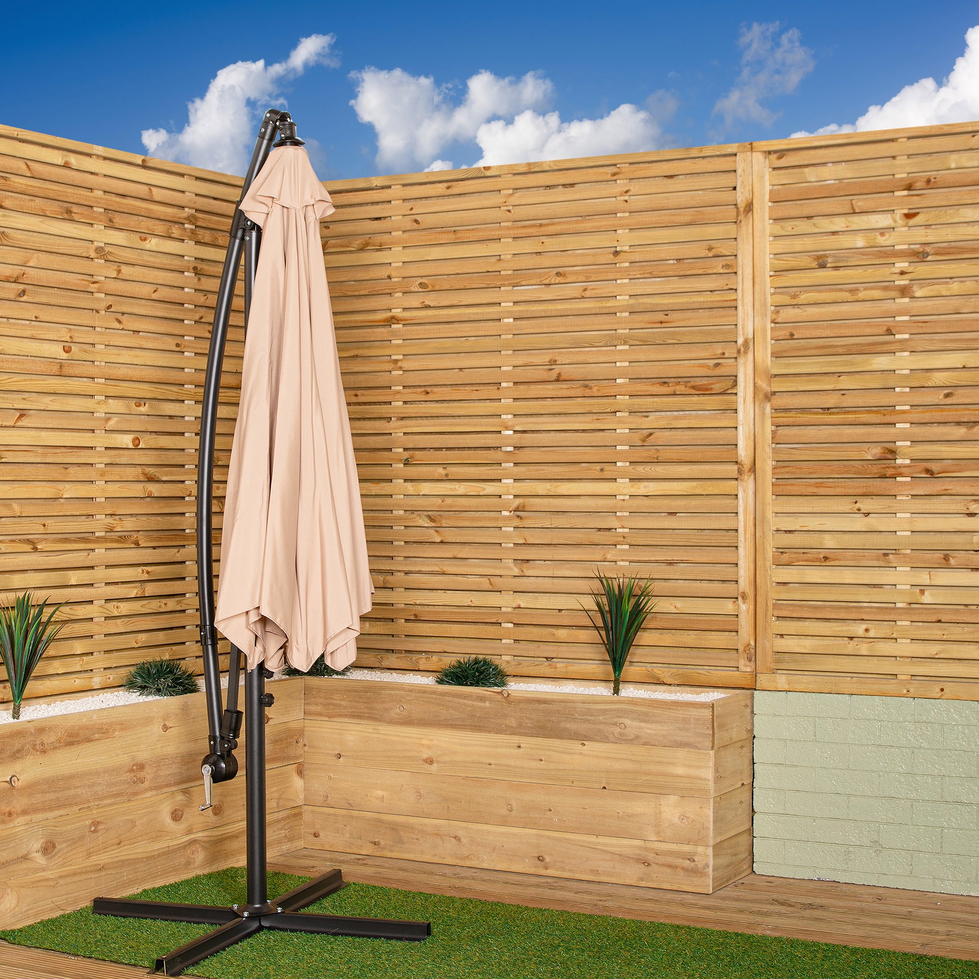 The Beige 3m Cantilever Parasol also prioritizes your safety and comfort. Its UV protection umbrella canopy shields you from harmful sun rays, providing a safe and enjoyable outdoor experience. Relax in the shade and create a cosy seating area for family and friends, knowing that you're protected from the elements. Please note that this parasol does not include a parasol base. To ensure stability, we recommend using a parasol base weighing at least 25kg. Various options are available, such as cantilever parasol base weights or gazebo weights set of 4 heavy-duty, giving you the freedom to choose the ideal base for your needs.