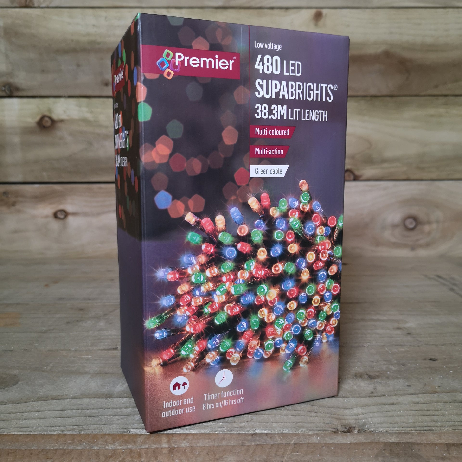 - 480 LED 38.3m Premier SupaBrights Indoor Outdoor Christmas Multi Function Mains Operated String Lights with Timer in Multicoloured