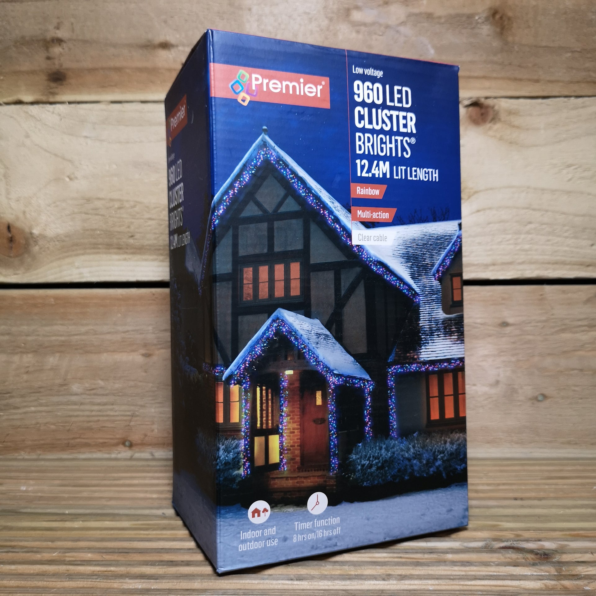 - 960 LED 12m Premier Cluster Indoor Outdoor Multi Function Mains Operated Christmas Lights with Timer on Clear Cable in Rainbow