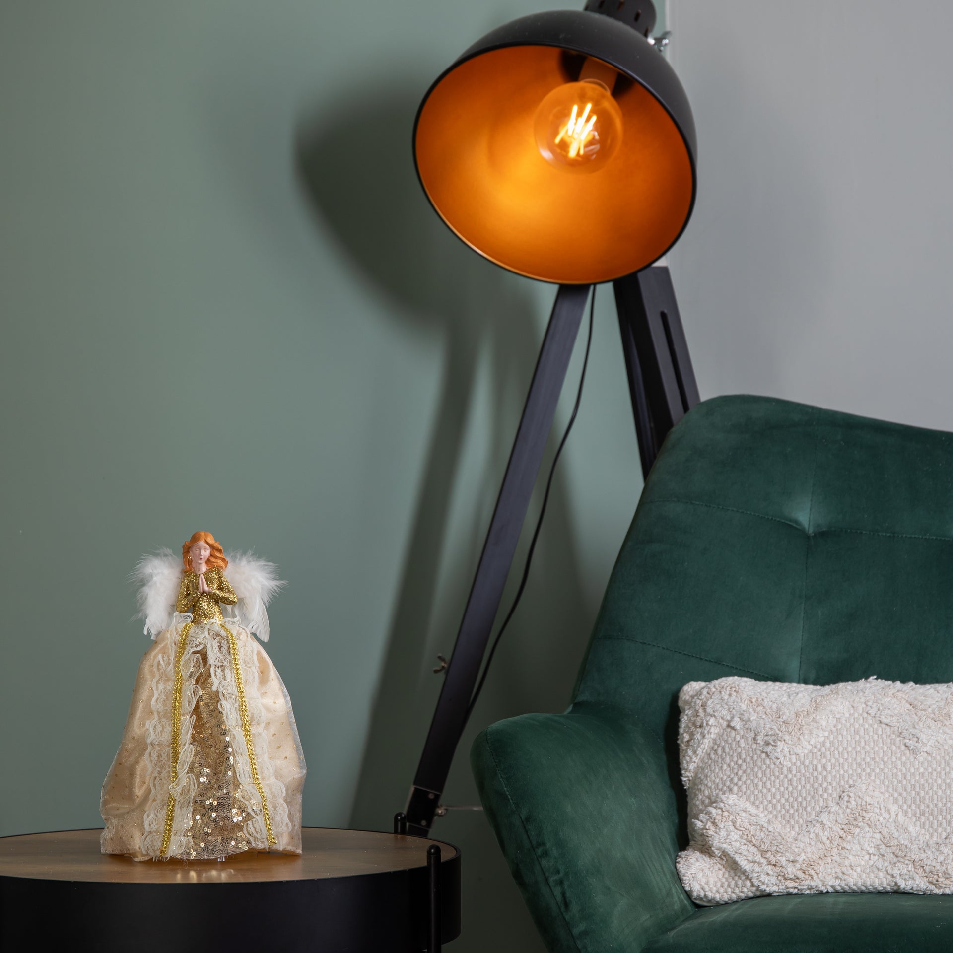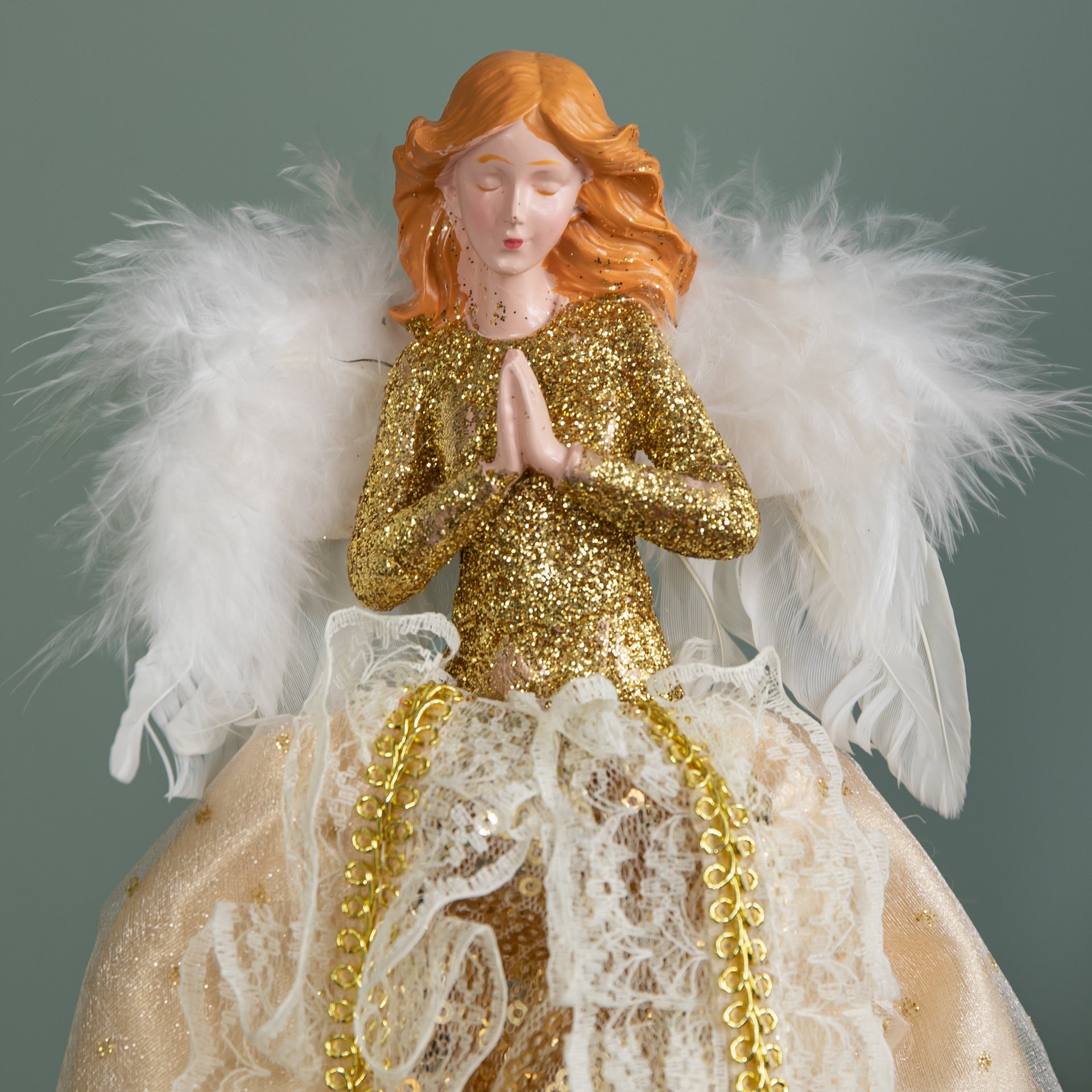 Designed to sit securely on top of your Christmas tree, this versatile decoration can also be used as a free standing ornament on a mantelpiece, sideboard or windowsill. The angel features an exquisitely detailed gold dress with delicate textures and shimmering accents, complemented by soft feathered wings.