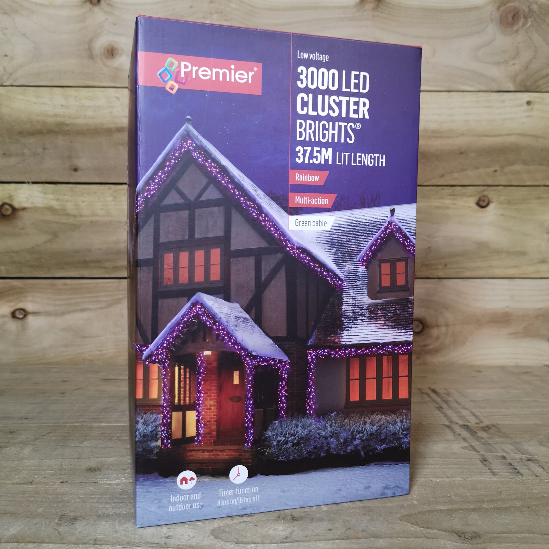 - 3000 LED 37.2m Premier Clusterbrights Indoor Outdoor Multifunction Mains Operated Christmas Cluster Lights with Timer in Rainbow