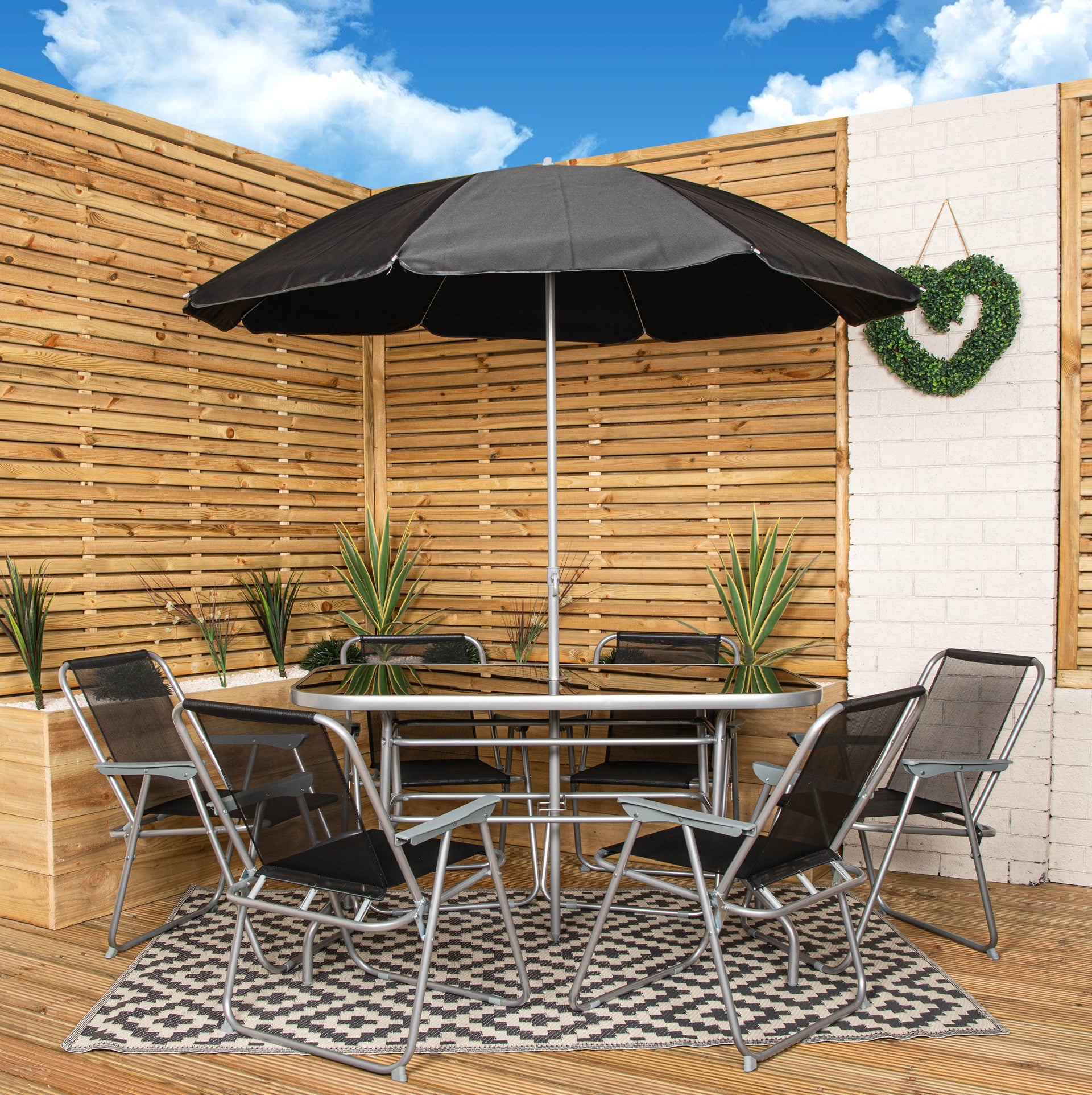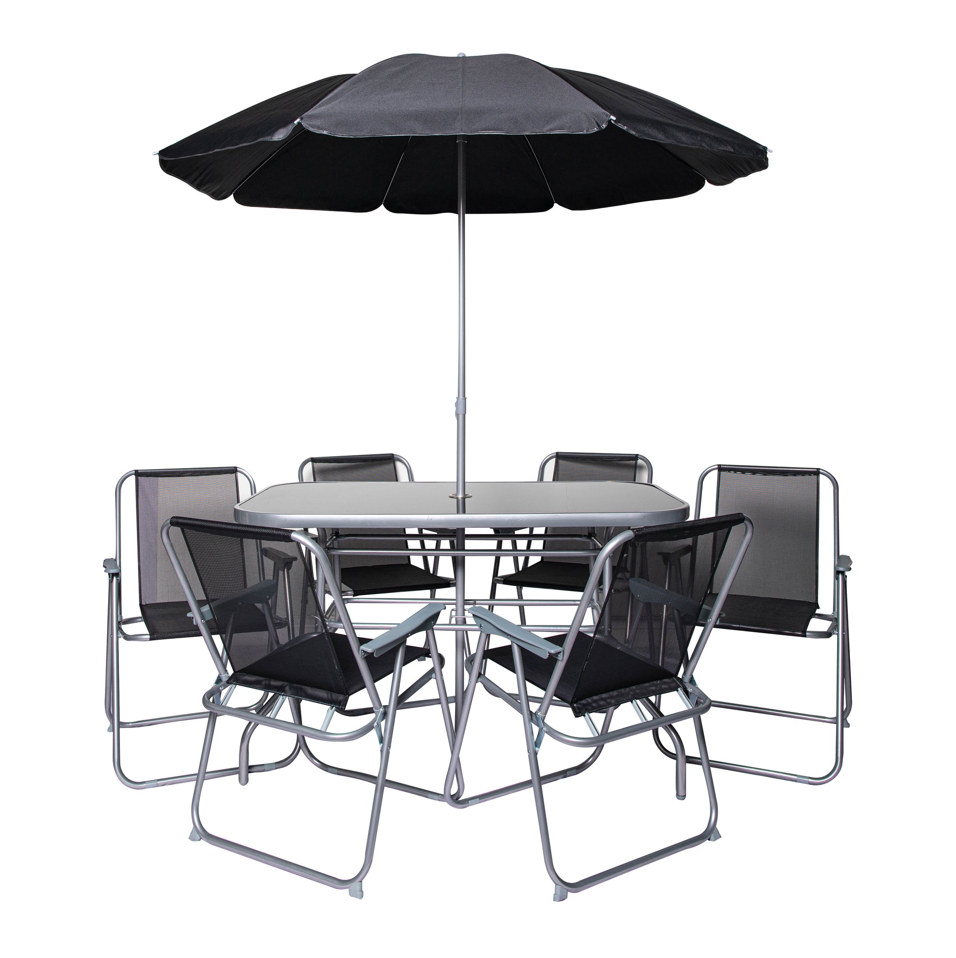 Enjoy the outdoors in style with the Samuel Alexander 6 Seater Garden Table And Chairs Set. This elegant outdoor furniture set includes a rectangular, black glass-topped table, six comfortable foldable chairs, and a black parasol umbrella to provide shade on sunny days. Perfect for garden parties, family meals, and outdoor gatherings, this patio furniture set is a must-have for any homeowner who loves to entertain guests.