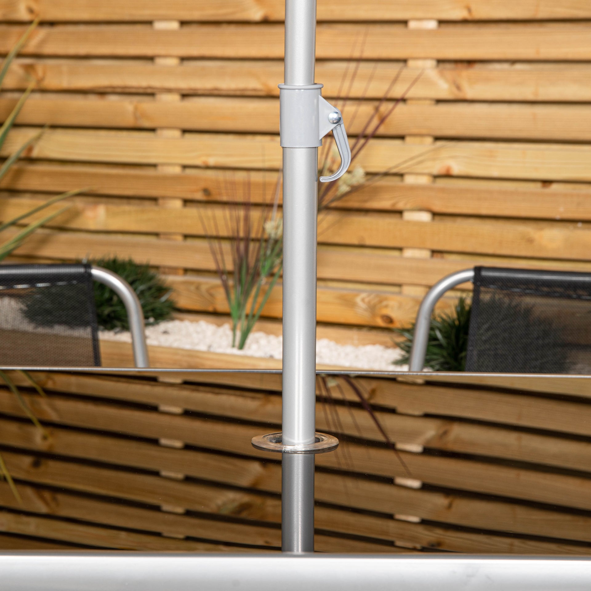 Product Dimensions Table Top Length: 120cm Table Top Depth: 70cm Table Height from ground: 70cm Parasol hole Diameter: 5cm Chair Width including arms: 52cm Chair Width without arms: 42cm Seat Height: 37cm Seat Depth: 37cm Backrest Height: 41cm Total Height: 78cm Folded Flat Height: 67cm Width: 51cm.