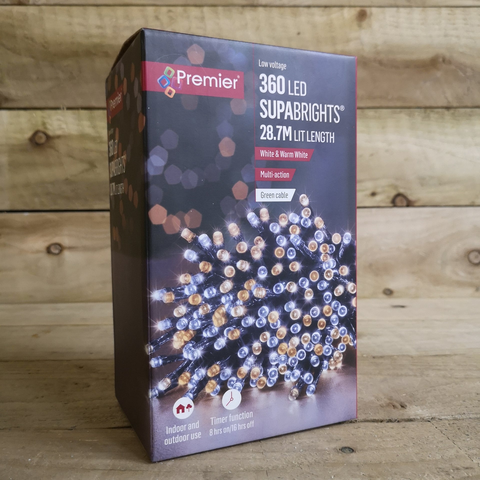 - 360 LED 28.7m Premier SupaBrights Indoor Outdoor Christmas Multi Function Mains Operated String Lights with Timer in Warm & Cool White