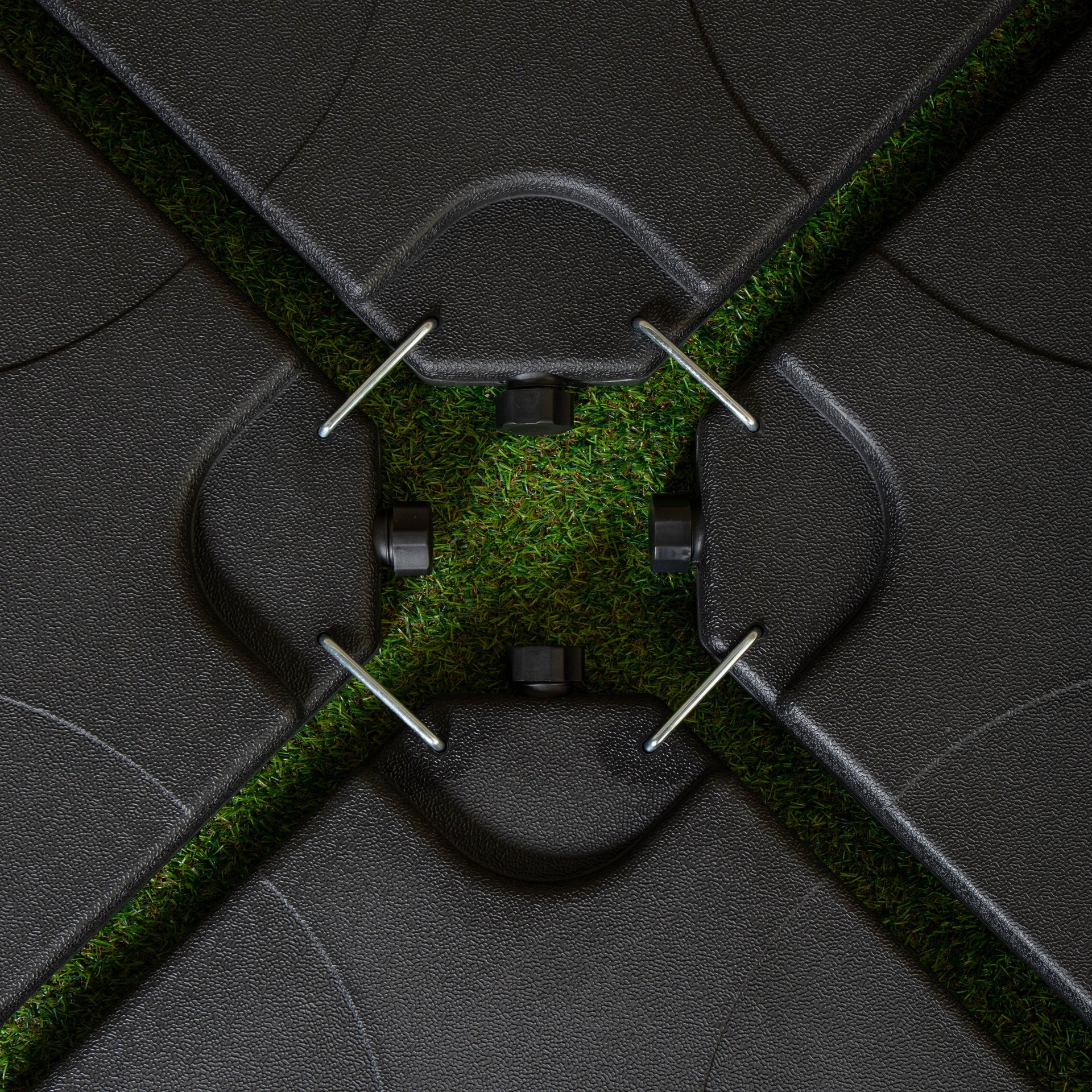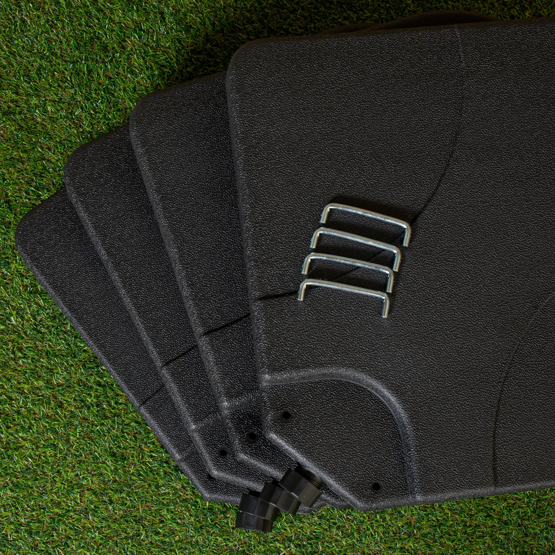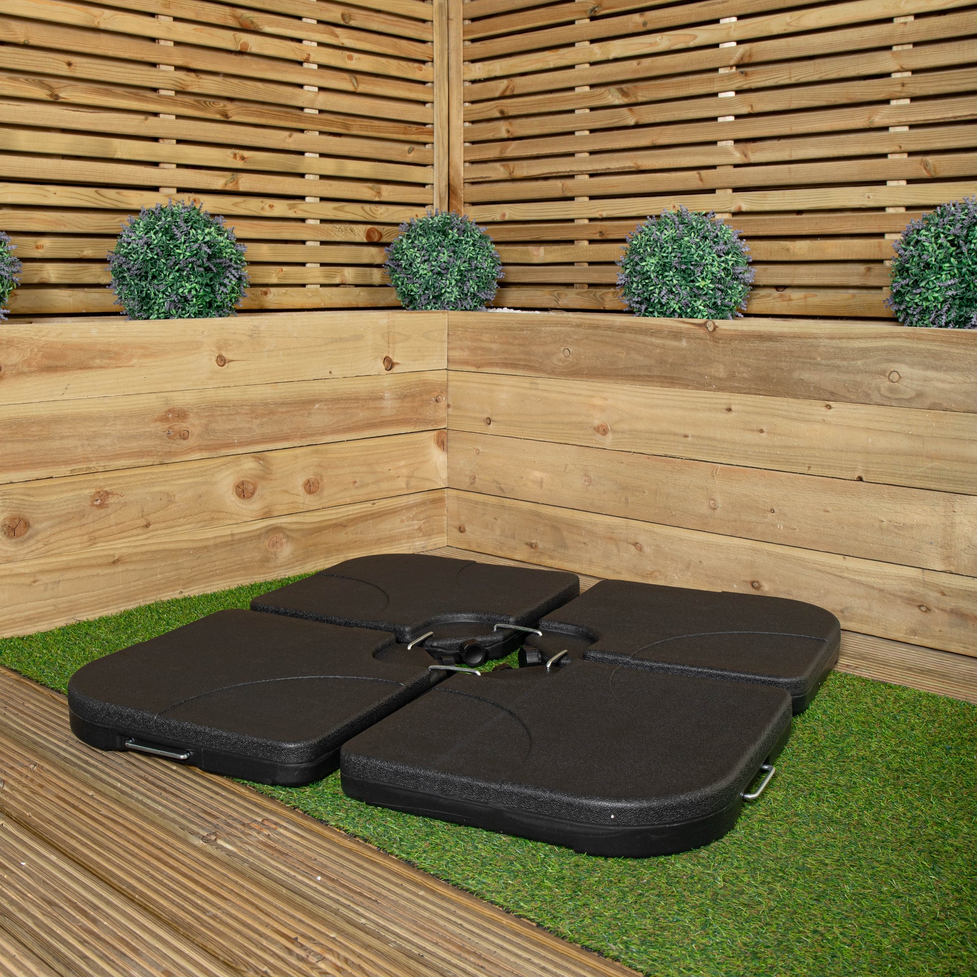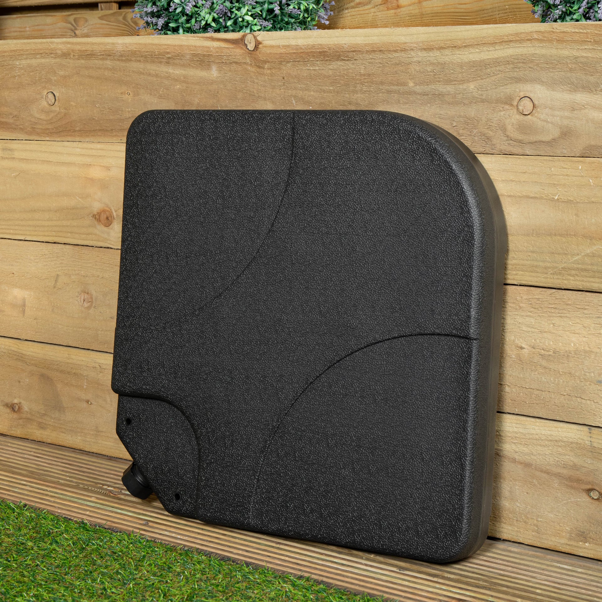 Keeping the shade out of your face on those summer days can be tricky sometimes. Our heavy duty cantilever parasol base is perfect for any parasol, gazebo, or even a washing line post that may need weighing down. Sometimes a tiny weight is not enough to keep a canopy outdoor/hanging parasol in place during the strongest winds of the year. Filling and emptying the parasol bases from the heavy duty caps is easy - just get your sand or water and start pouring. Protect yourself and your patio canopy, balcony and outdoor space from the strong UV rays that can discolour and damage some garden furniture. You can secure the weighted set square parasol base with the included metal clips if your parasol or outdoor umbrella supports the configuration. The heavy duty parasol base can be emptied when required and stored away for the best results and offering a long-lasting parasol base. The black resin plastic is UV resilient, heavy and perfect to keep your furniture safe during some unpredictable weather throughout the year. The metal clips are not required and are optional.