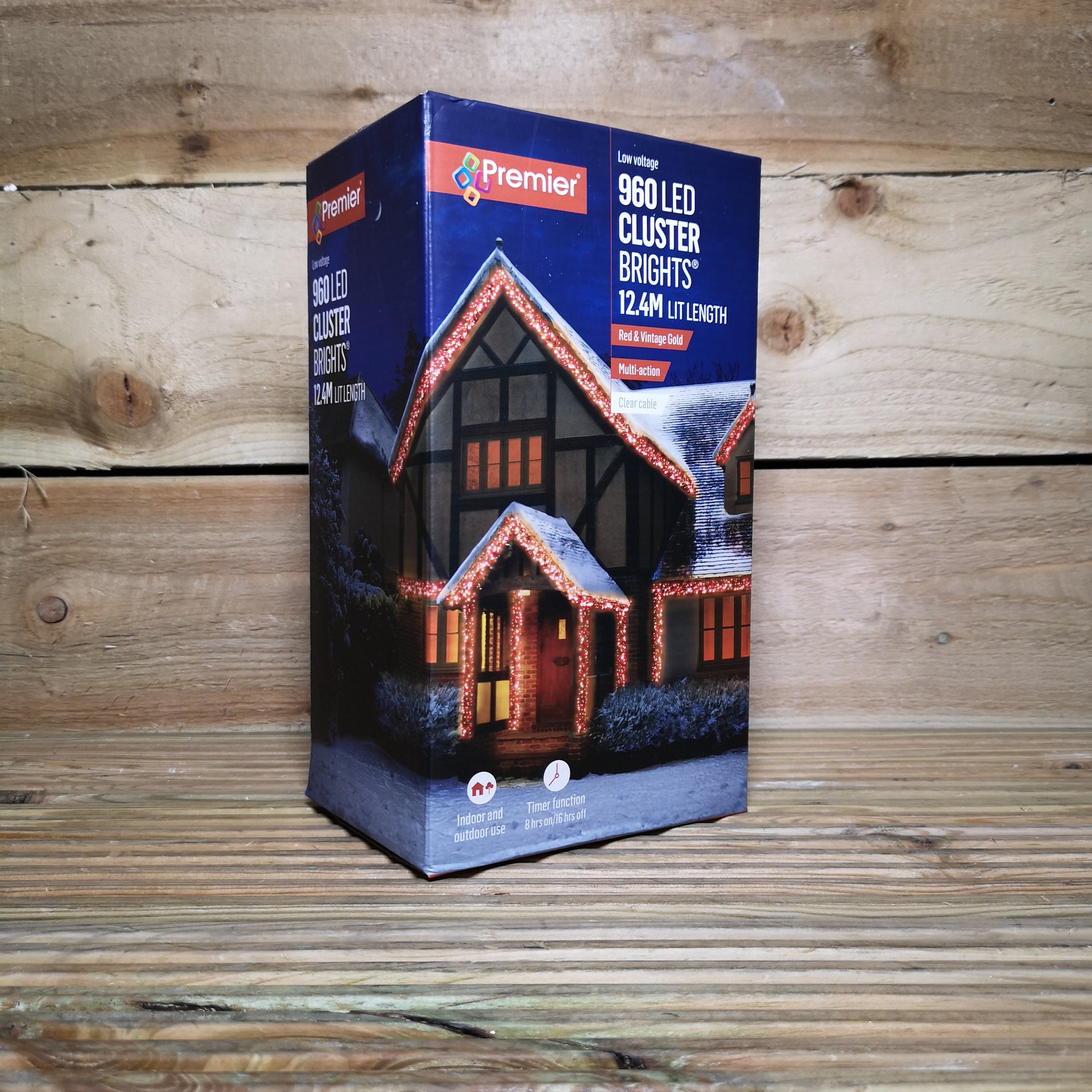 - 960 LED 12m Premier Cluster Indoor Outdoor Multi Function Mains Operated Christmas Lights with Timer on Clear Cable in Red & Gold
