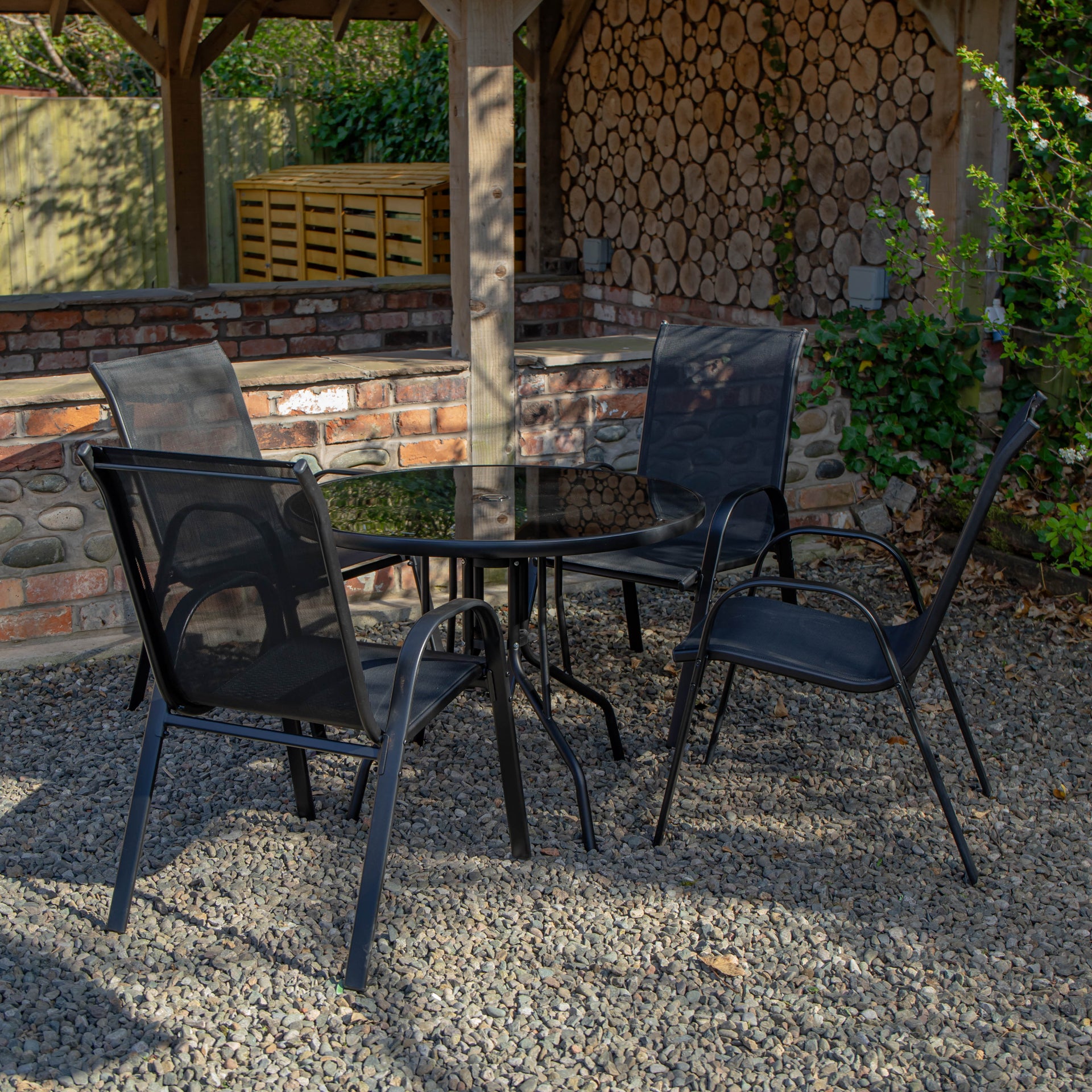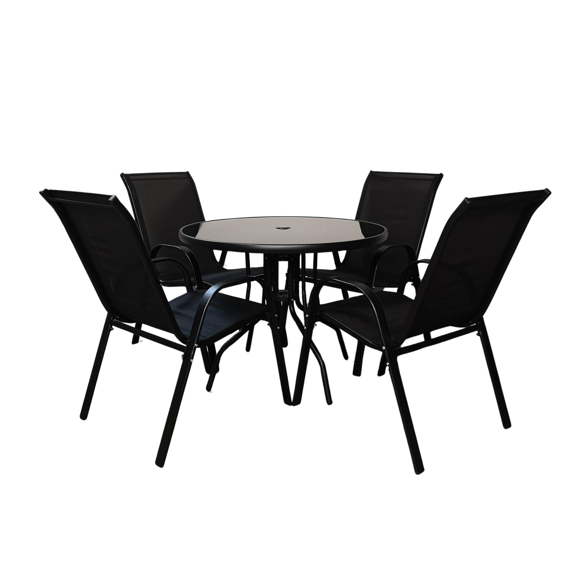 The set includes a black, round tempered glass top table with 4 chairs. Having a black steel set will blend seamlessly with its surroundings. It adds sophistication and a sleek, modern touch to your patio or garden. The frame of the table and chairs are made from steel and have been finished with a powder coating for added strength and durability. The chairs have a textilene backing and they can easily be stacked on top of each other when not in use for easy and convenient storage.