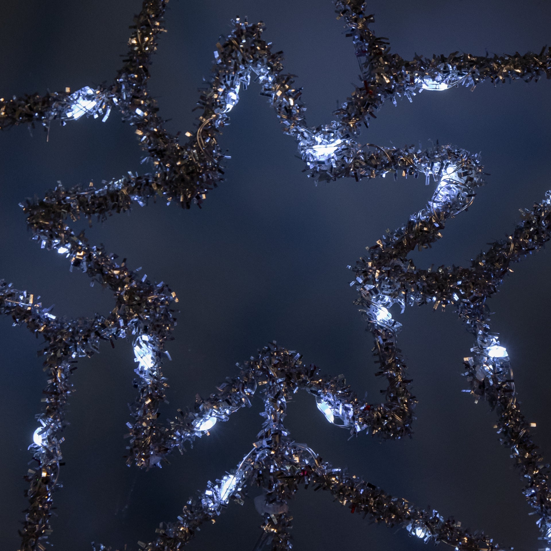 Illuminated with 30 white micro LEDs, this tree topper delivers a soft, magical glow, with 20% of the lights twinkling gently to create a dynamic, enchanting effect. Measuring 28cm in height, it's ideal for medium to large trees and is designed to sit securely on top. Powered by 3 x AA batteries (not included), with a 30cm lead length from battery pack to the product. Included is a built in timer function of 6 hours on / 18 hours off, so your star automatically lights up each evening without needing to be switched on manually.