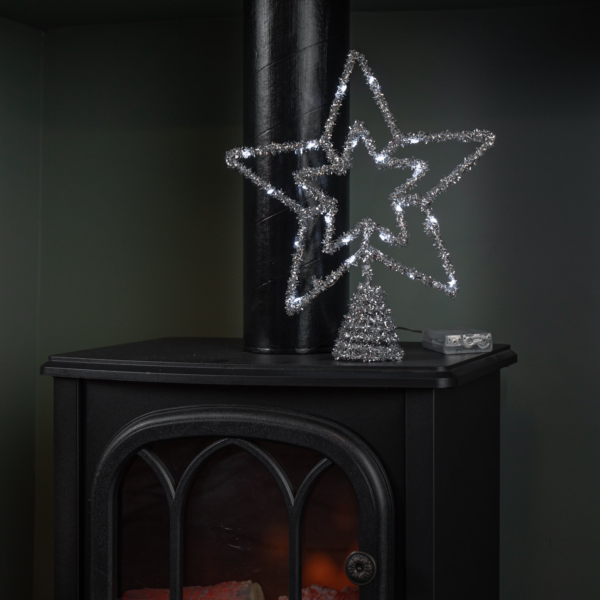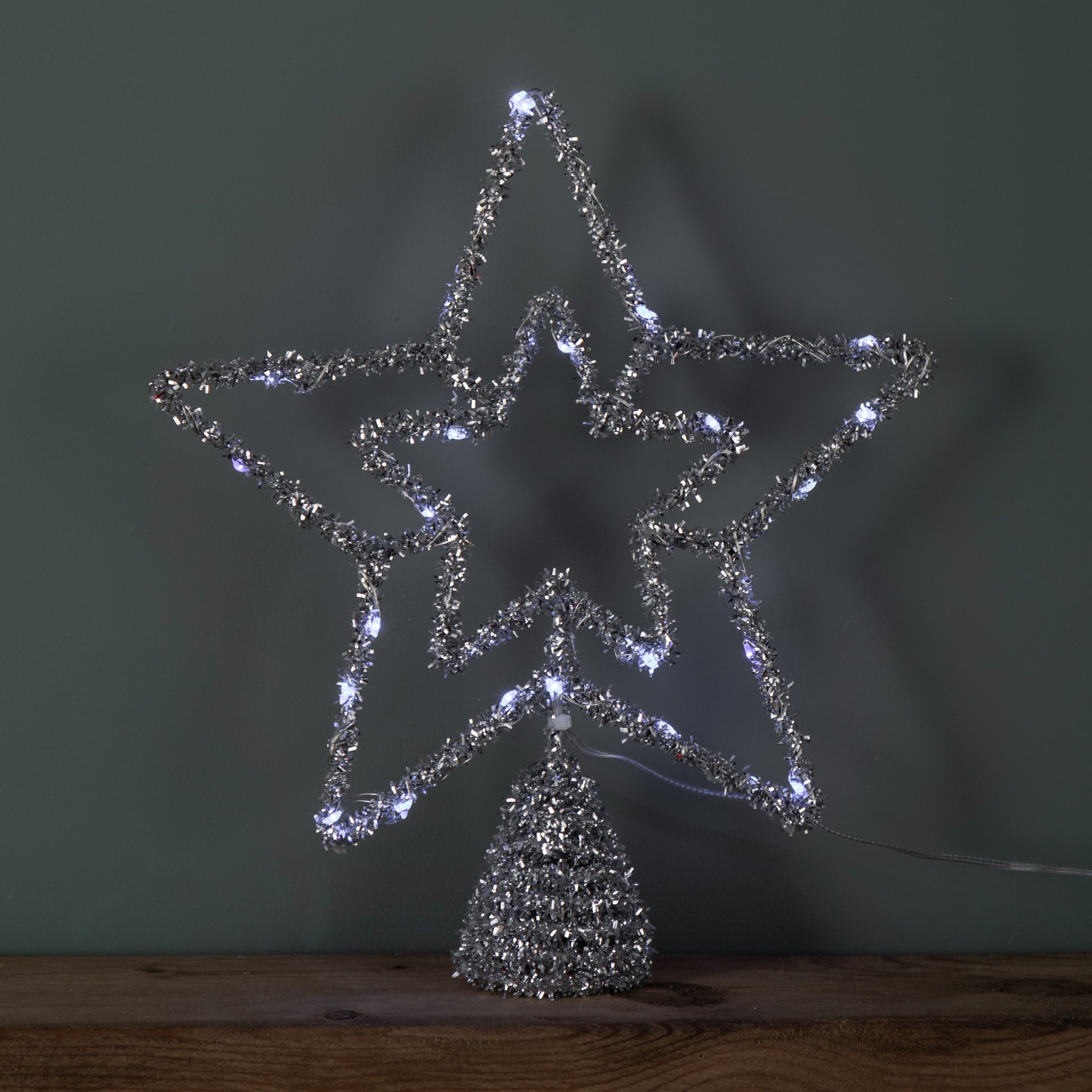 - 28cm Battery Powered Silver Christmas Star Tree Topper with White Multi-Action LEDs