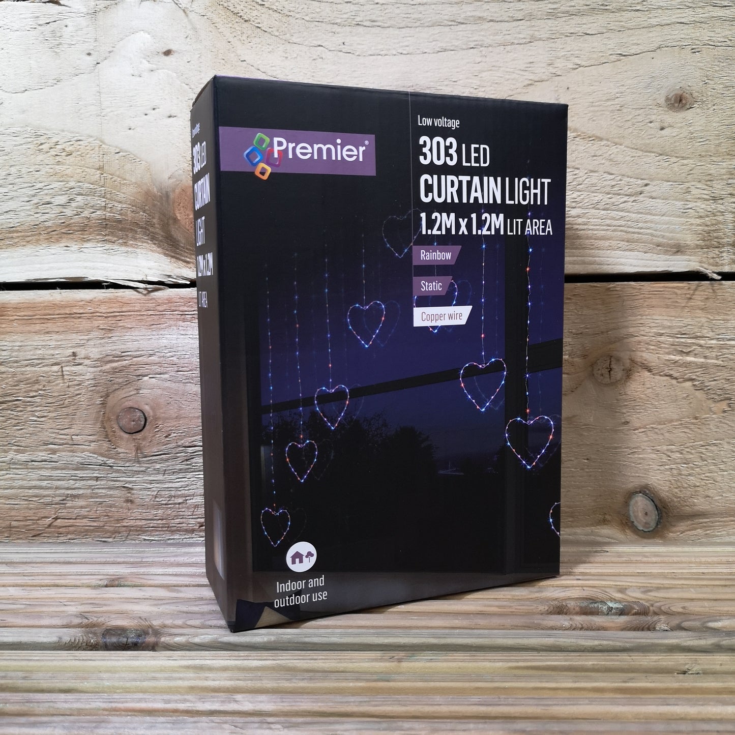 - 1.2m Premier Christmas Static Heart LED Silver Pin Wire V Curtain Lights in Rainbow