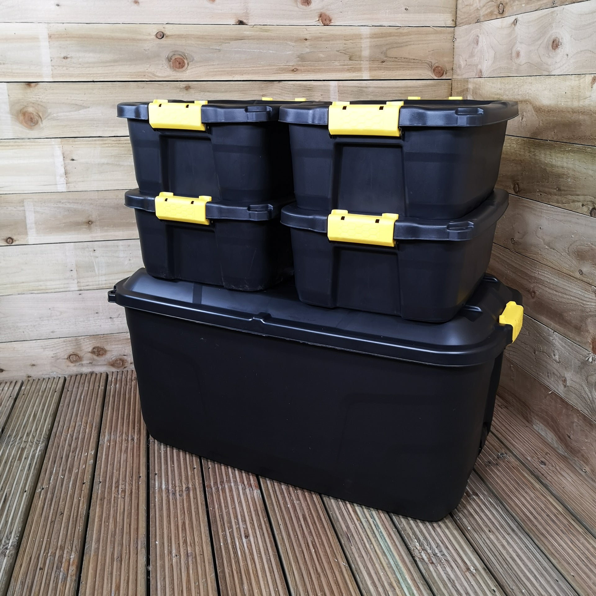 1 x 145L AND 4 x 24L Heavy Duty Trunks 1 on Wheels Sturdy, Lockable, Stackable and Nestable Design Storage Chest with Clips in Black