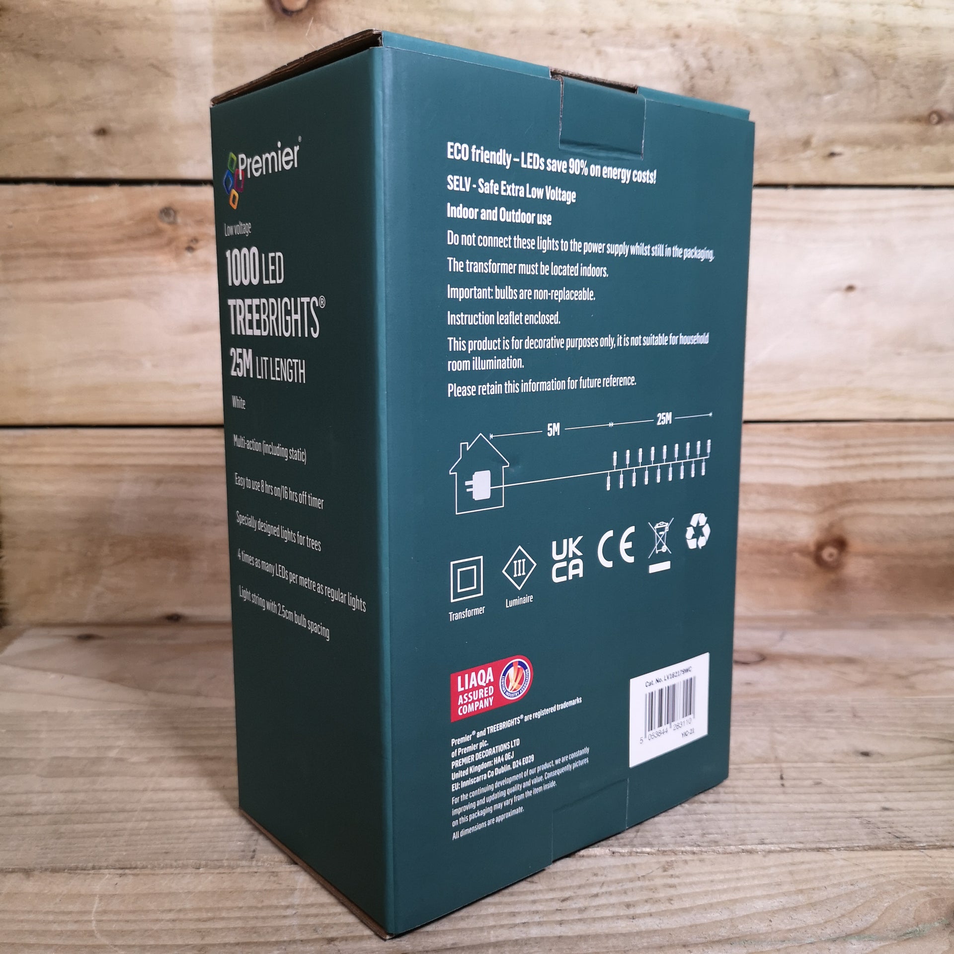 1000 LED 25m Premier TreeBrights Indoor Outdoor Christmas Multi Function Mains Operated String Lights with Timer & Clear Cable in Cool White