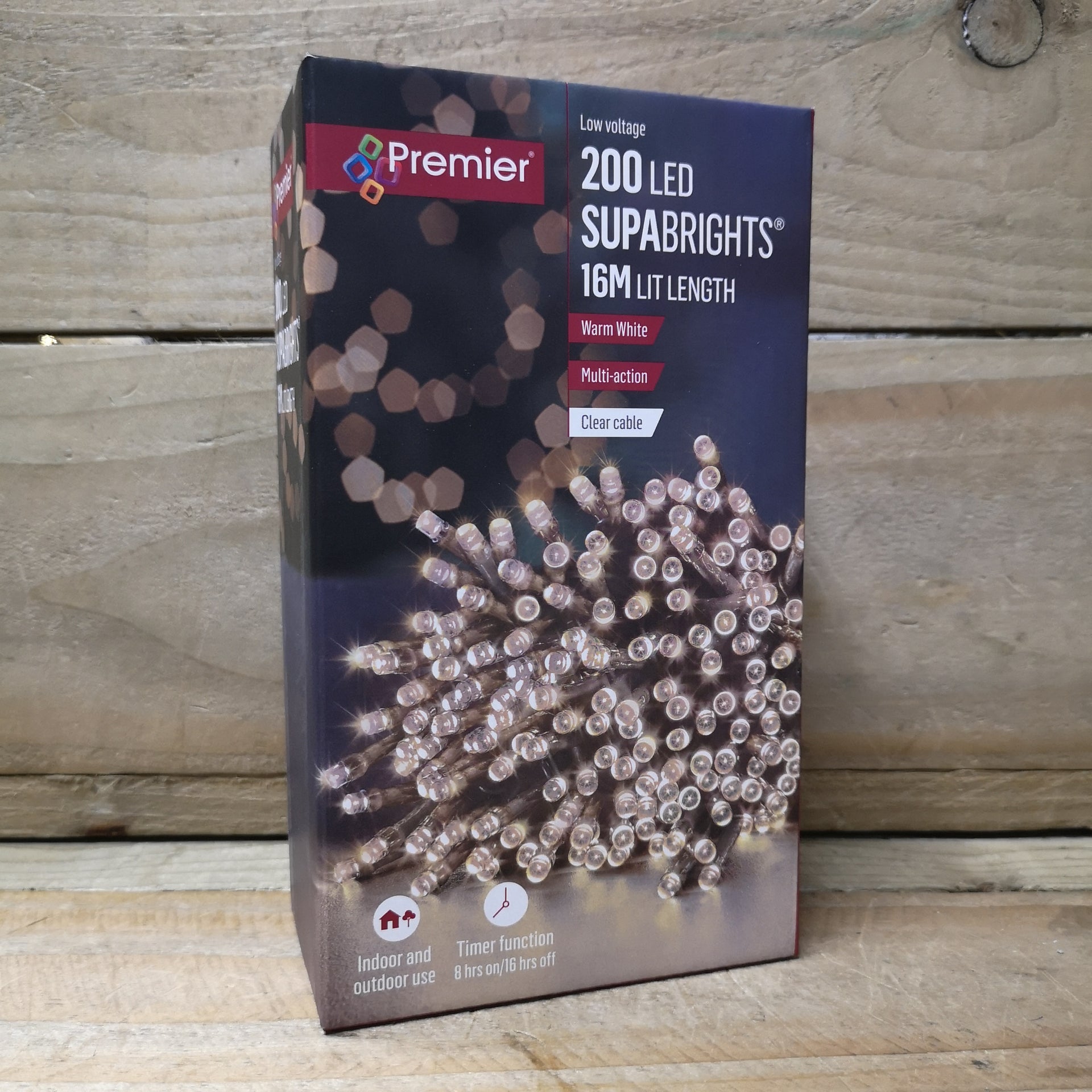 - 200 LED 16m Premier Christmas Outdoor 8 Function Lights Clear Wire in Warm White