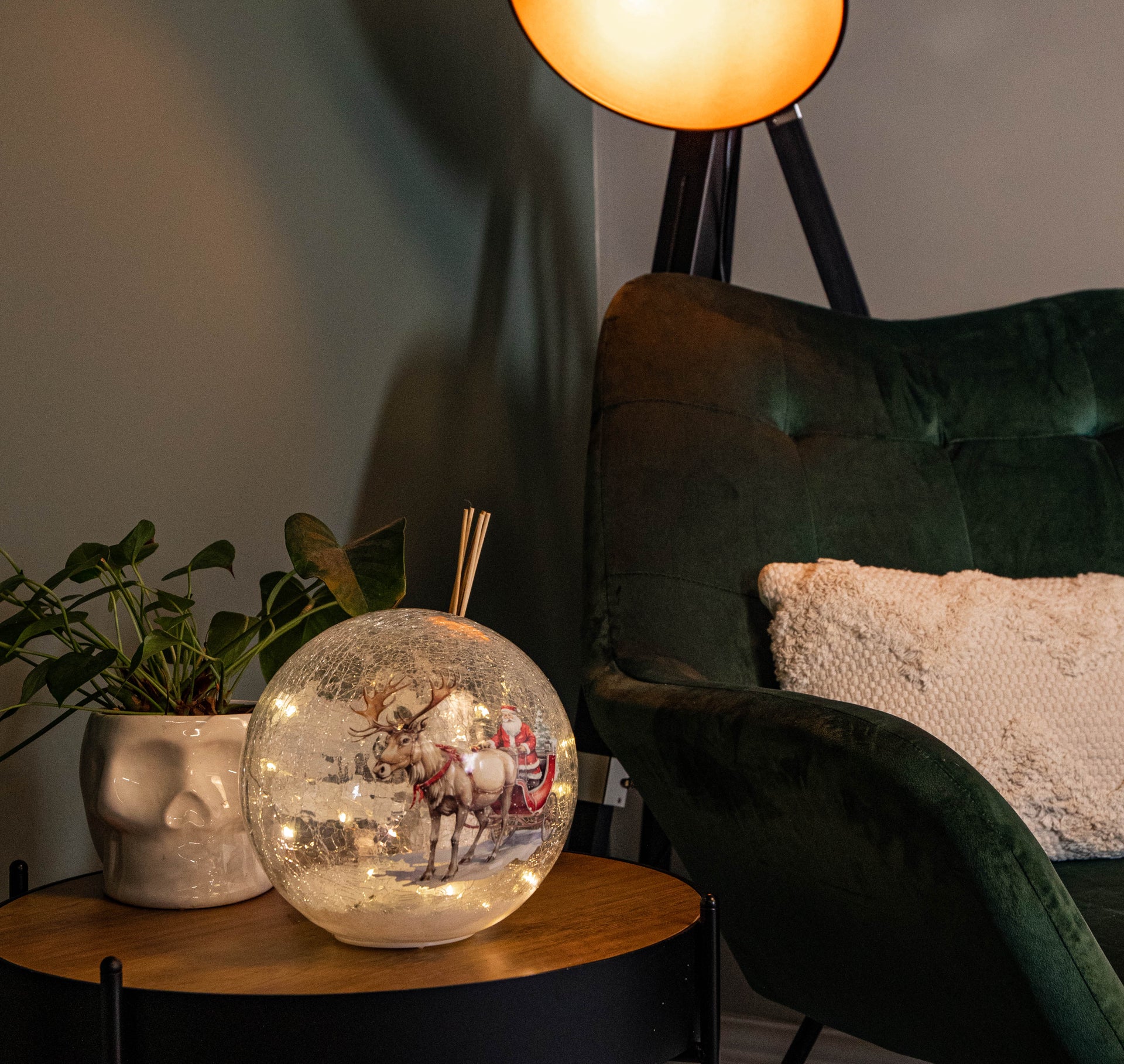 Brighten up your home this year with this Christmas Santa with sleigh light up crackle ball. Crackle balls are perfect for any room as either an eye catching centrepiece at the dining table or to create a dazzling window display. The lit glass bauble gives the effect of an illuminated winter wonderland with its shattered ice effect. Depicting a festive scene with Santa sitting in his sleigh with a Reindeer, this decoration is sure to bring the festive spirit to your home. At 20cm in size, the crackle ball is illuminated with 15 warm white LEDs to bring an enchanting glow to your Christmas decor. With its mesmerising crackle effect, this decoration is sure to bring a warm and inviting atmosphere to any room. Battery operated, allowing this to be placed without the hassle of wires and plugs. Requires 3 x AA. Suitable for indoor use only. Product Dimensions Diameter: 20cm