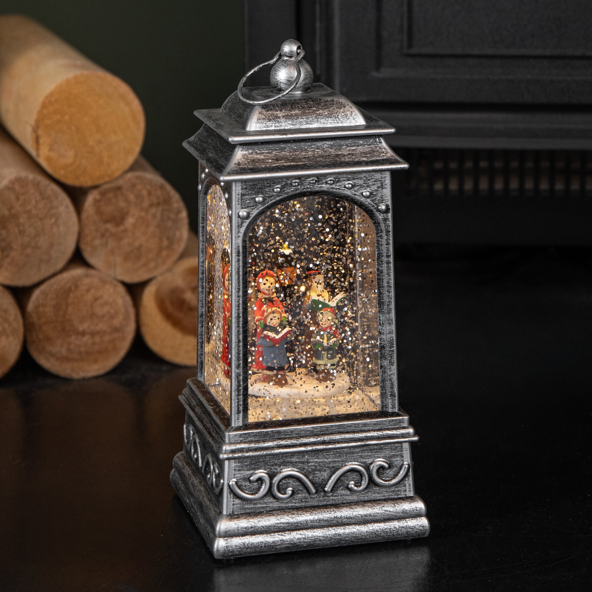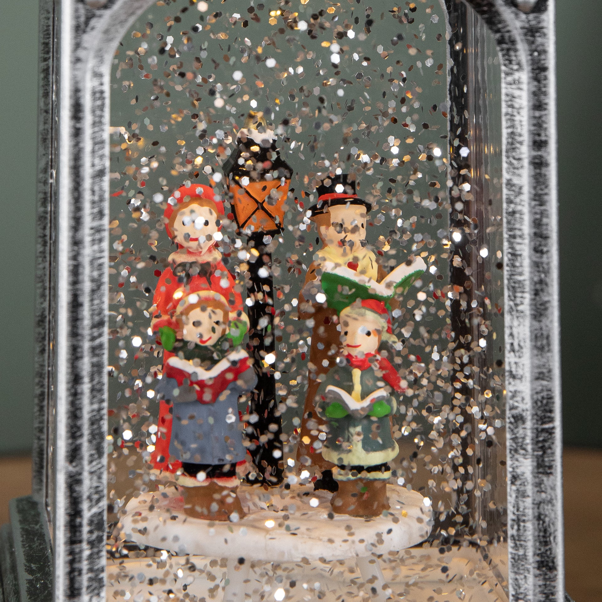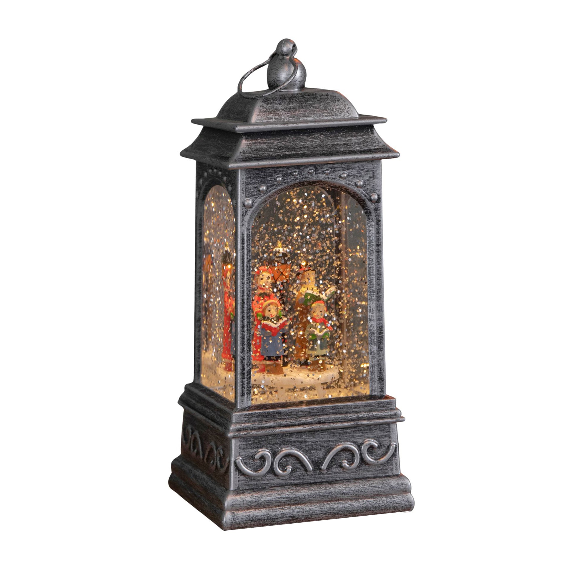 Inside the lantern, a delightful festive scene comes to life, featuring a Christmas carol surrounded by gently swirling snow glitter. The lantern illuminates with warm white LEDs, casting a soft, cosy glow that enhances the festive scene and makes it perfect for displaying on most suitable flat surfaces.