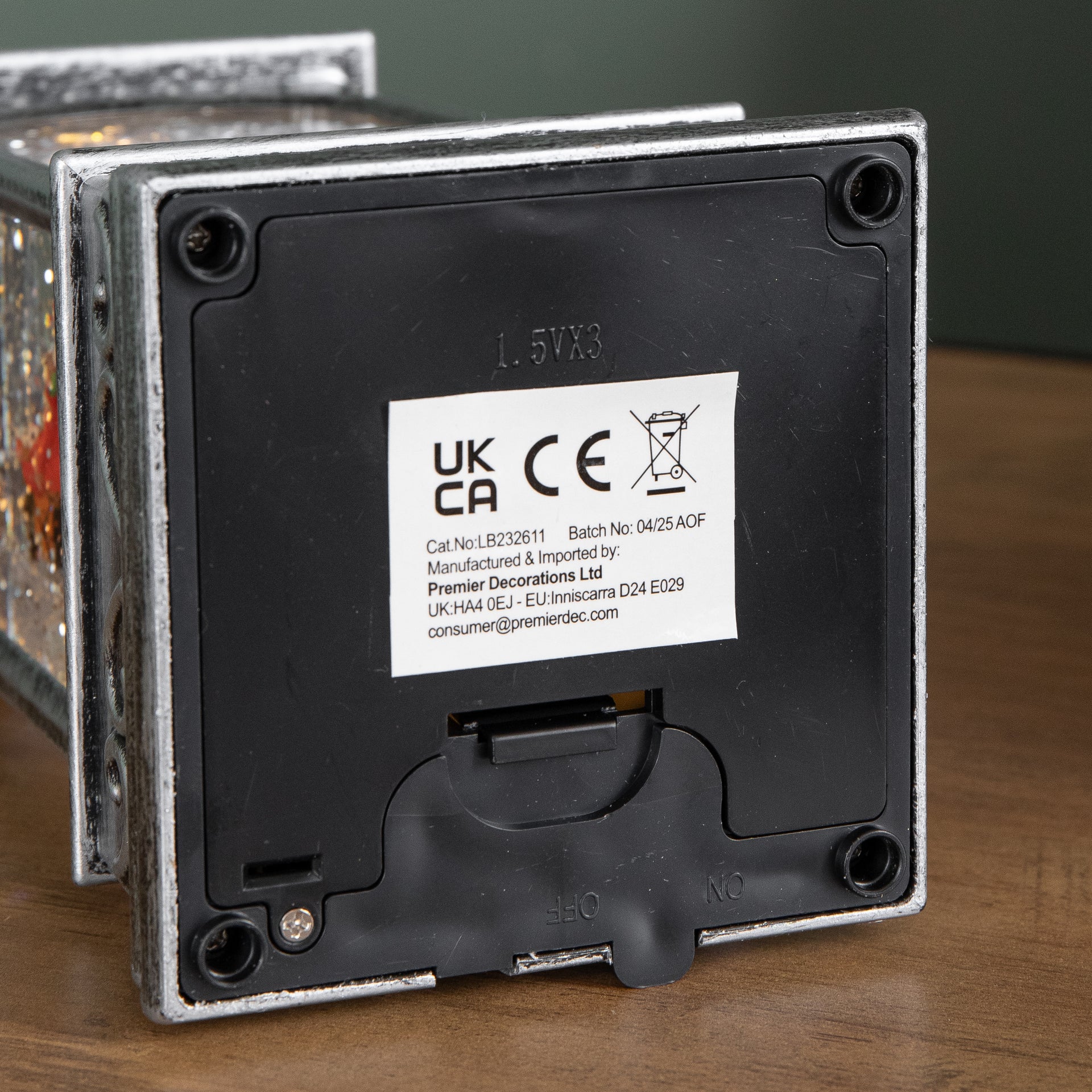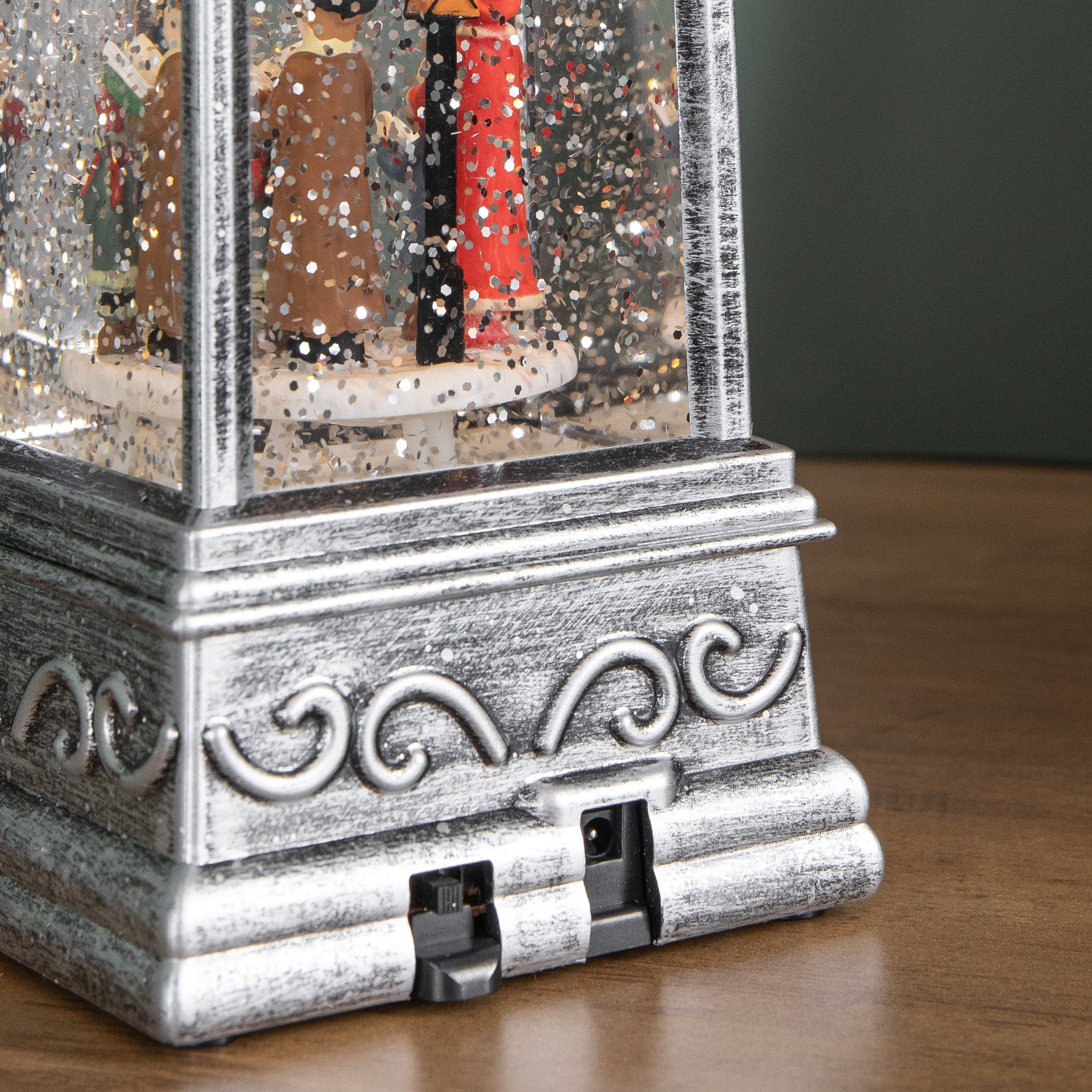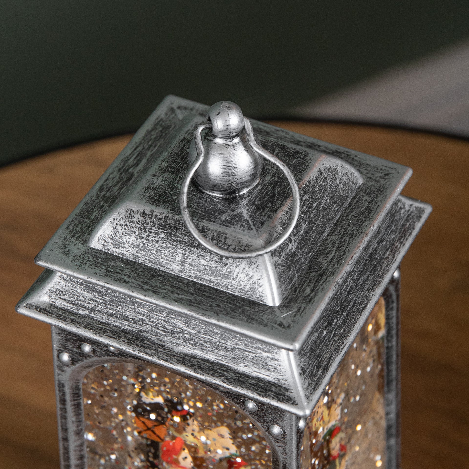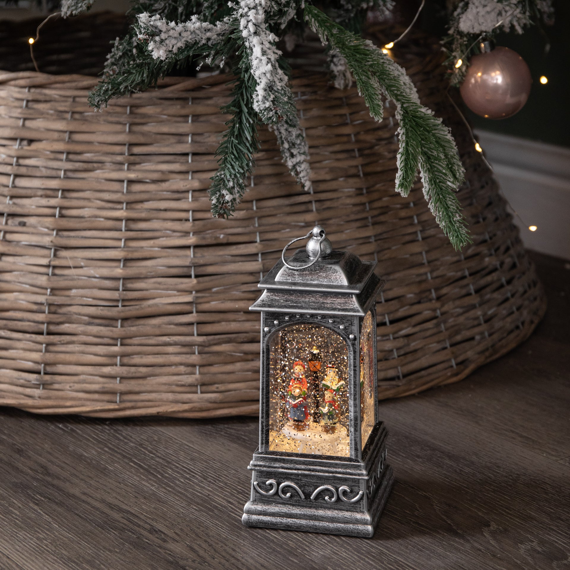 Inside the lantern, a delightful festive scene comes to life, featuring a Christmas carol surrounded by gently swirling snow glitter. The lantern illuminates with warm white LEDs, casting a soft, cosy glow that enhances the festive scene and makes it perfect for displaying on most suitable flat surfaces.
