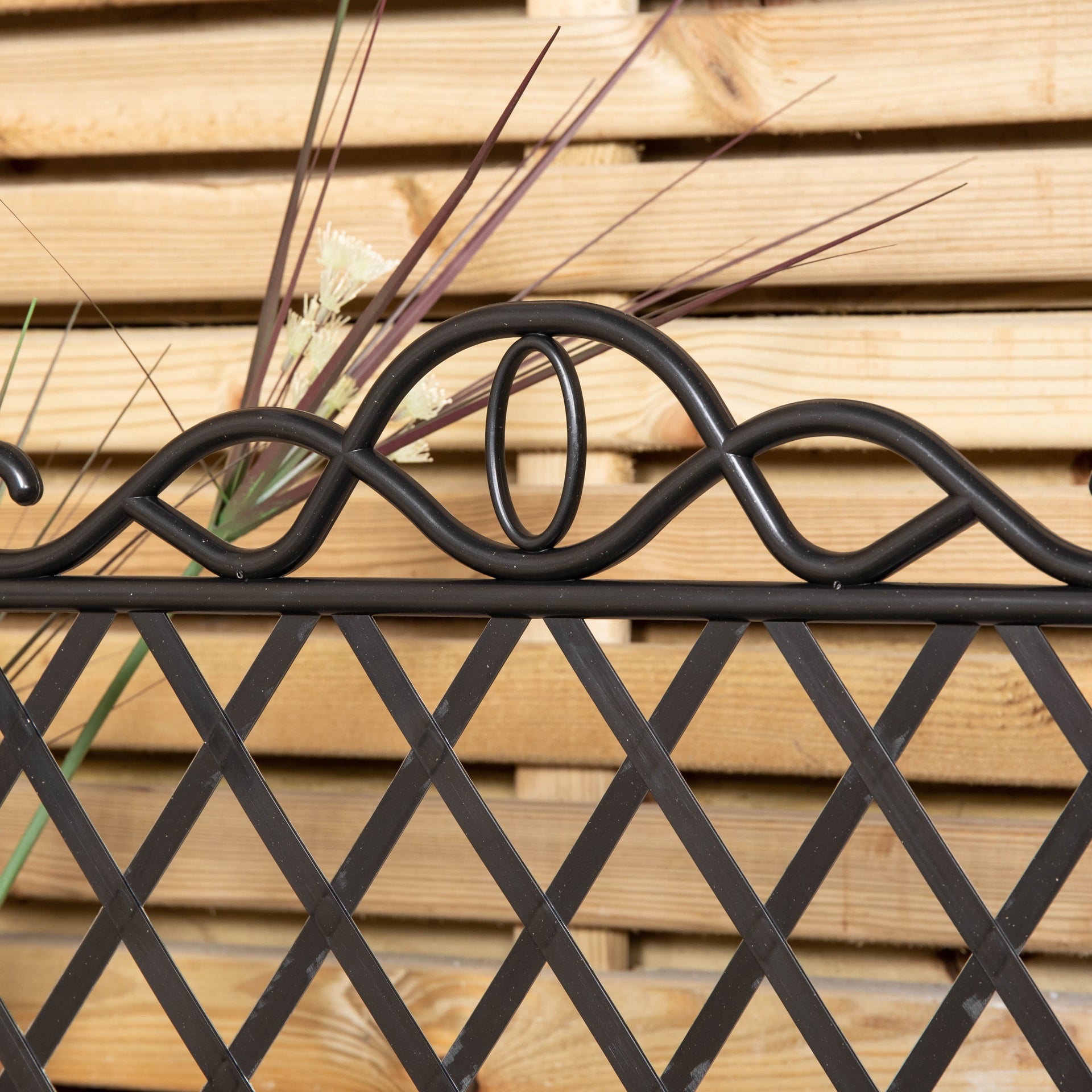 Keep your garden neat and tidy this summer with this Black border fence. Perfect for use along the flower beds, lawn or along the patio to create a pathway. Edging your lawn is a great way to define and neaten borders to give your lawn a crisp line against your walkways, garden beds or just to create boundaries within your outdoor space whilst providing protection to the grass edge from damage. Made from plastic, this Black lattice design fencing is easy to install and comes with 'click and clip' attachments with ground spikes for easy insertion into the ground. Product Dimensions Height: 36cm (including ground spikes) Actual Fence Height: 27cm Width: 47cm Ground Spike Height: 9cm Width: 2cm