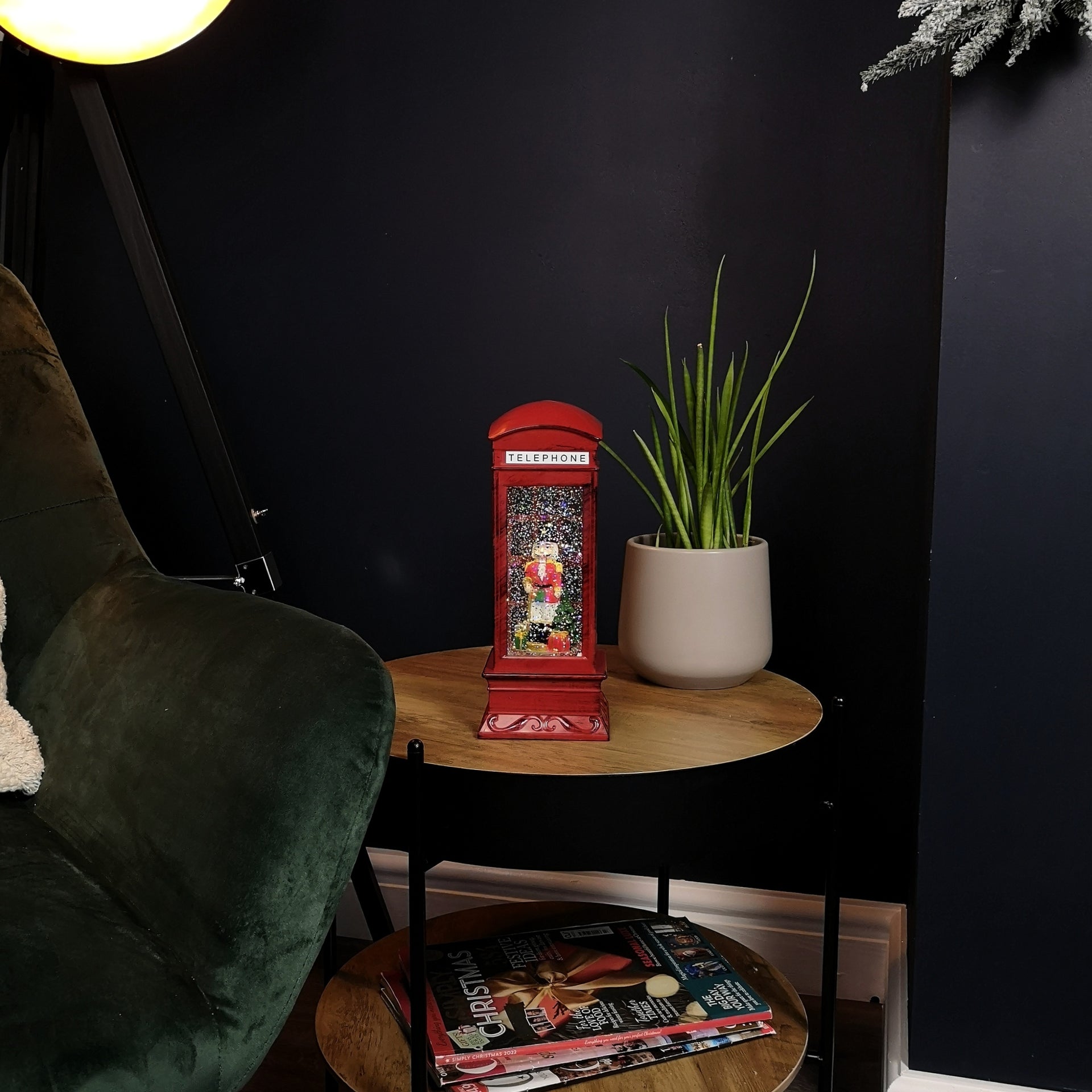 Add a touch of festive magic to your home with this 27cm Battery Operated Light up Christmas Water Spinner Telephone Box with Nutcracker Scene. Designed for indoor use, this delightful decoration can be placed anywhere, on the fireplace, in a window, or on a table top display, bringing warmth and sparkle to your seasonal decor.