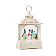Light up your home at Christmas with this Snowman lantern decoration. Suitable to be placed anywhere around your indoor space, the Snowman lantern is battery operated allowing you to place this wherever you like without the hassle of plugs. Whether you to choose to have the decoration part of a display in the hallway or in the living room. Featuring Warm White LEDs, this snow swirling decoration is sure to bring the festive spirit to your home. The White lantern has a brushed copper Gold effect with a scene of 3 snowmen and Christmas trees inside. Requiring 3 x AA batteries (batteries not included) with a timer function of 6 hours ON and 18 hours OFF. Suitable for indoor use only. Product Dimensions Height: 28cm and 18cm Wide.