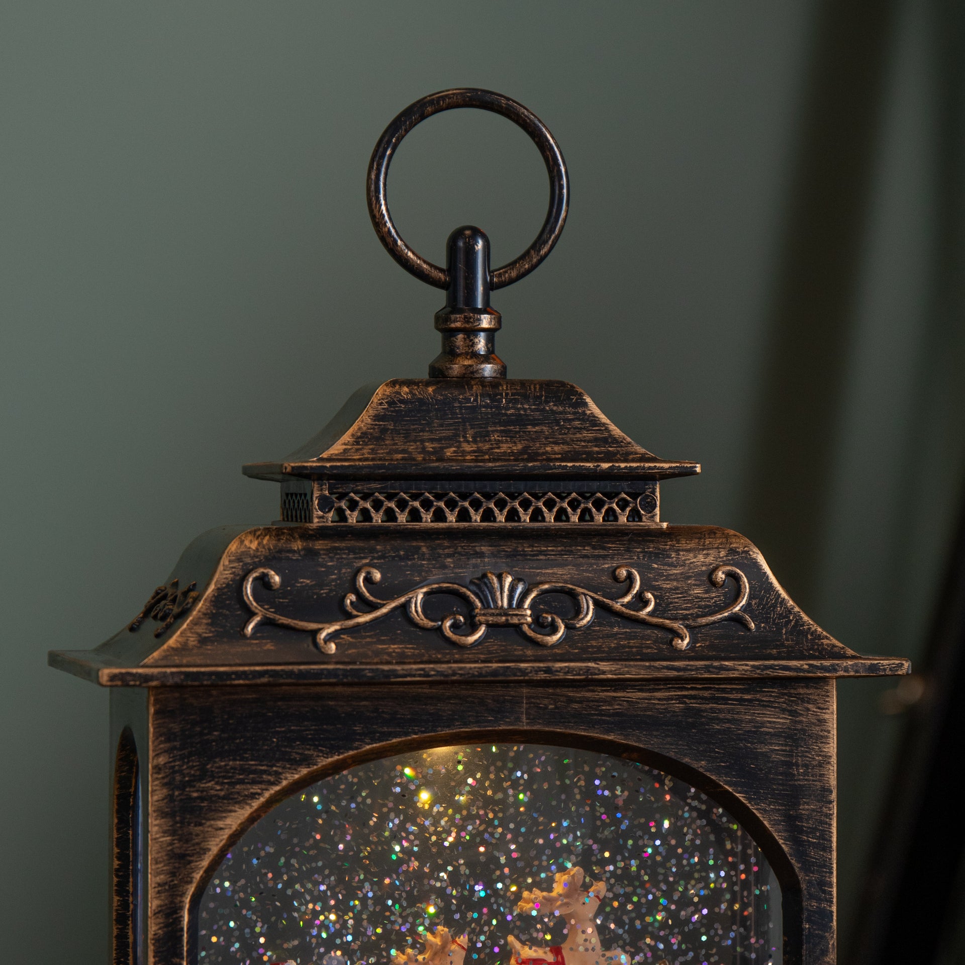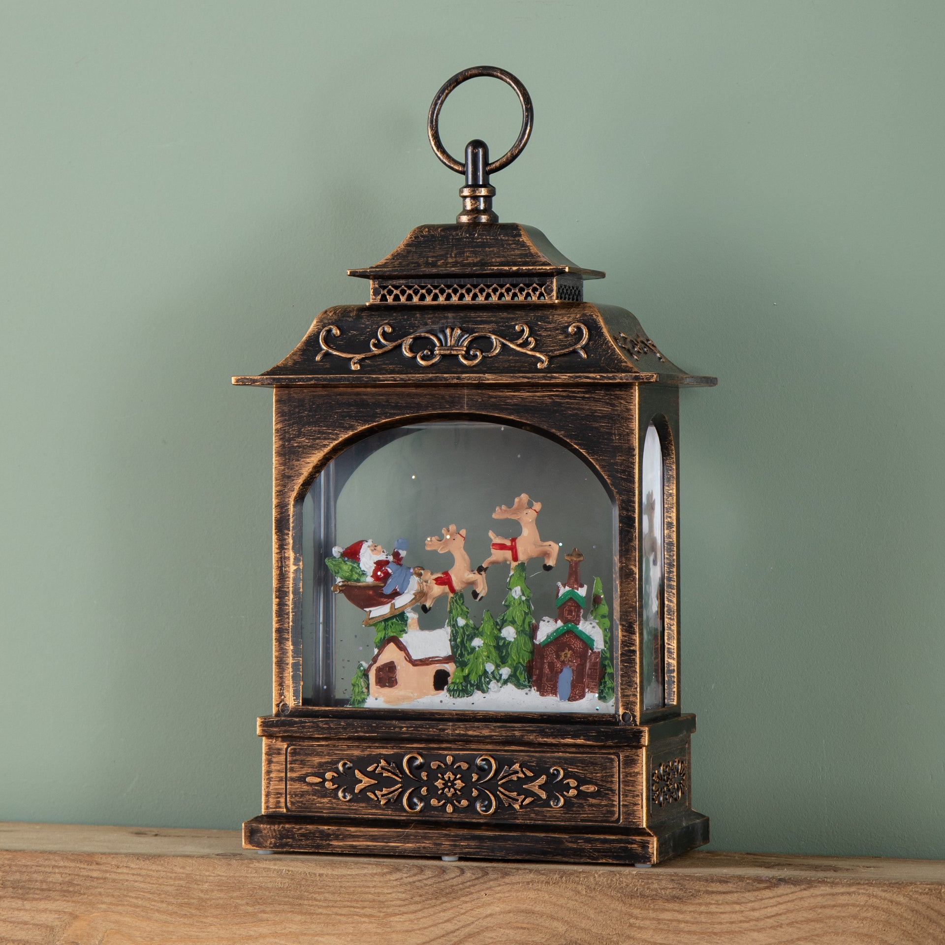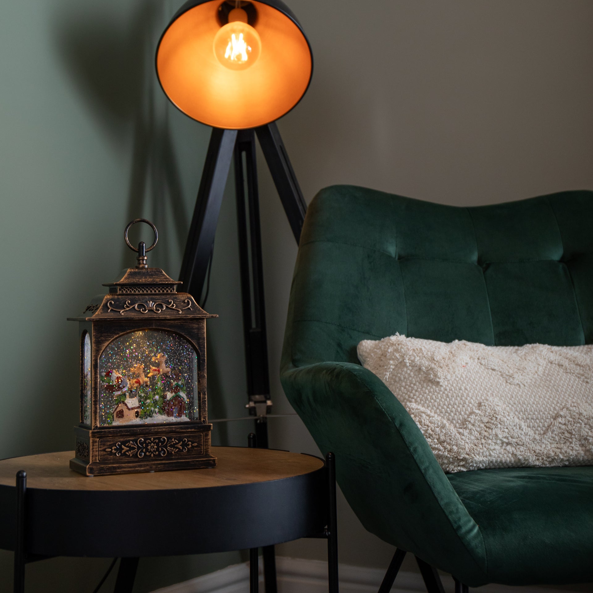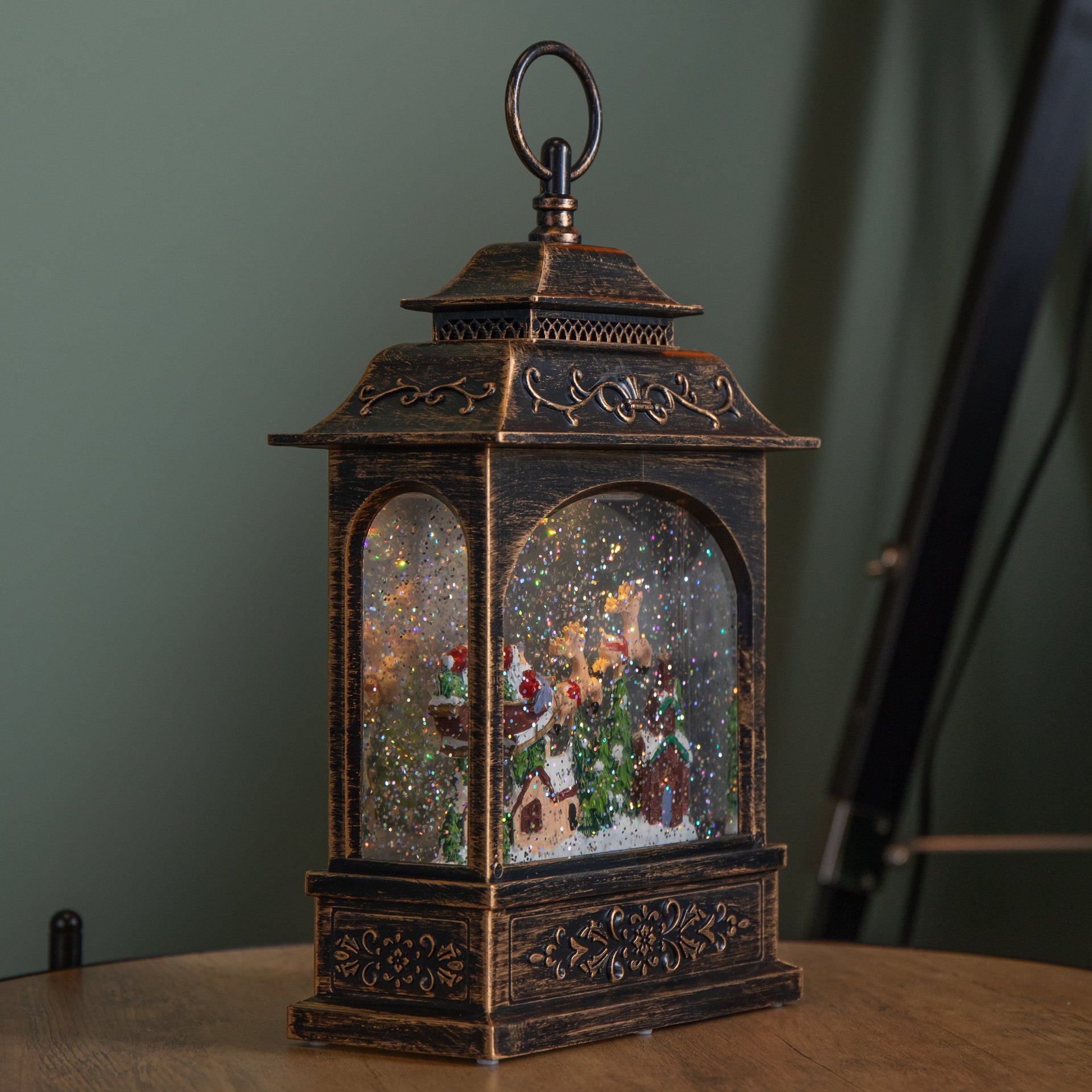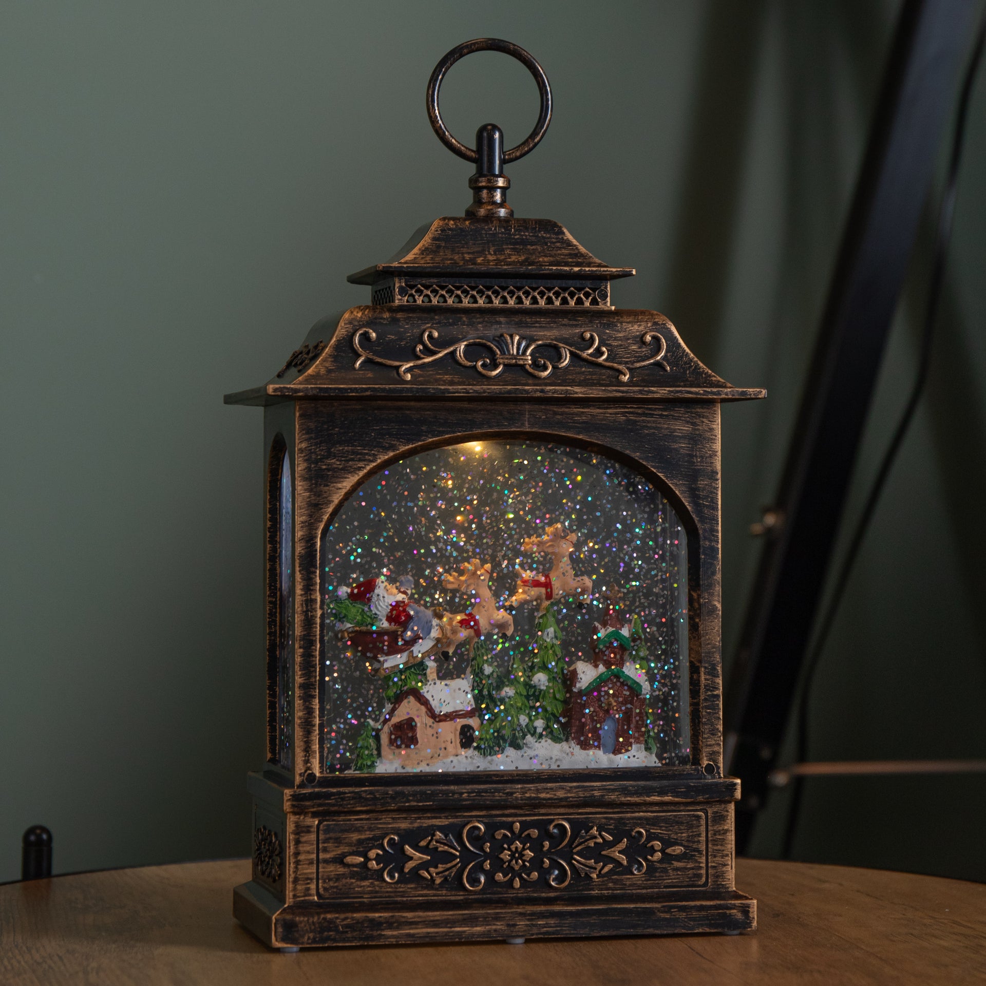 With a bronze effect water spinner, inside depicts Santa in his sleigh with this reindeers flying over a wintery, snowy village surrounded by a glittering snow storm effect whilst being illuminated by warm white LEDs. At 28cm tall, this water spinner is dual powered with the choice of batteries (not included) or use with a transformer plug (not included). With a timer function available with 6 hours ON and 18 hours OFF. Simple to set up, just add batteries or plug in and turn ON / OFF with the black switch.