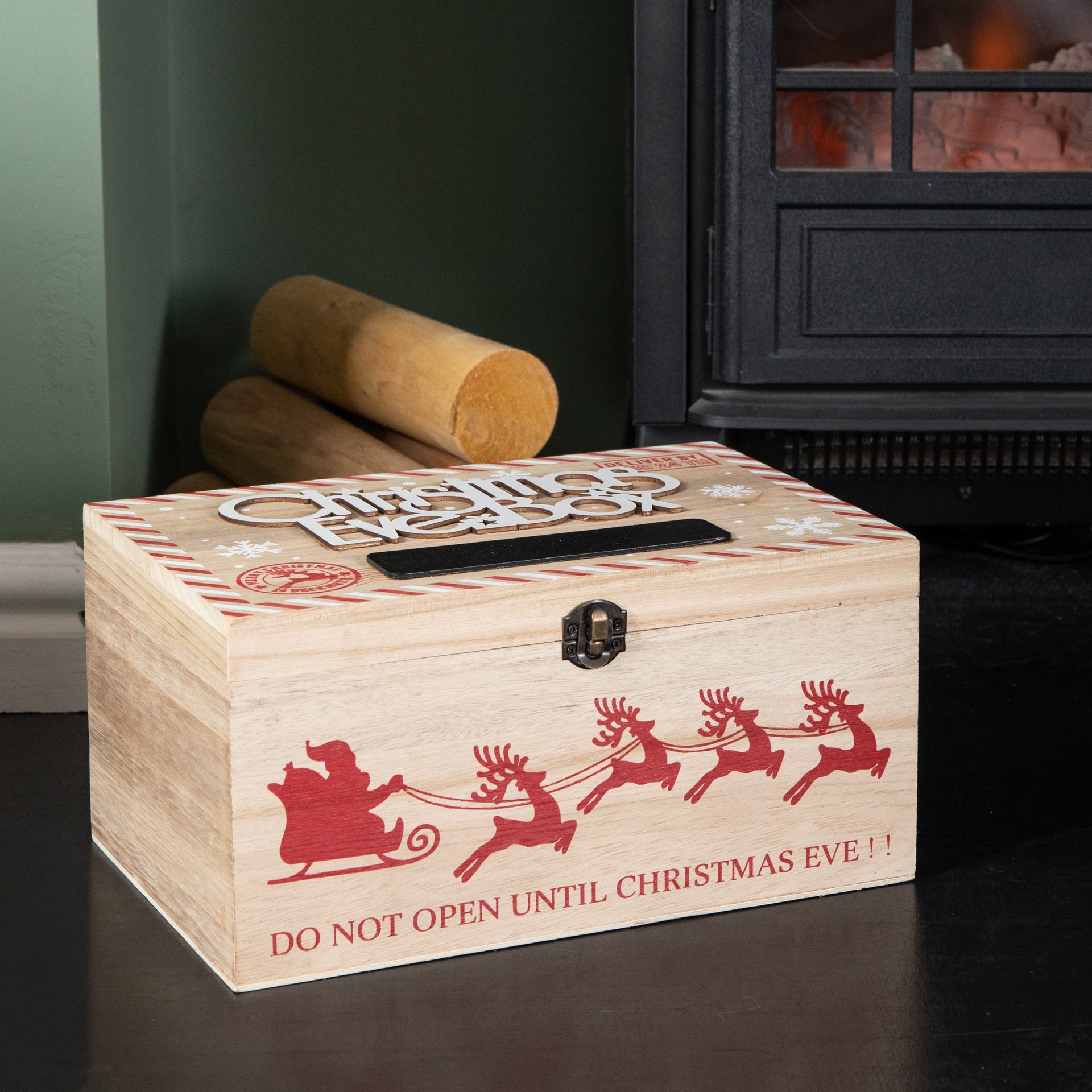Crafted from wood, the box has a sturdy and timeless feel, making it a keepsake decoration that can be enjoyed year after year. It is perfectly sized for filling with small presents such as chocolate, pyjamas, games and even reindeer food, creating a memorable experience for children and families alike on the night before Christmas.