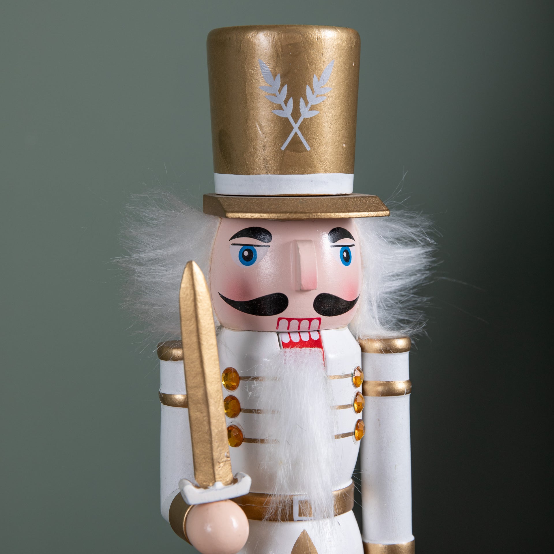 Standing at 30cm tall, this striking nutcracker features a white body and shoes, perfectly complemented by a jewelled jacket and an eye-catching gold hat for a regal finish. The intricate detailing is enhanced by matching white hair and beard. The nutcracker stands securely on a 7cm x 8cm golden base, ensuring it remains upright whether placed on a mantelpiece, sideboard, windowsill or as part of a larger Christmas arrangement.
