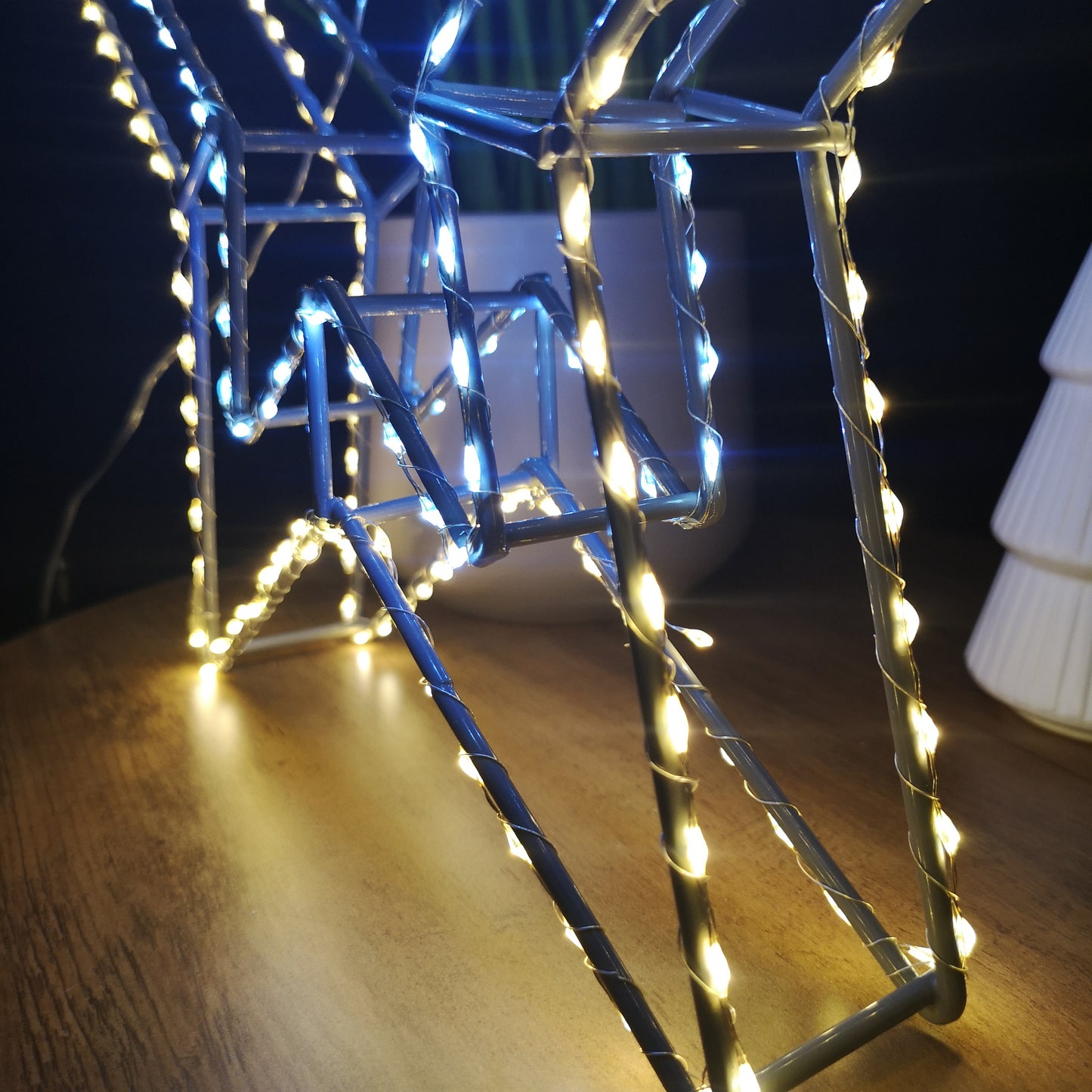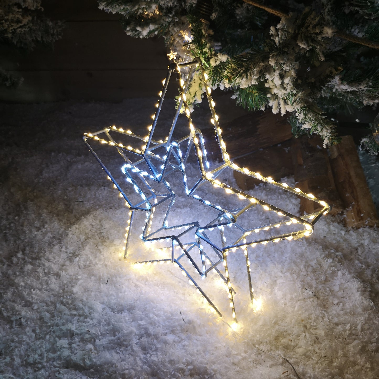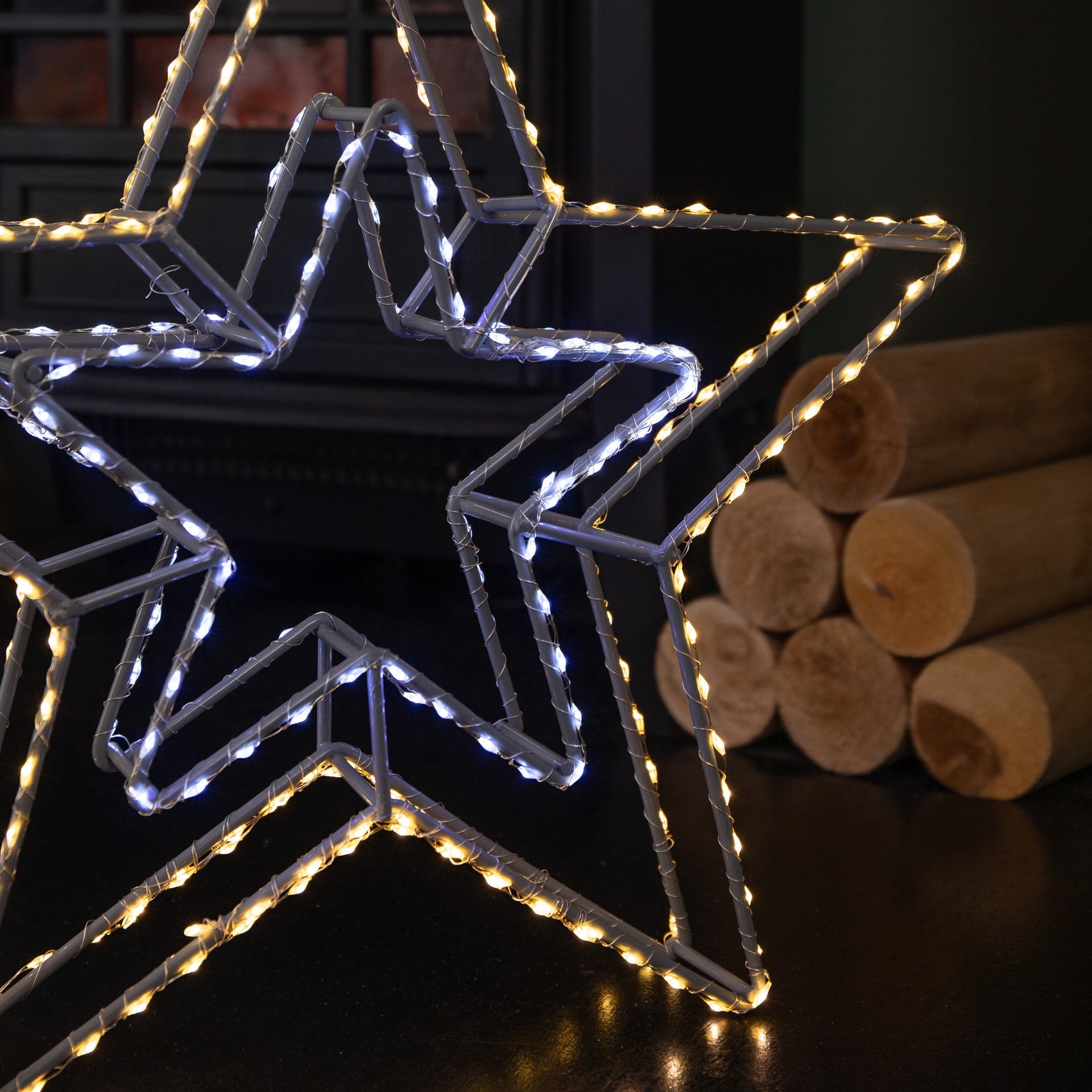 This elegant star features a combination of 280 white and warm white LEDs in a static setting, creating a captivating, magical effect that’s sure to draw attention. The design includes a stylish grey metal frame with warm white LEDs woven around the outer star, while the inner star shines with crisp white LEDs, adding depth to your festive decor. Mains operated, it comes with a generous 8 metre clear cable, allowing you to position the decoration exactly where you want it without the inconvenience of reaching a nearby plug.