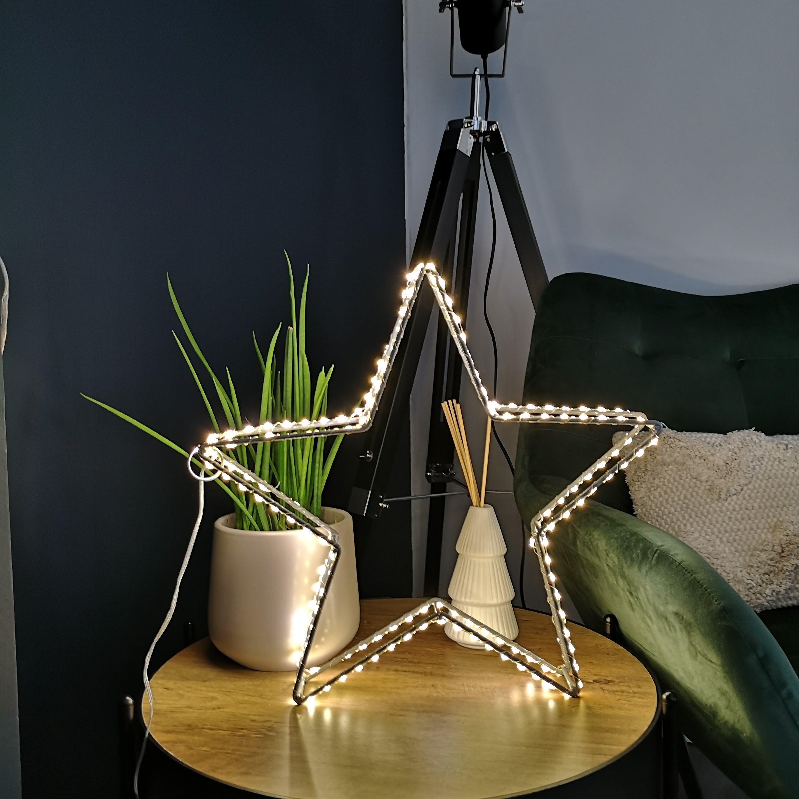 Brighten up your home this year with this LED Dewdrop Christmas star decoration. This stunning decoration is suitable for indoor and outdoor use making it perfect to be placed anywhere. Whether you choose to place it on a side table, in the window or by the front door to welcome any guests. Featuring 180 warm white LEDs with a static function this is sure to catch everyone's attention and bring that magical feeling of Christmas. The decoration is mains operated with a clear cable length of 8 meters allowing this to be placed without the hassle of stretching the wire to the nearest plug. The frame of the star is Grey and made with metal and the LEDs are woven around the decoration. Dimensions 38cm bulb spacing 1.6cm