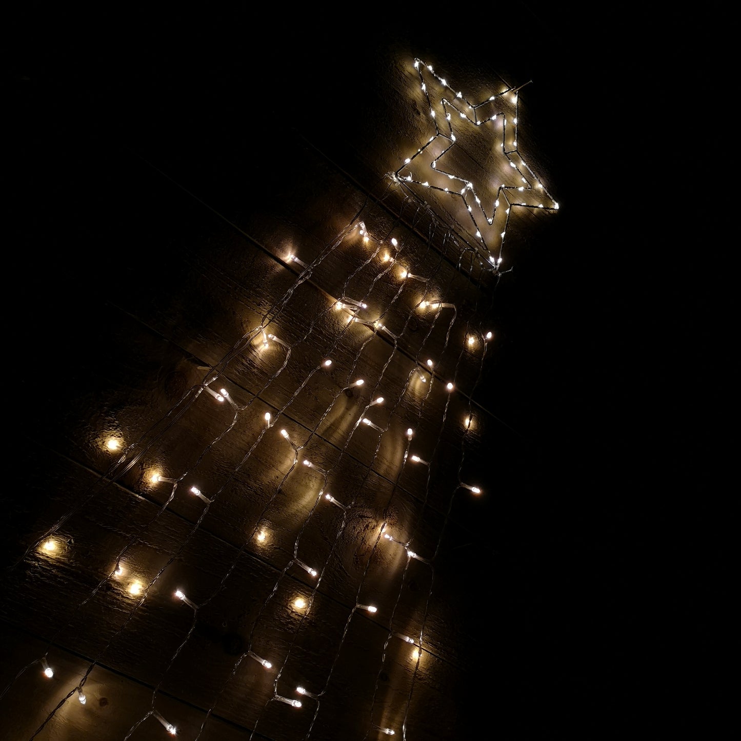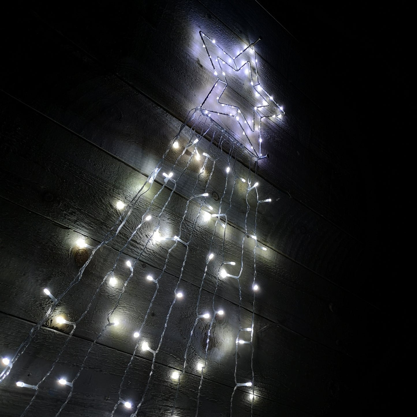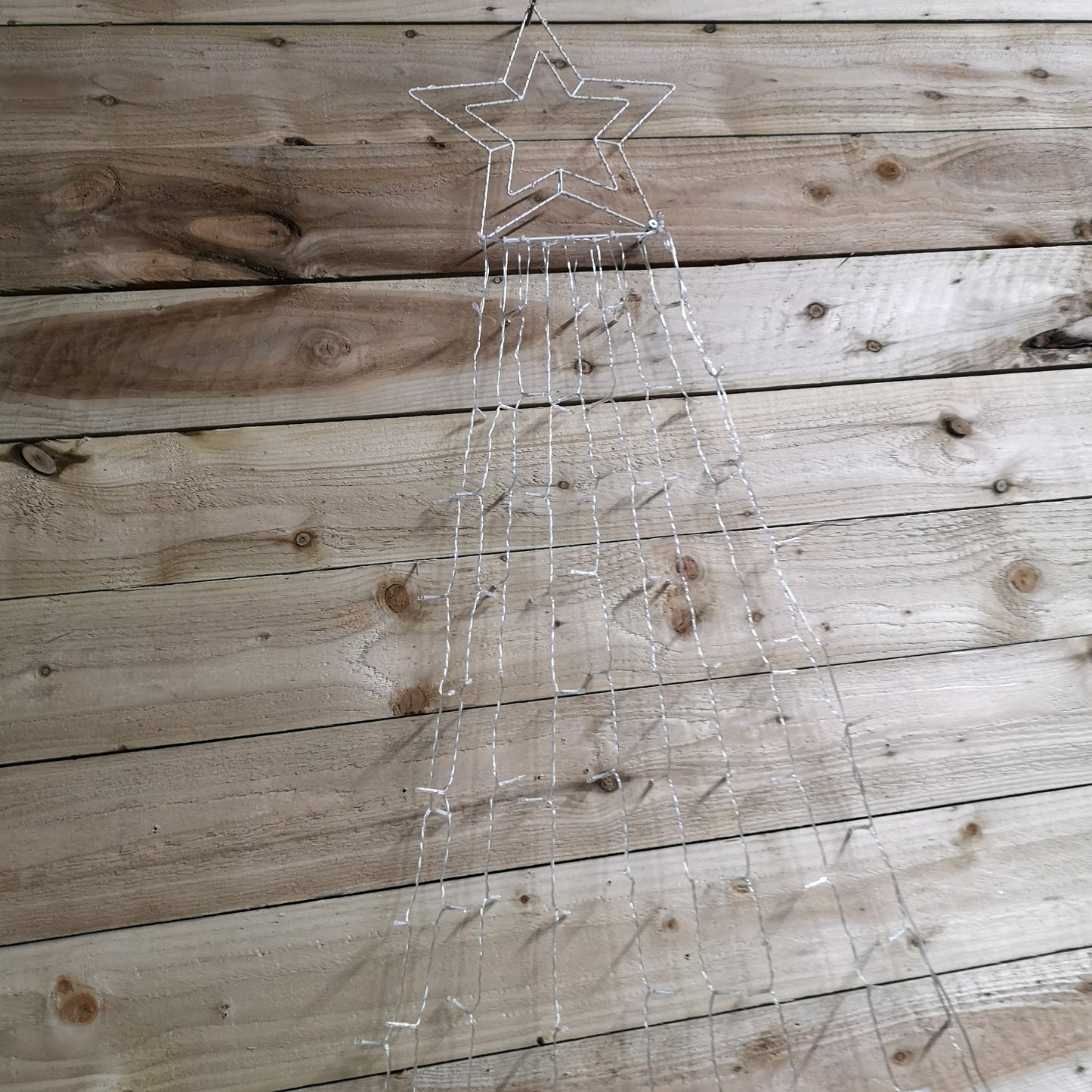 - 9 drapes of LEDs on clear 3m string drape from a 30cm white metal star that has been wrapped in micro LEDs on pin wire