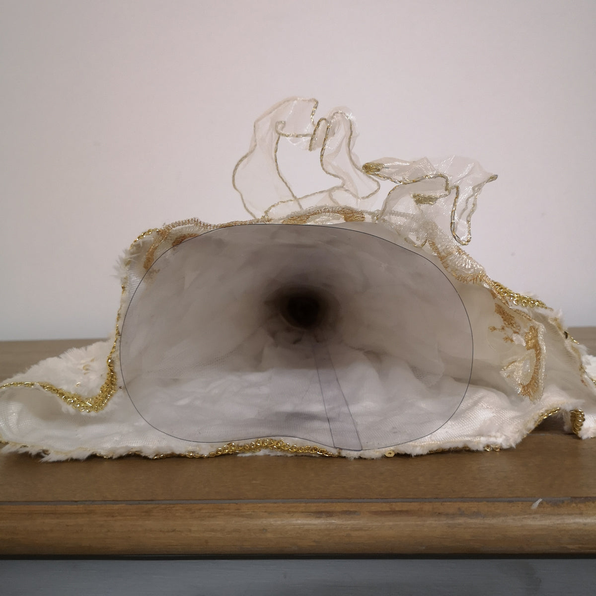 Mixed materials have been used to create an elegantly detailed dress, feathered wings for the perfect finishing touch. Plastic inner.