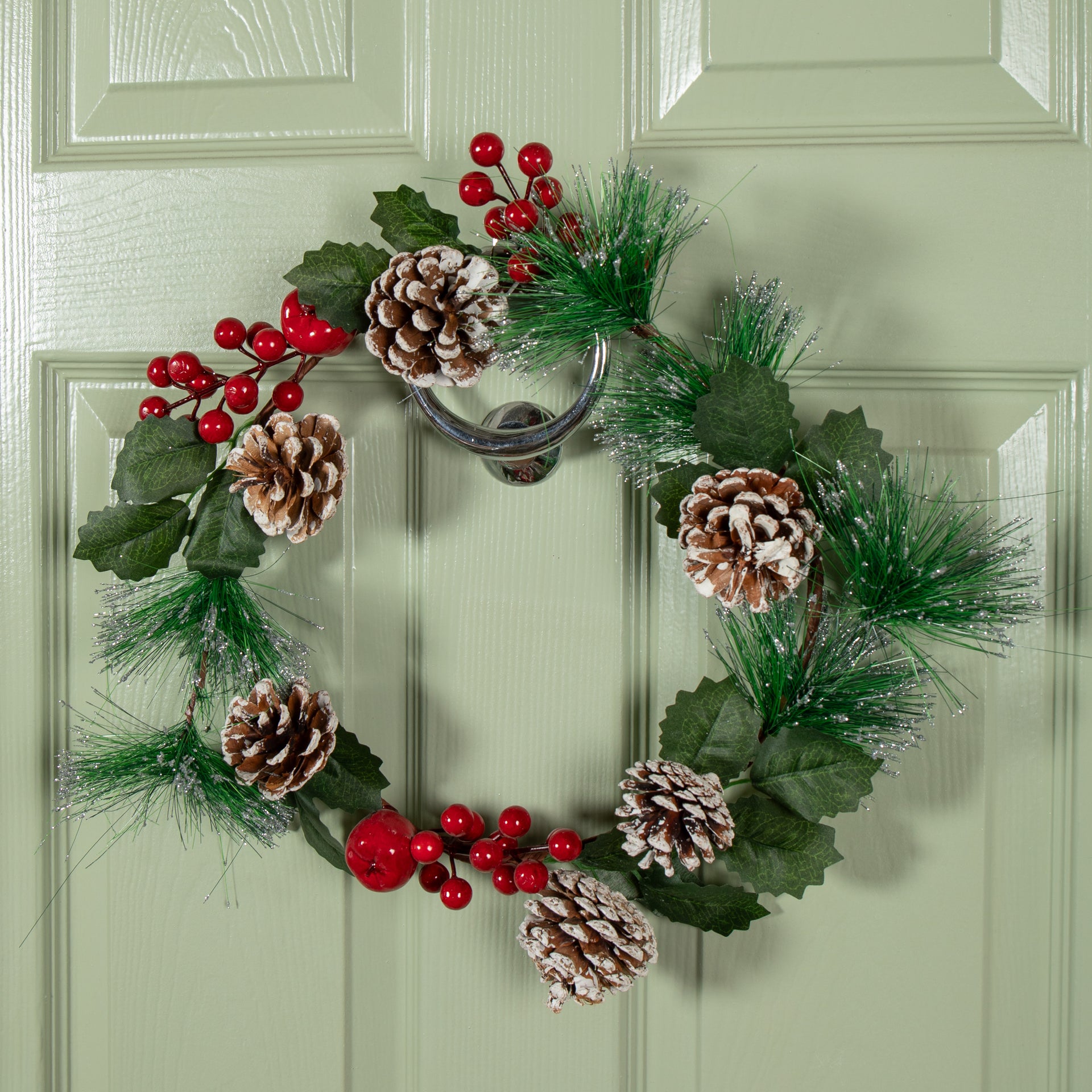 45cm Hanging Christmas Wreath with Red Berries and Frosted Pinecones