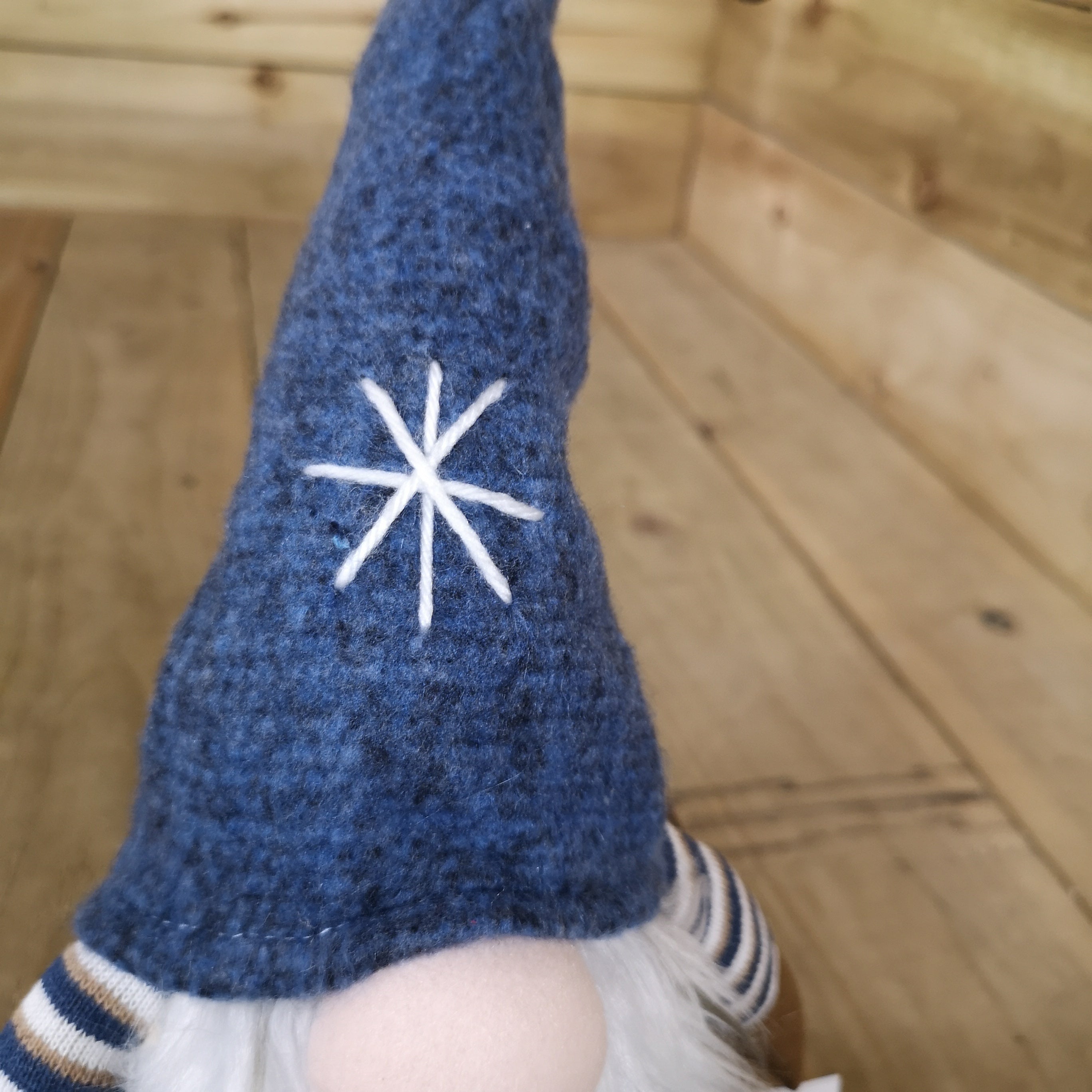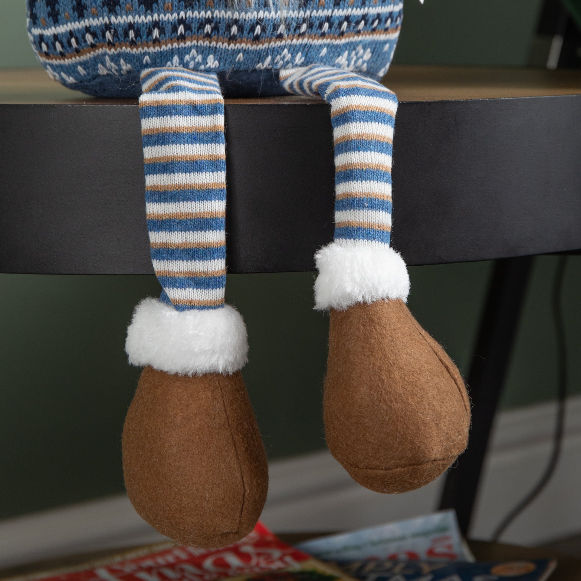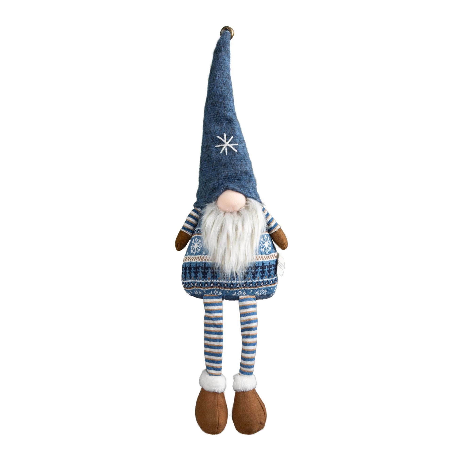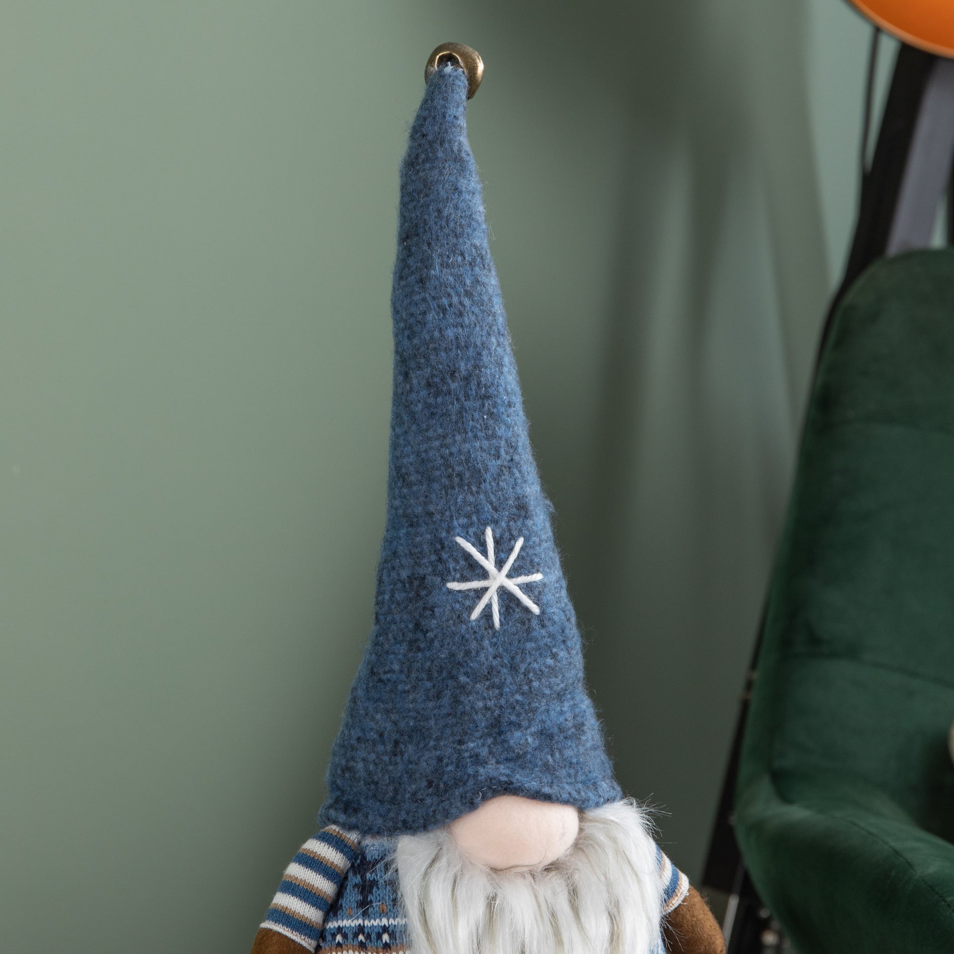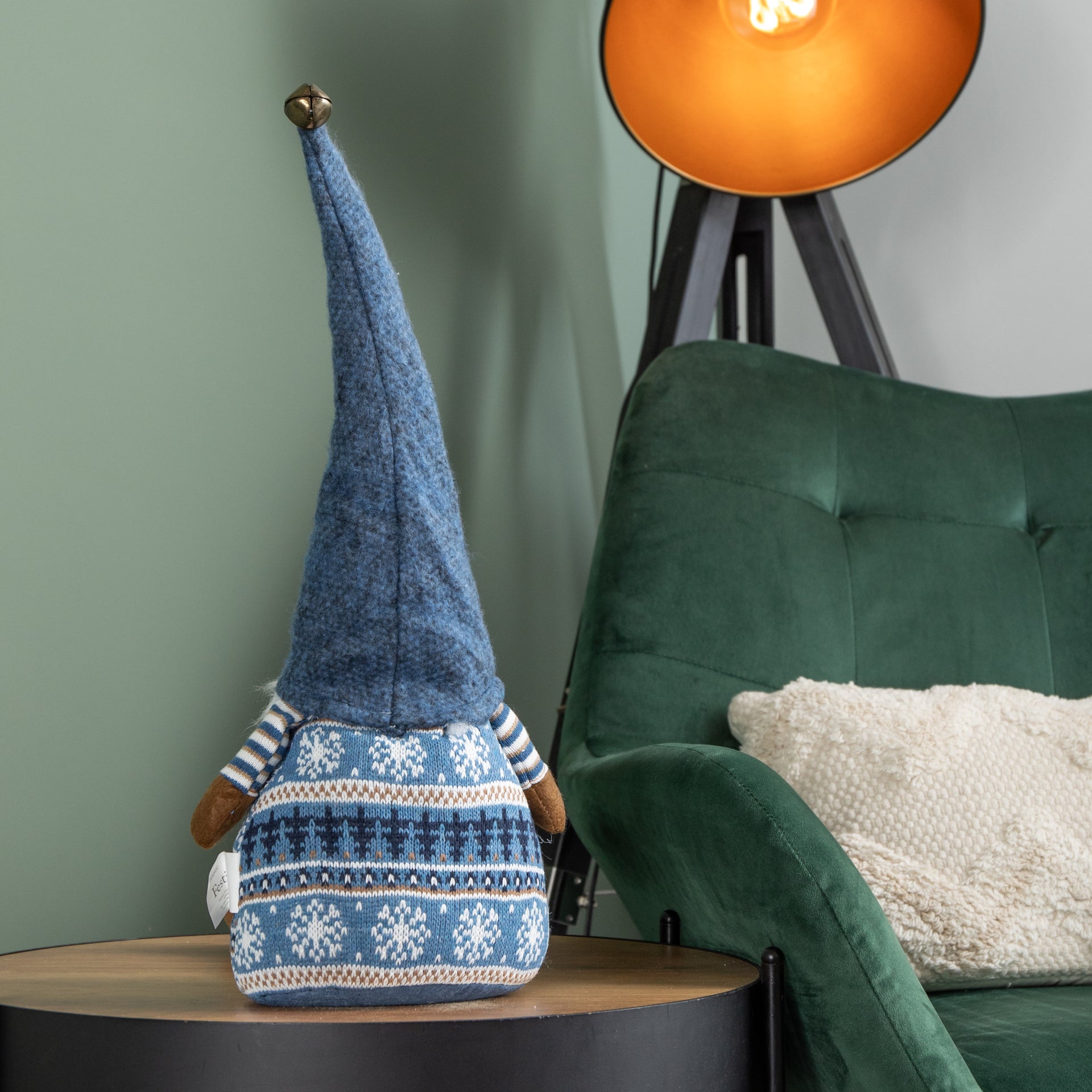 This charming gonk features a blue patterned body, complete with striped dangly legs, brown gloves, and brown boots, creating a beautifully coordinated winter-themed design. Perched in a sitting position, the decoration measures 48cm tall, extending to approximately 68cm when including its full length hanging legs. Its pointed Nordic hat, finished with a bell at the tip, completes the traditional Christmas gnome look, bringing character and charm to any room.
