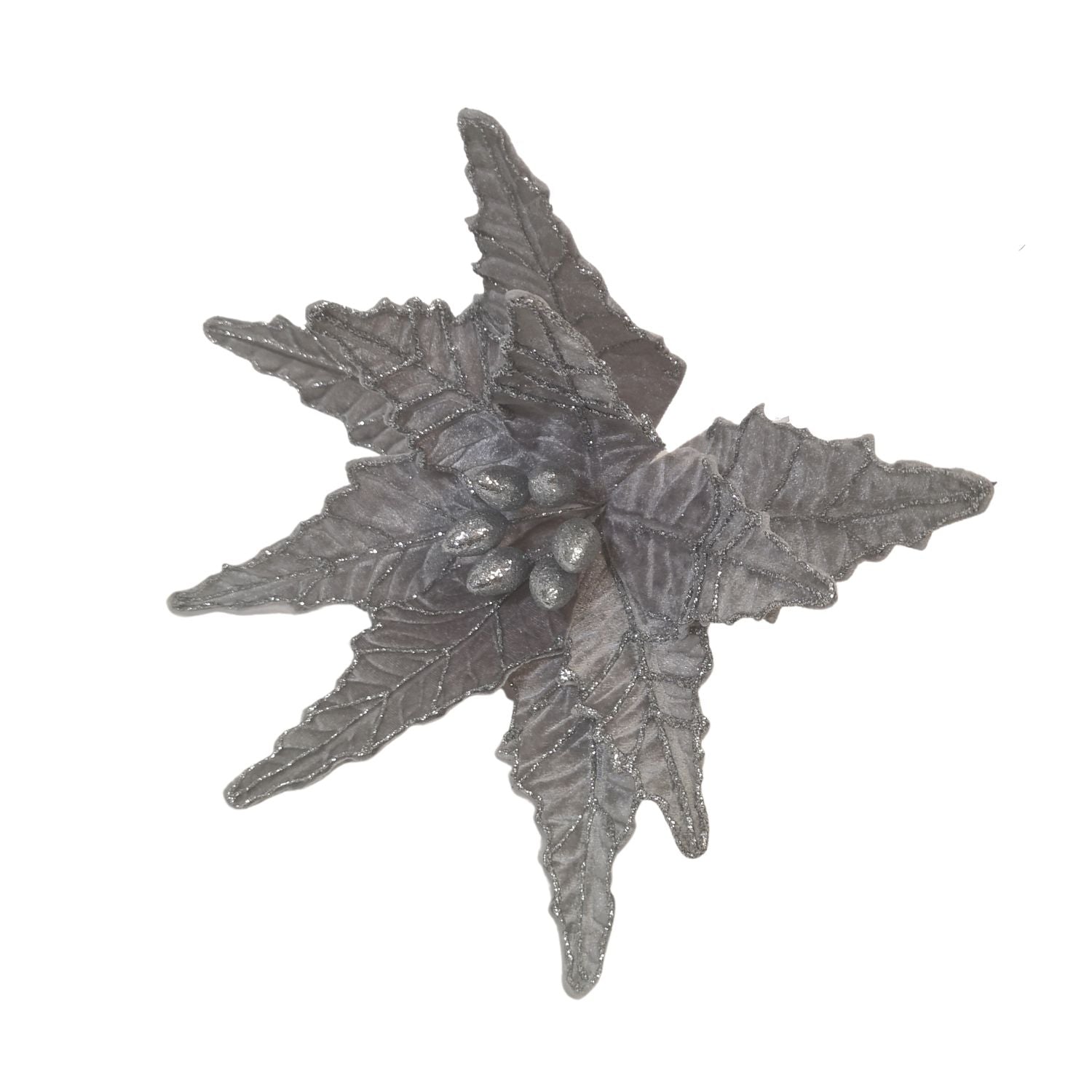 - 50cm Silver Velvet Poinsettia Stem with Glitter Christmas Decoration