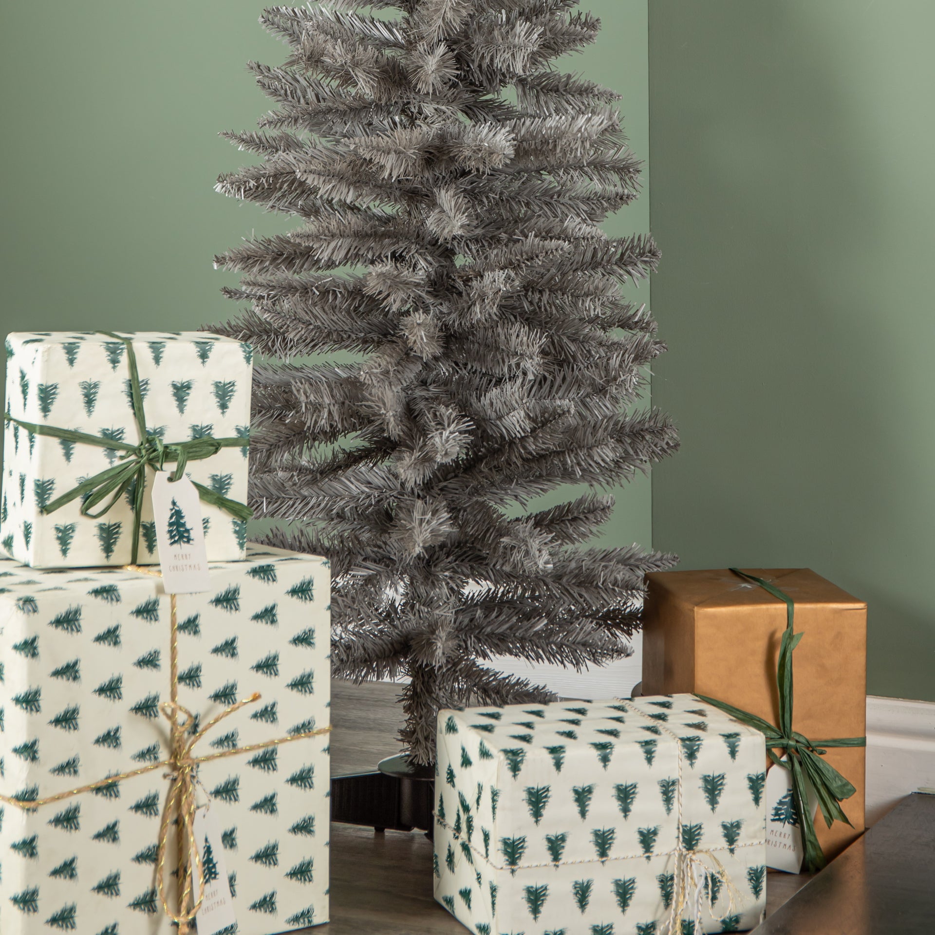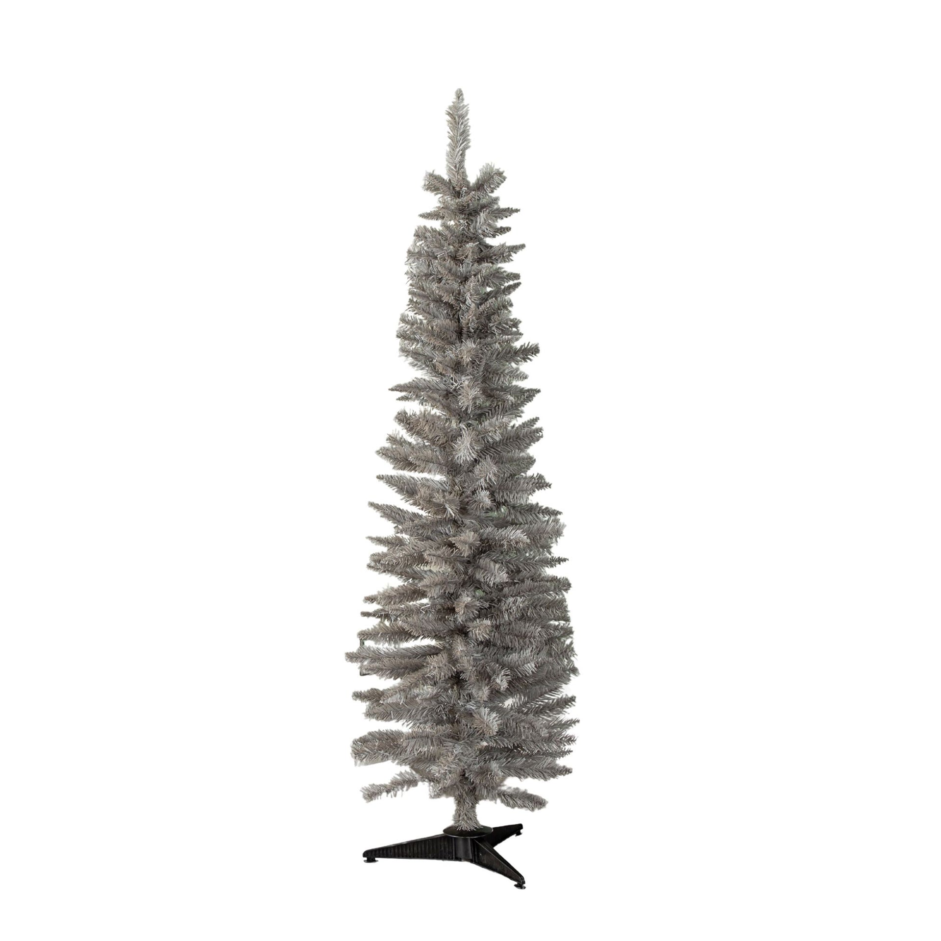 Measuring 5ft (1.5m) in height with a base diameter of approximately 45cm, this pencil pine tree offers style and practicality. Its contemporary grey colouring adds a modern twist to traditional, festive decor. The grey pencil pine tree features a slim pencil shape, making it ideal for narrow corners or hallways, while still providing a full appearance with approximately 236 tips. The tips are wrapped, giving the tree a neat and tidy look without the need for extra shaping or fuss.