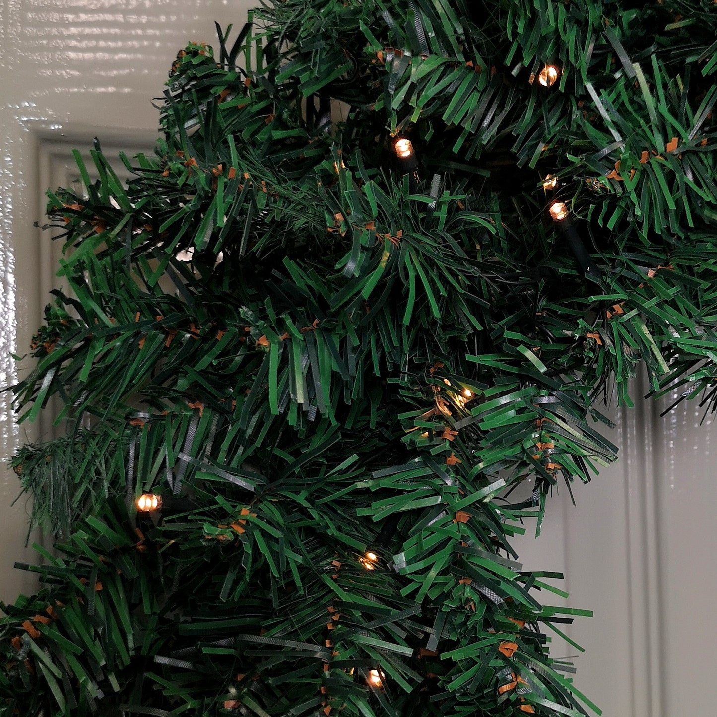 Great wreath sturdy well covered in greenery? lights well proportioned and battery compartment has a good cover for our doors arrived quickly would recommend as a purchase