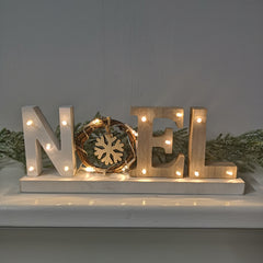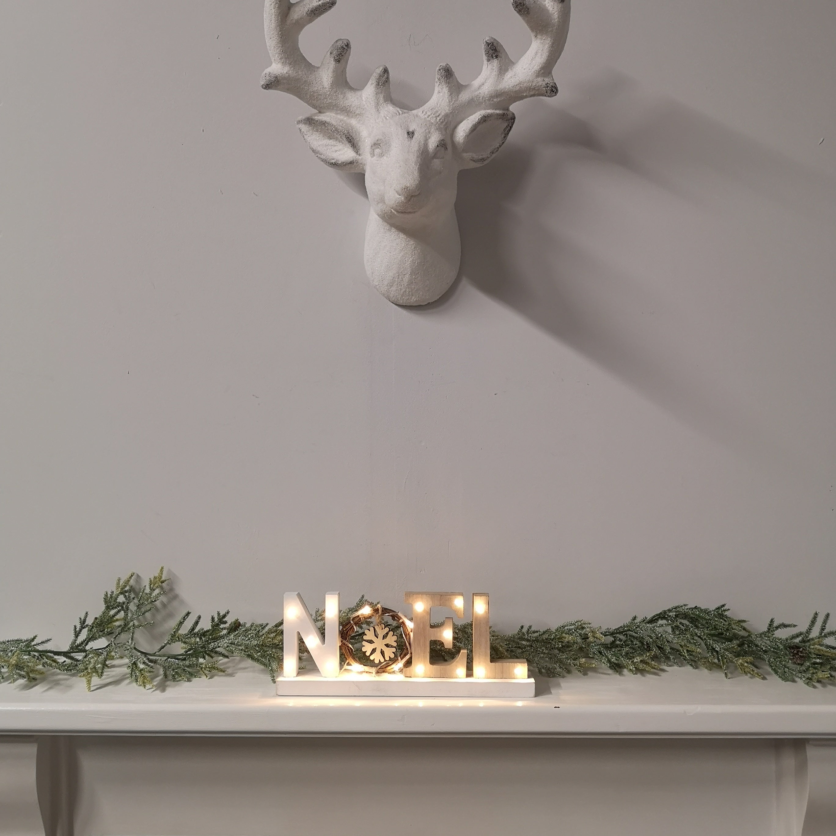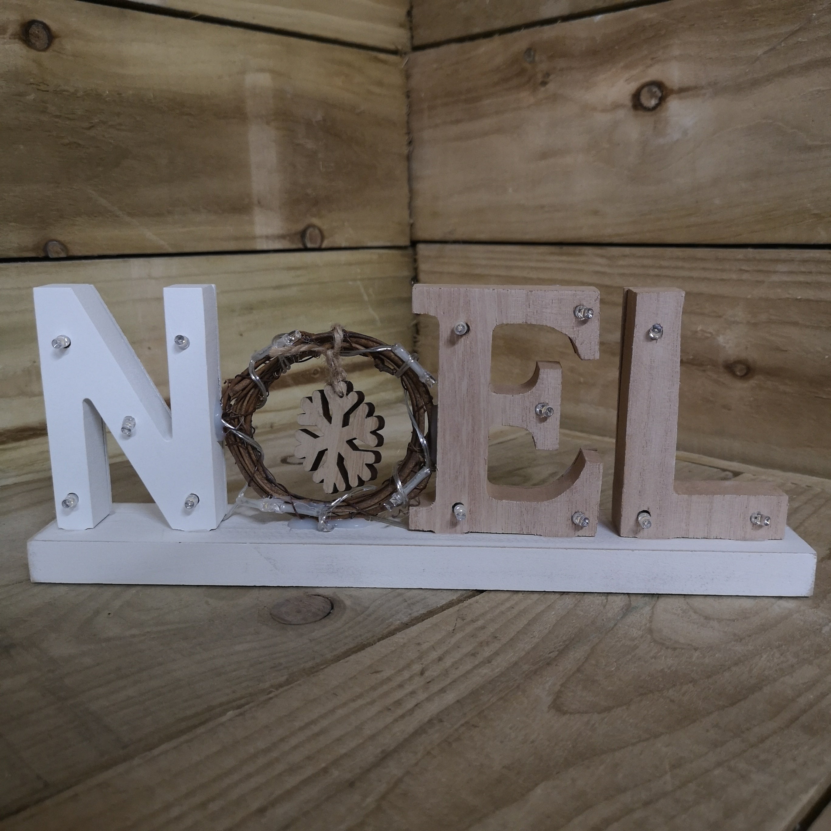 Featuring 8 warm white LEDs that softly illuminate the Noel lettering, creating a gentle, inviting glow perfect for mantelpieces, shelves, sideboards, or window displays. One of the letters is adorned with a dangling snowflake, adding a playful and enchanting movement that enhances the decorations seasonal charm. Mounted on a sturdy wooden stand, this delightful sign is made for indoor use only and is battery operated, requiring 2 x AAA batteries (not included).