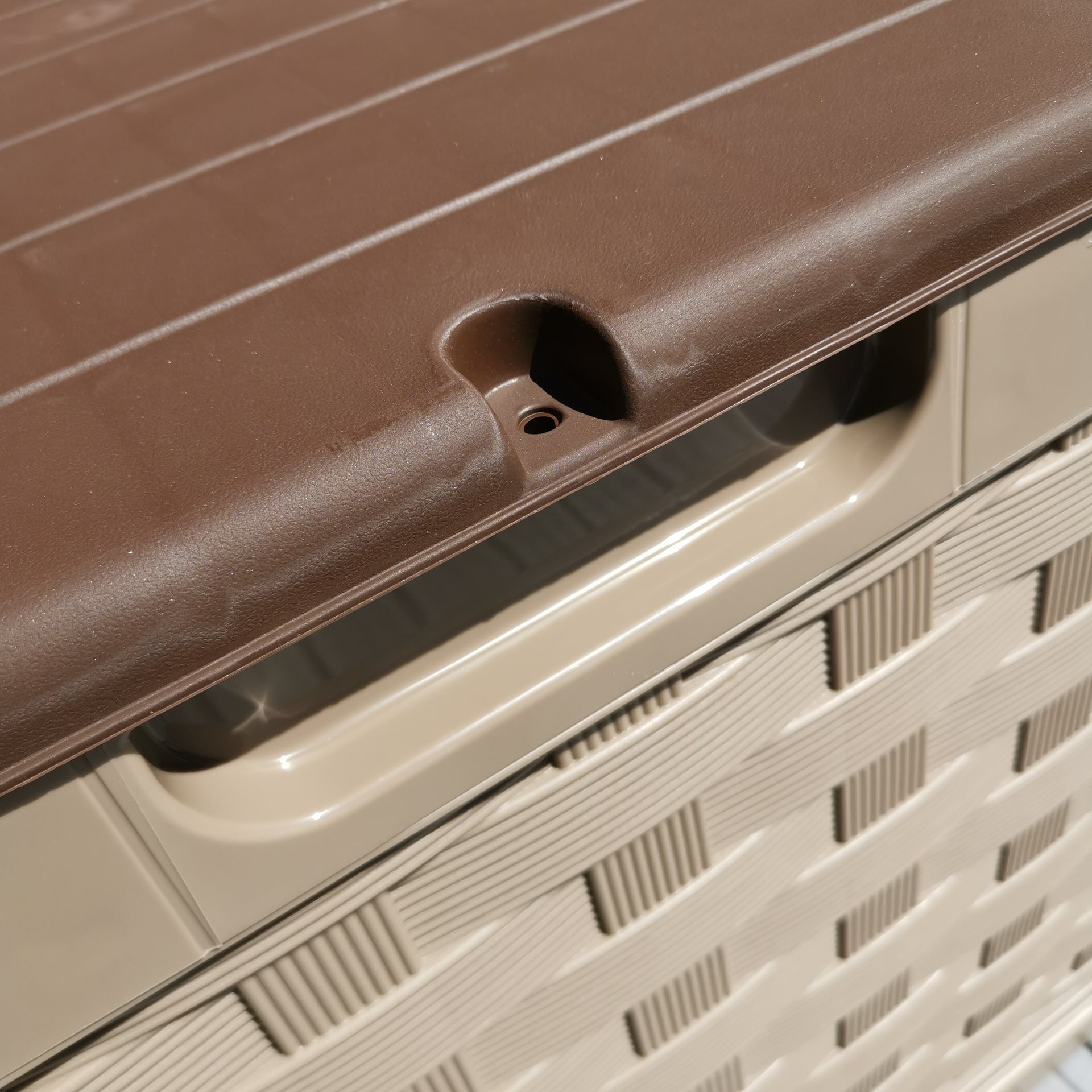 Factory Seconds: 335 Litre Rattan Style Garden Cushion Storage Box with Sit on Lid – Dark Brown