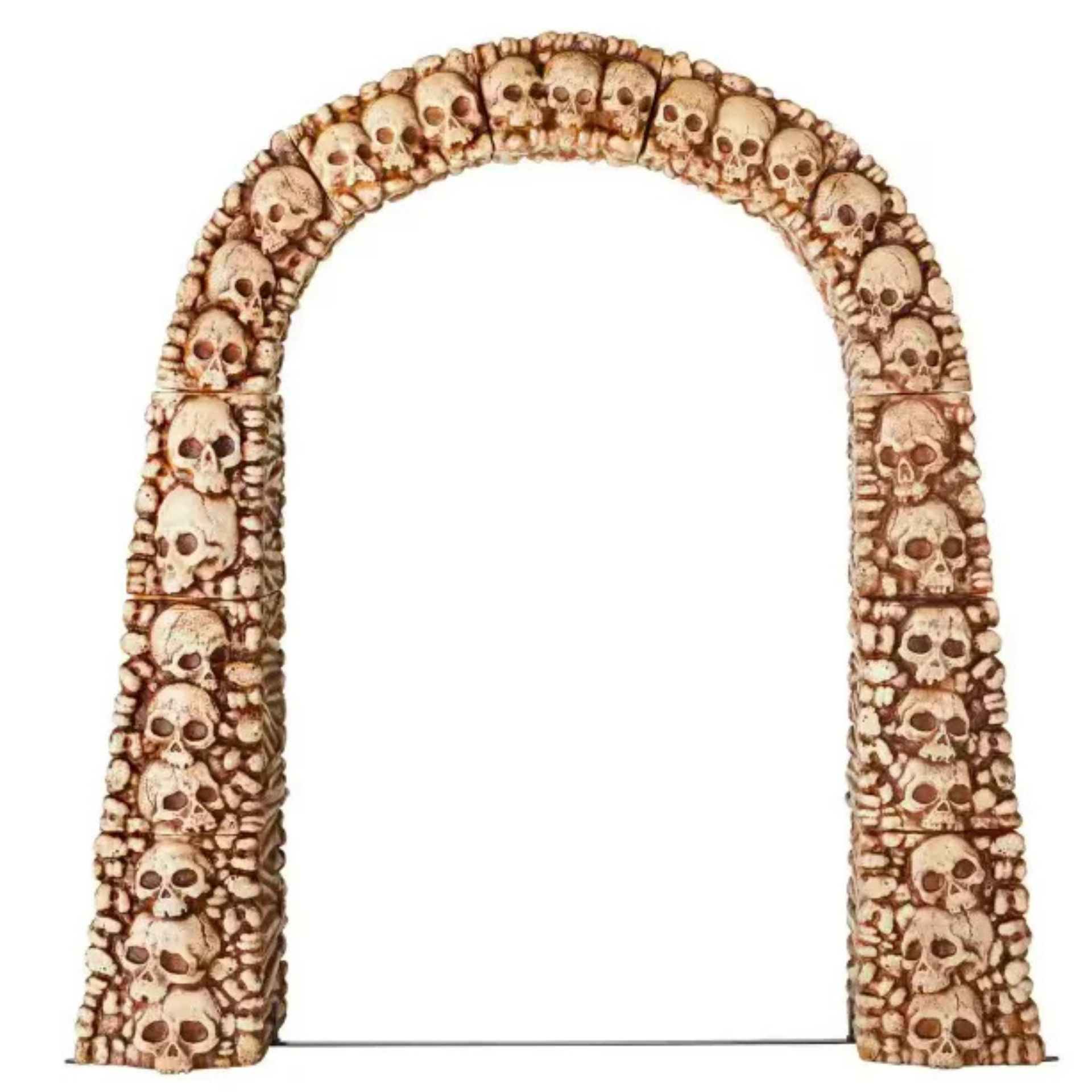 The archway is adorned with a detailed, chilling design featuring skulls at the top and skeletal bones wrapping around the structure. This classic Halloween motif adds a gothic and creepy touch to your decor, making it the perfect entrance for any spooky event. This archway sets the perfect Halloween vibe, creating a foreboding atmosphere as it welcomes guests into your haunted world. The skulls perched on the arch and the bones that lines the stricture creating a chilling entrance to any Halloween themed display.
