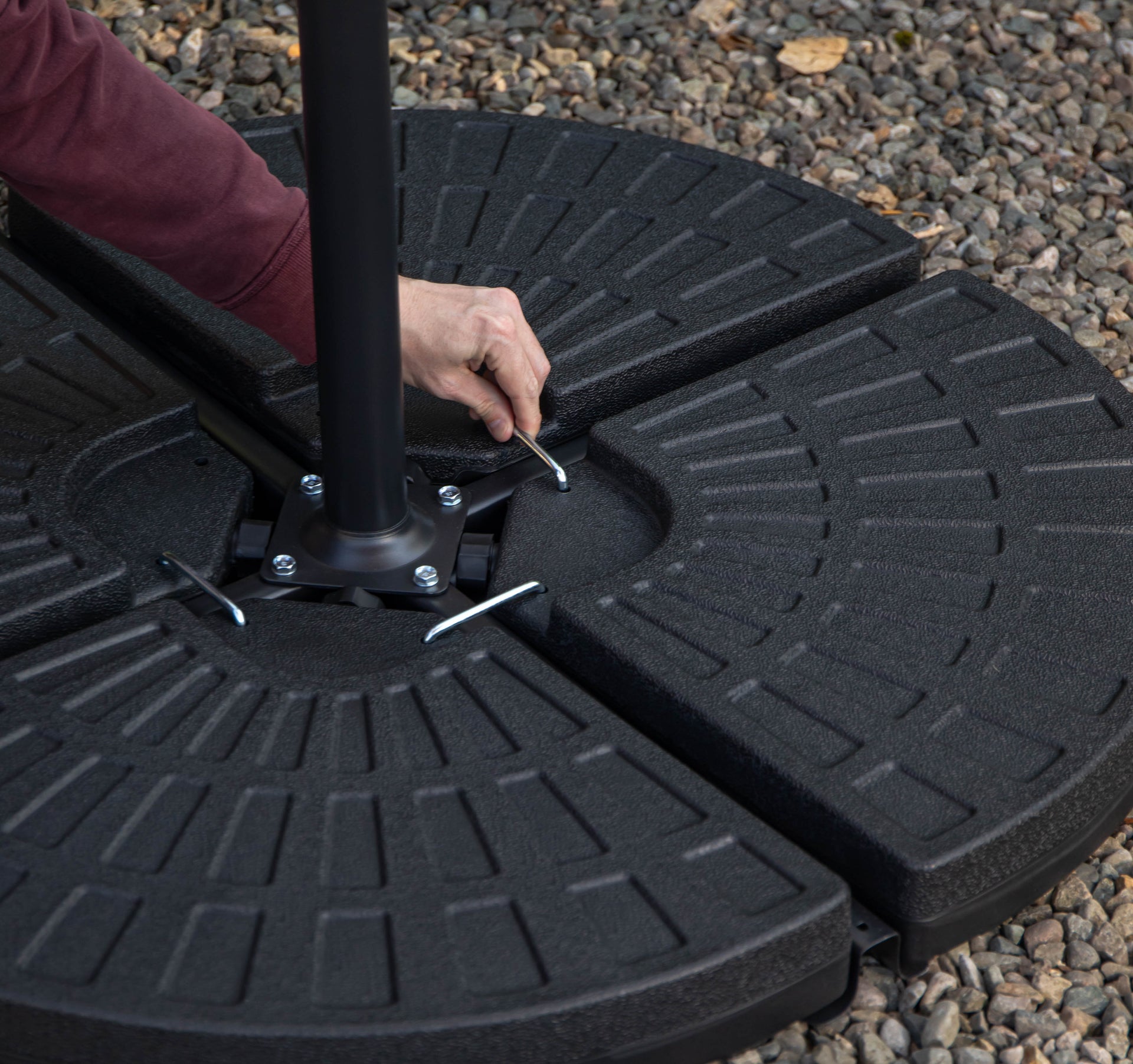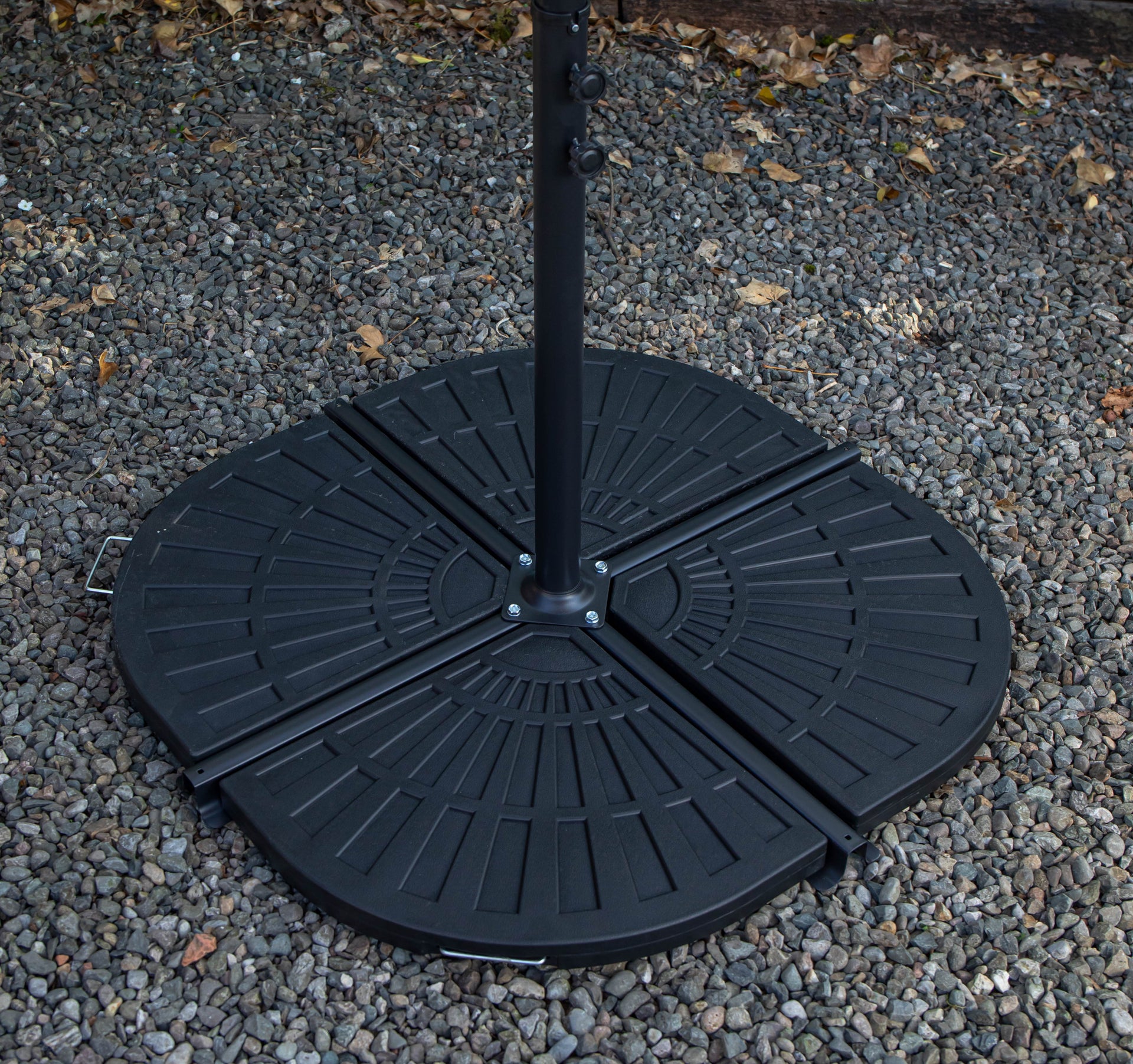 Enjoy stylish shade day and night with this elegant black banana parasol, complete with base weights for added stability. Featuring a generous 3m canopy, it provides ample coverage to keep you cool, comfortable, and protected from the sun in your outdoor space. Designed with both function and sophistication in mind, this garden parasol boasts a sleek, modern look that adds a refined touch to any patio or garden setting. As the sun sets, the parasol comes to life with 24 white LED lights integrated into the canopy ribs, creating a warm and inviting ambience for evening gatherings. The crank handle ensures smooth opening and closing, while each base weight can be filled with sand or water for secure positioning during use.