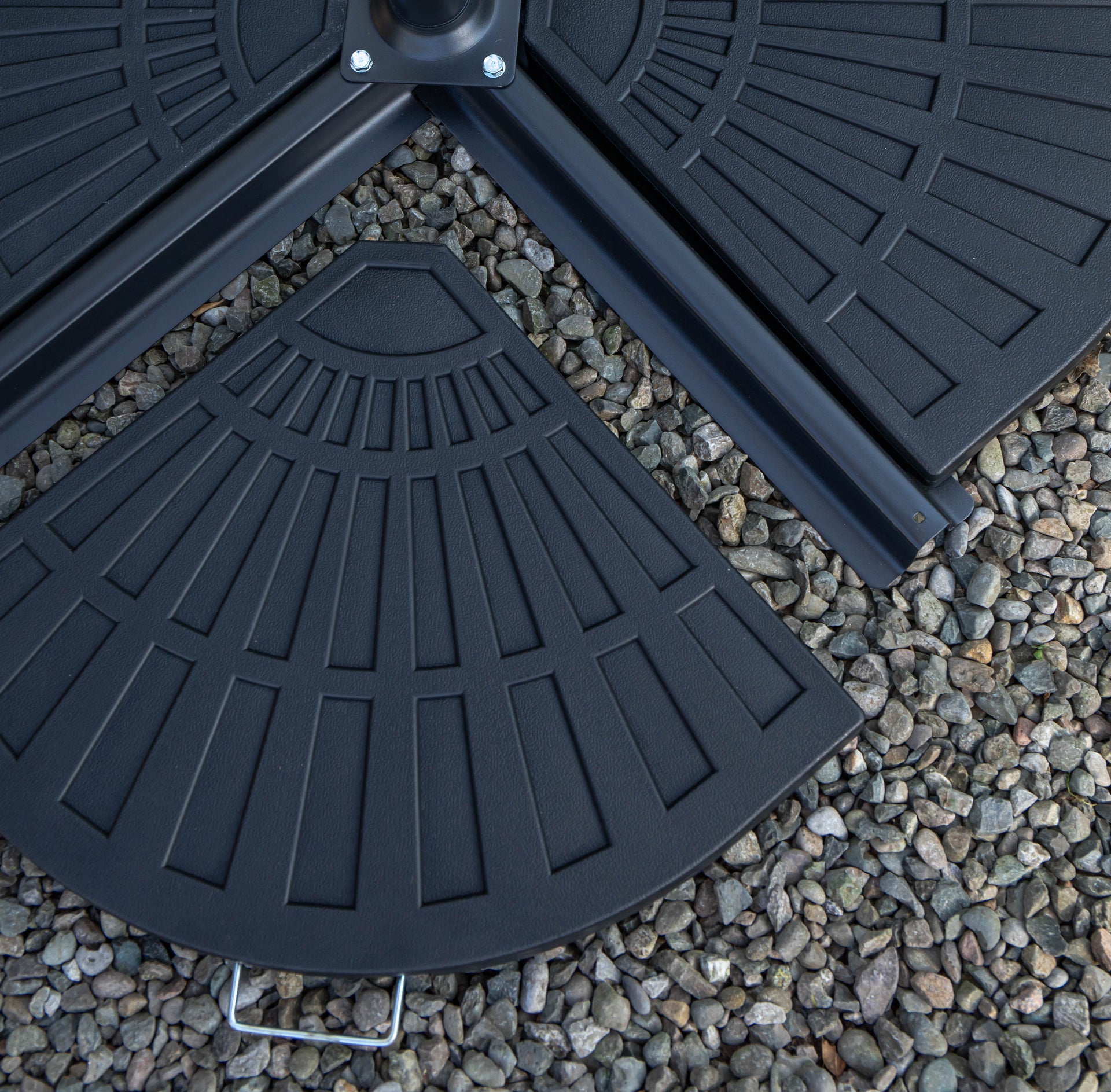 The set includes a black, round tempered glass top table with 4 multi-position chairs, black banana parasol and parasol base weights. Having a black steel set will blend seamlessly with its surroundings. It adds sophistication and a sleek, modern touch to your patio or garden. The frame of the table and chairs are made from steel and have been finished with a powder coating for added strength and durability. The chairs have a textilene backing and they can easily be folded away when not in use for easy and convenient storage. Choose from various positions to recline by adjusting the seat handles to sit back and unwind.