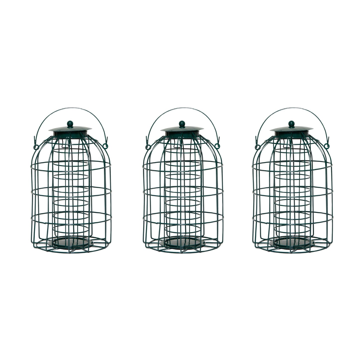A pack of 3 bird fat ball feeders with squirrel guards. Create a tranquil paradise and attract a variety of wild birds into your garden this year with this 3 pack of fat ball feeder cages. Birds spend most of their day foraging for food to meet their needs and their nestling needs. Bird feeders are an easy food source giving them a stable source of nutrition. Having a reliable source of food and a safe place to eat is especially important at times of the year when food is harder to come by when competition is high. This bird feeder is perfect for holding suet fat balls, kitchen leftovers and even fruits. Made with a powder coated metal mesh construction with a guard to deter squirrels and to allow the birds safely and happily feed. Simply fill the feeder with your chosen feed and hang on a suitable branch high enough away from predators or hang on a bird feeding station with the hanging loop. Bird feeders offer a fun and entertaining way to observe birds up close and connect with nature. Product Dimensions Height: 27cm Diameter: 16cm